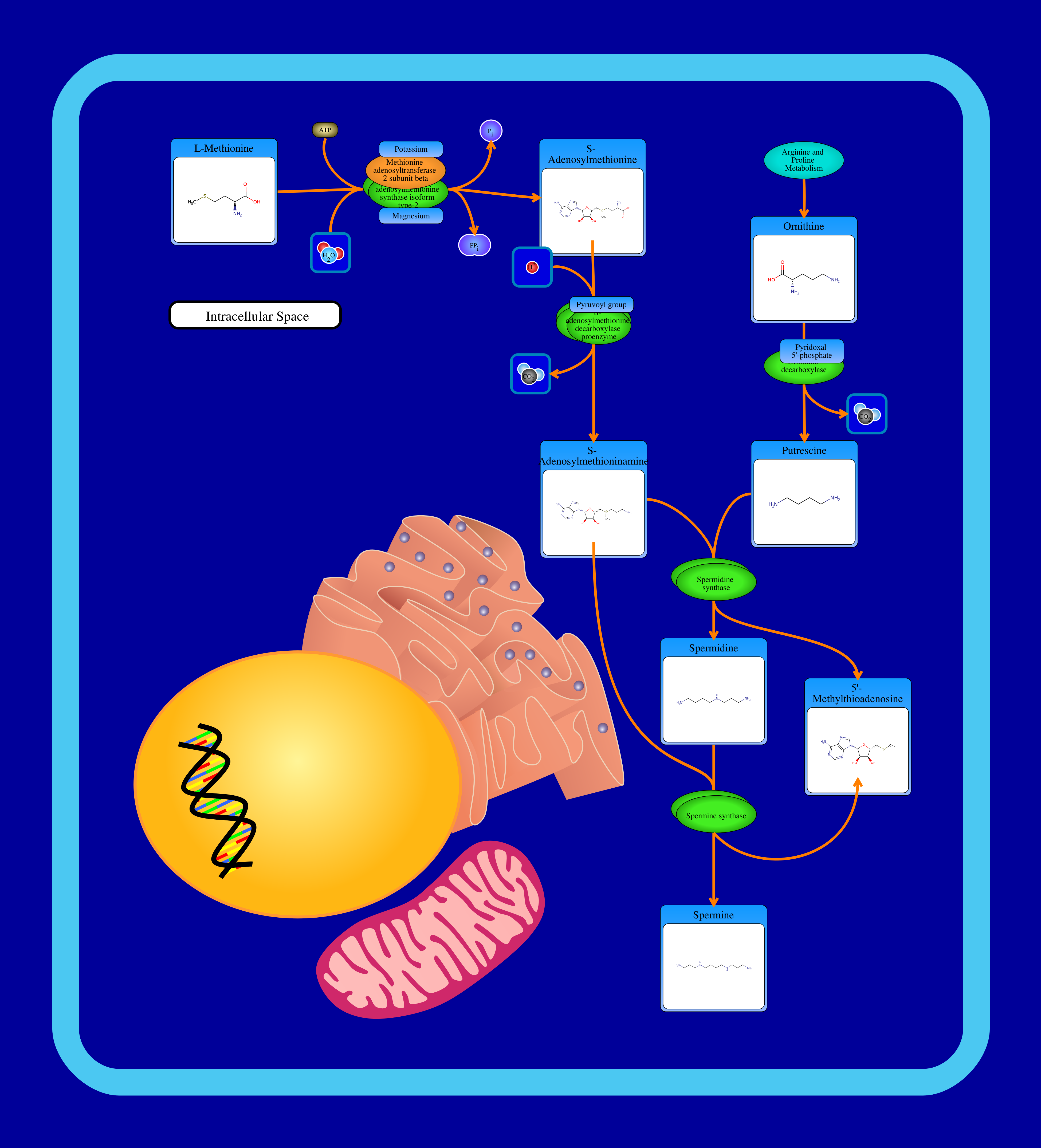 The Spermidine and Spermine Biosynthesis pathway highlights the creation of these cruicial polyamines. Spermidine and spermine are produced in many tissues, as they are involved in the regulation of genetic processes from DNA synthesis to cell migration, proliferation, differentiation and apoptosis. These positiviely charged amines interact with negatively charged phosphates in nucleic acids to exert their regulatory effects on cellular processes. Spermidine originates from the action of spermidine synthase, which converts the methionine derivative S-adenosylmethionine and the ornithine derivative putrescine into spermidine 5'-methylthioadenosine. Spermidine is subsequently processed into spermine by spermine synthase in the presence of the aminopropyl donor, S-adenosylmethioninamine.