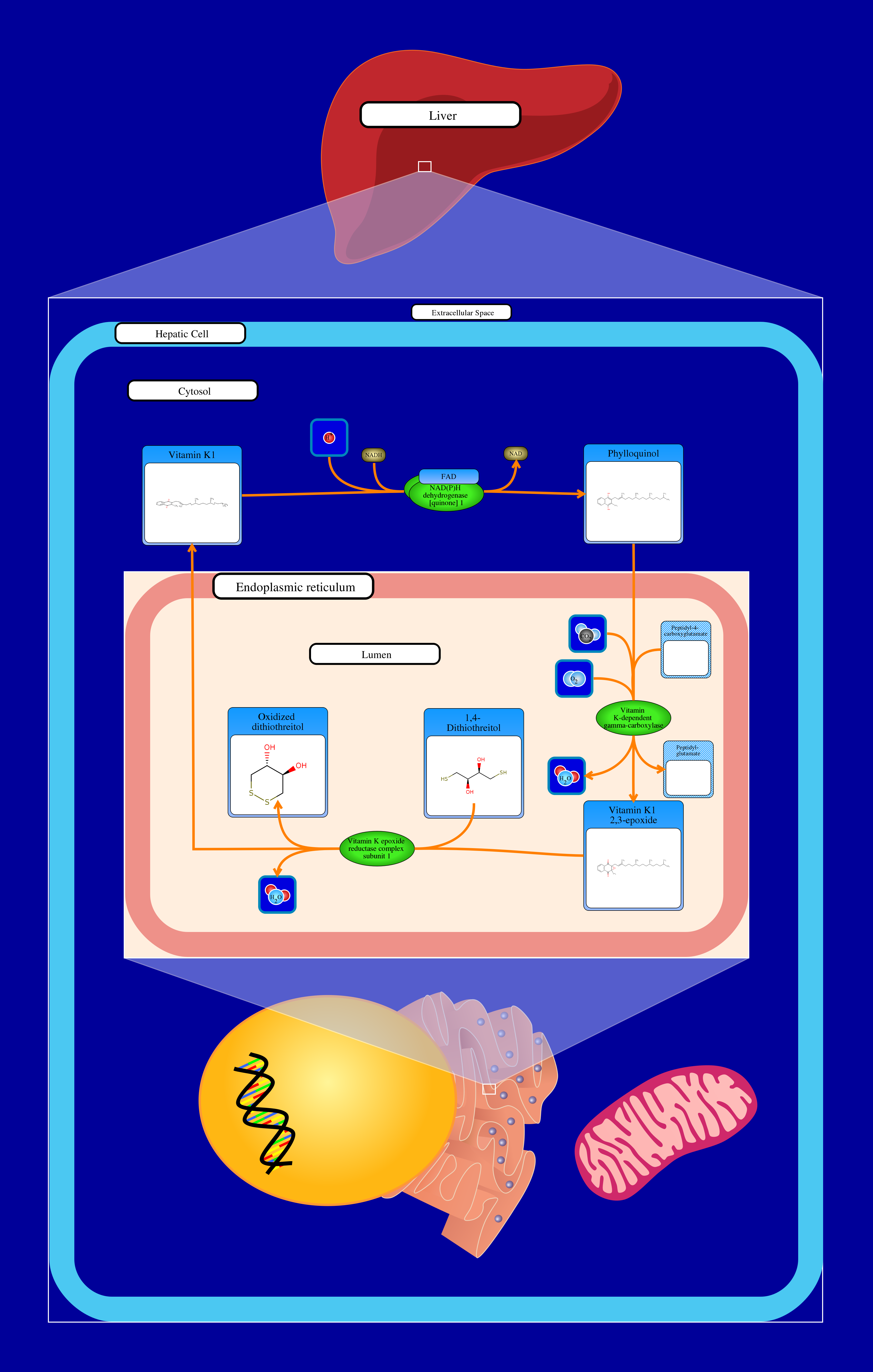Vitamin K describes a group of lipophilic, hydrophobic vitamins that exist naturally in two forms (and synthetically in three others): vitamin K1, which is found in plants, and vitamin K2, which is synthesized by bacteria. Vitamin K is an important dietary component because it is necessary as a cofacter in the activation of vitamin K dependent proteins. Metabolism of vitamin K occurs mainly in the liver. In the first step, vitamin K is reduced to its quinone form by a quinone reductase such as NAD(P)H dehydrogenase. Reduced vitamin K is the form required to convert vitamin K dependent protein precursors to their active states. It acts as a cofactor to the integral membrane enzyme vitamin K-dependent gamma-carboxylase (along with water and carbon dioxide as co-substrates), which carboxylates glutamyl residues to gamma-carboxy-glutamic acid residues on certain proteins, activating them. Each converted glutamyl residue produces a molecule of vitamin K epoxide, and certain proteins may have more than one residue requiring carboxylation. To complete the cycle, the vitamin K epoxide is returned to vitamin K via the vitamin K epoxide reductase enzyme, also an integral membrane protein. The vitamin K dependent proteins include a number of important coagulation factors, such as prothrombin. Thus, warfarin and other coumarin drugs act as anticoagulants by blocking vitamin K epoxide reductase.