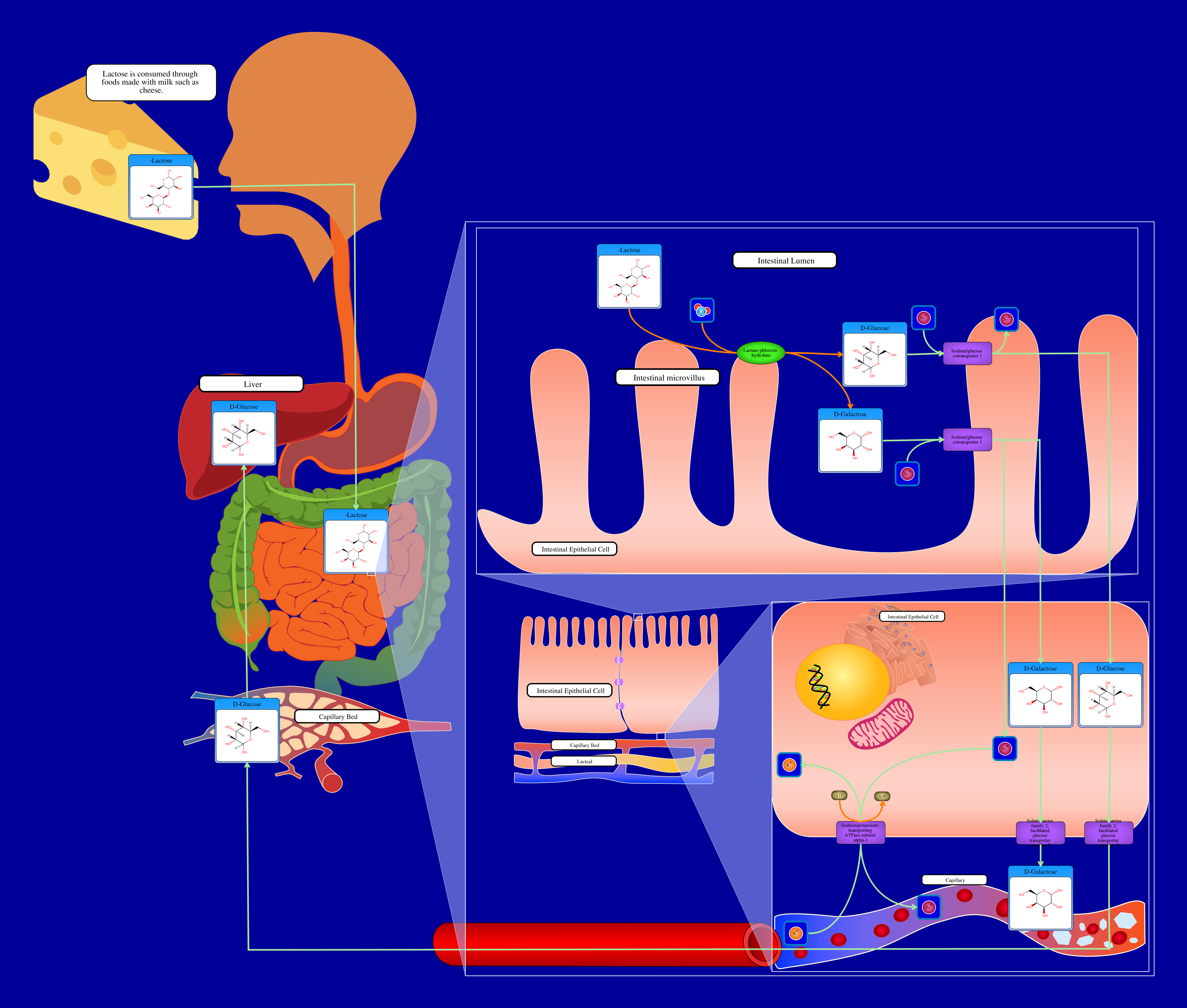 Lactose degradation (Lactose metabolism) shows the breakdown of alpha lactose into its constituent sugars, which are then utilized by the body as an energy source. Alpha-Lactose is the major sugar present in milk and the main source of energy supplied to the newborn mammalian in its mother’s milk. Lactose is also an important osmotic regulator of lactation. It is digested by the intestinal lactase, an enzyme expressed in newborns. Its activity declines following weaning. Lactase hydrolyzes alpha lactose into D-glucose and D-galactose, which are actively transported into the intestinal epithelial cells via the SGLT1 (GLUT1) cotransporter. GLUT1 actively transports glucose and galactose with 2 sodium ions. A sodium/potassium ATPase makes ATP by moving three sodium ions to the blood per two potassium ions that cross into the epithelial cell, giving the GLUT1 transporter energy to work. D-glucose and D-galactose diffuse into the blood, facilitated by the SLC2A2 transporter on the basolateral membrane on the intestinal epithelial cells. The sugars are then transported to liver.