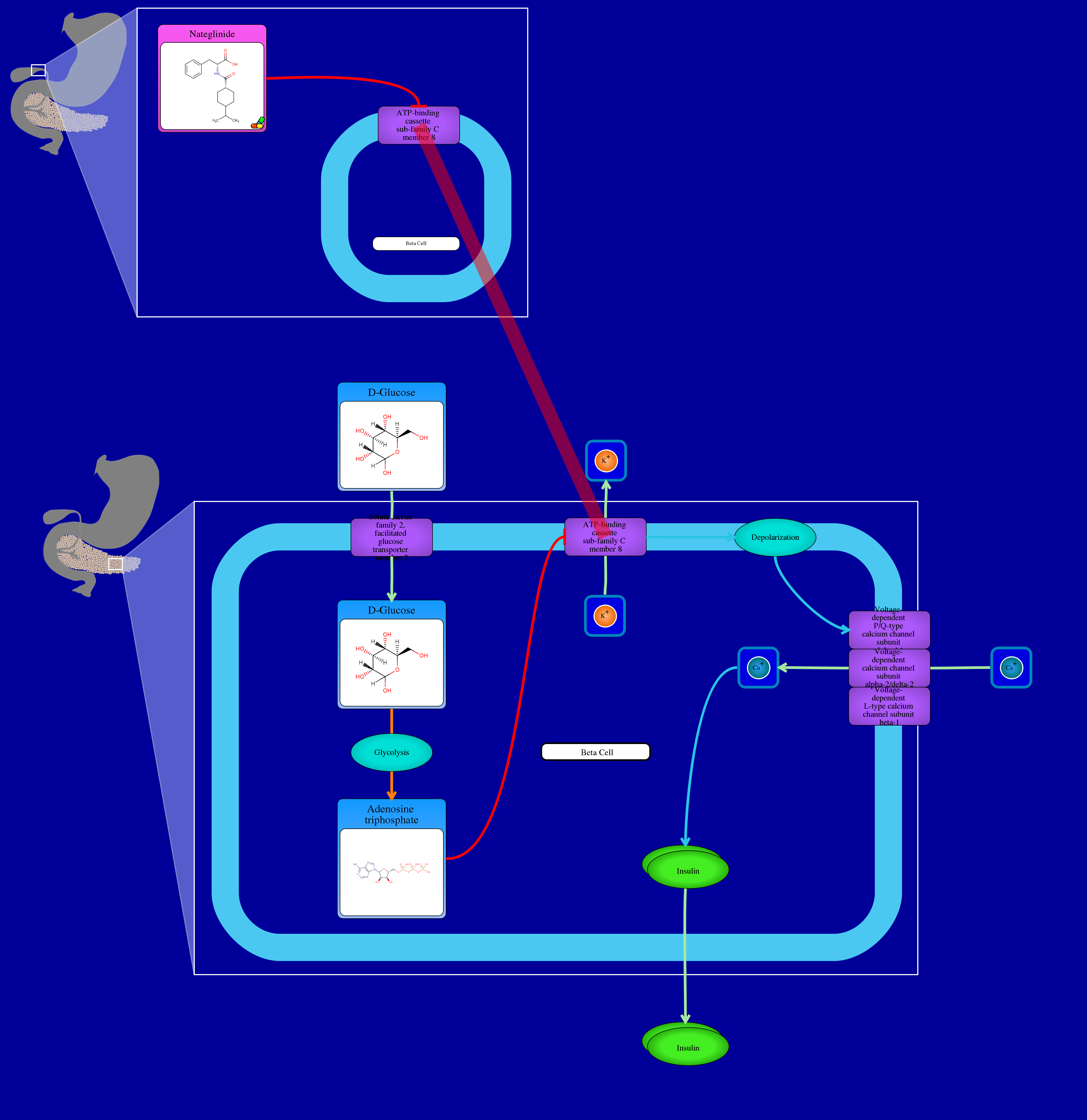 Nateglinide is a non-sulfonylurea insulin secretagogue used in the treatment of type 2 diabetes. As the name of the drug class suggests, nateglinide acts on pancreatic beta-cells to stimulate insulin secretion. Under physiological conditions, insulin secretion from beta-cells is mediated by elevated glucose concentration in the blood. Glucose enters the cell via GLUT2 (SLC2A2) transporters. Once inside the cell, glucose is metabolized to produce ATP. High concentration of ATP will inhibit ATP-dependent potassium channels (ABCC8), which depolarizes the cell. Depolarization causes opening of voltage-gated calcium channels, allowing calcium to enter cell. High intracellular calcium subsequently stimulate vesicle exocytosis and insulin secretion. Nateglinide stimulate insulin secretion in a glucose-sensitive manner by inhibiting ATP-dependent potassium channels. As a result, there tends to be a lesser likelihood of hypoglycemia with nateglinide therapy compared to sulfonylureas.