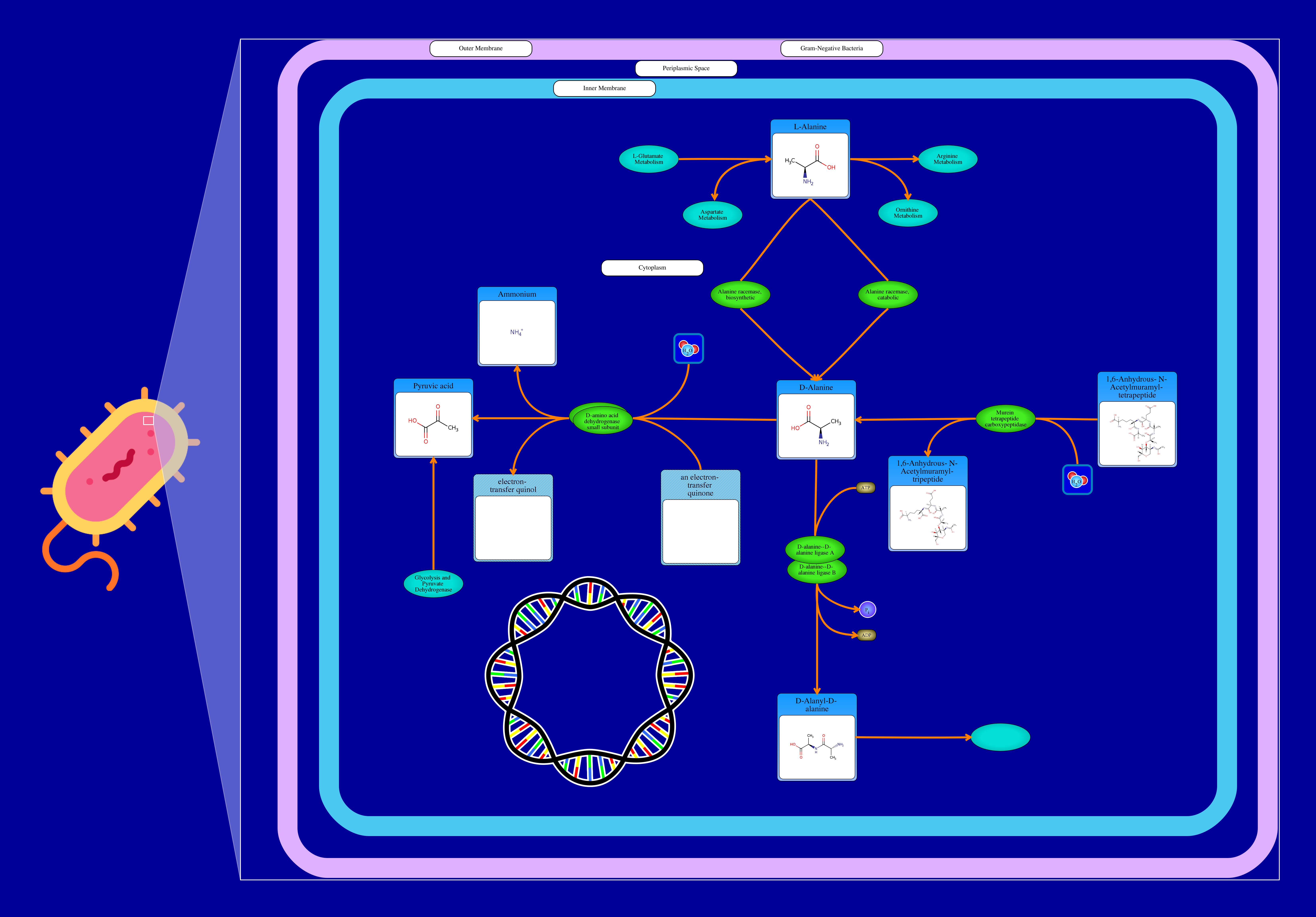 L-Alanine is an essential component of both proteins and Peptidoglycan. Peptidoglycan also contain about three molecules of D-alanine for every L-alanine, comprising of only about 10% of the total alanine synthesized flowing into peptidoglycan. (More info can be found at L-alanine metabolism pathway: PW000788 or SMP0000810) In this pathway, D-amino acid dehydrogenase degrades D-alanine to form pyruvate, pyruvate then serving as a source of carbon for central metabolism. D-alanine can be formed by either biosynthetic alanine racemase or catabolic alanine racemase. D-alanine is required for forming cell wall peptidoglycan (murein). D-alanine is metabolized by ATP driven D-alanine ligase A and B resulting in D-alanyl-D-alanine. This product is incorporated into peptidoglycan biosynthesis.