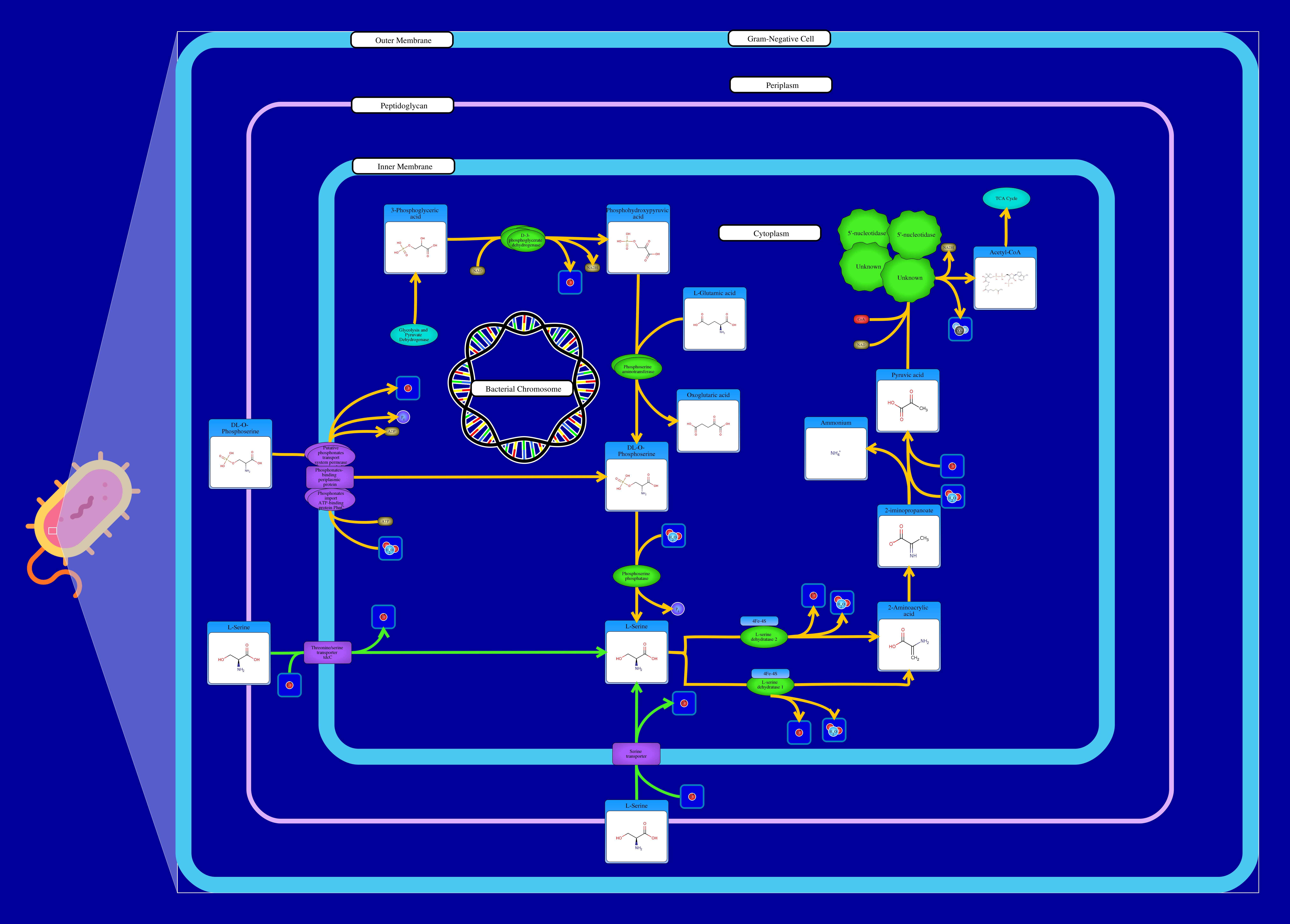 Serine biosynthesis is a major metabolic pathway in E. coli. Its end product, serine, is not only used in protein synthesis, but also as a precursor for the biosynthesis of glycine, cysteine, tryptophan, and phospholipids. In addition, it directly or indirectly serves as a source of one-carbon units for the biosynthesis of various compounds.