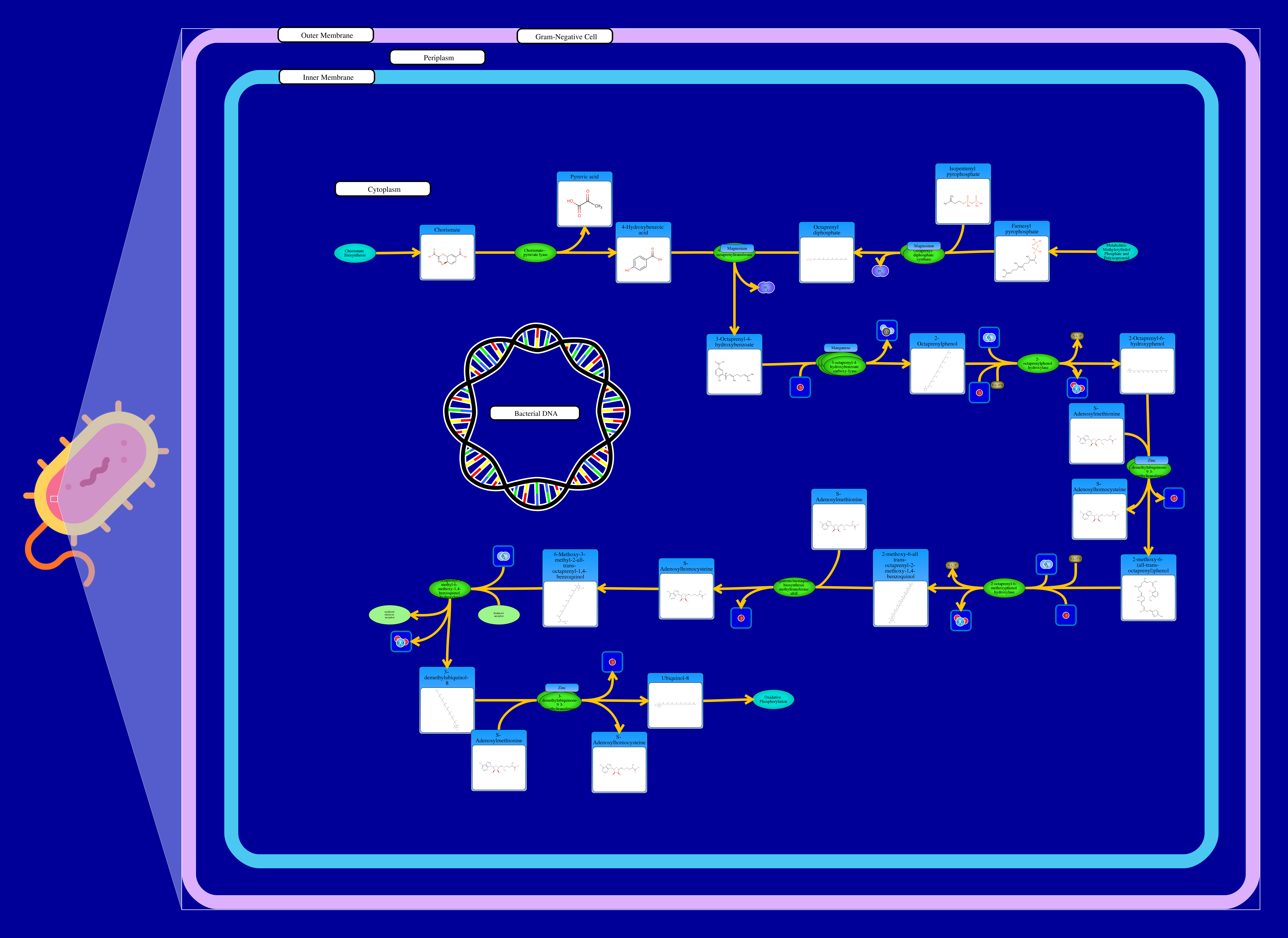The latter compound interacts with a S-adenosylmethionine through a bifunctional 2-octaprenyl-6-methoxy-1,4-benzoquinone methylase and S-adenosylmethionine:2-DMK methyltransferase resulting in a s-adenosylhomocysteine, a hydrogen ion and a 6-methoxy-3-methyl-2-all-trans-octaprenyl-1,4-benzoquinol. The 6-methoxy-3-methyl-2-all-trans-octaprenyl-1,4-benzoquinol. interacts with a reduced acceptor, an oxygen molecule through a 2-octaprenyl-3-methyl-6-methoxy-1,4-benzoquinone hydroxylase resulting in the release of a water molecule, an oxidized electron acceptor and a 3-demethylubiquinol-8. The latter compound then interacts with a S-adenosylmethionine through a bifunctional 3-demethylubiquinone-8 3-O-methyltransferase and 2-octaprenyl-6-hydroxyphenol methylase resulting in a hydrogen ion, a S-adenosylhomocysteine and a ubiquinol 8.