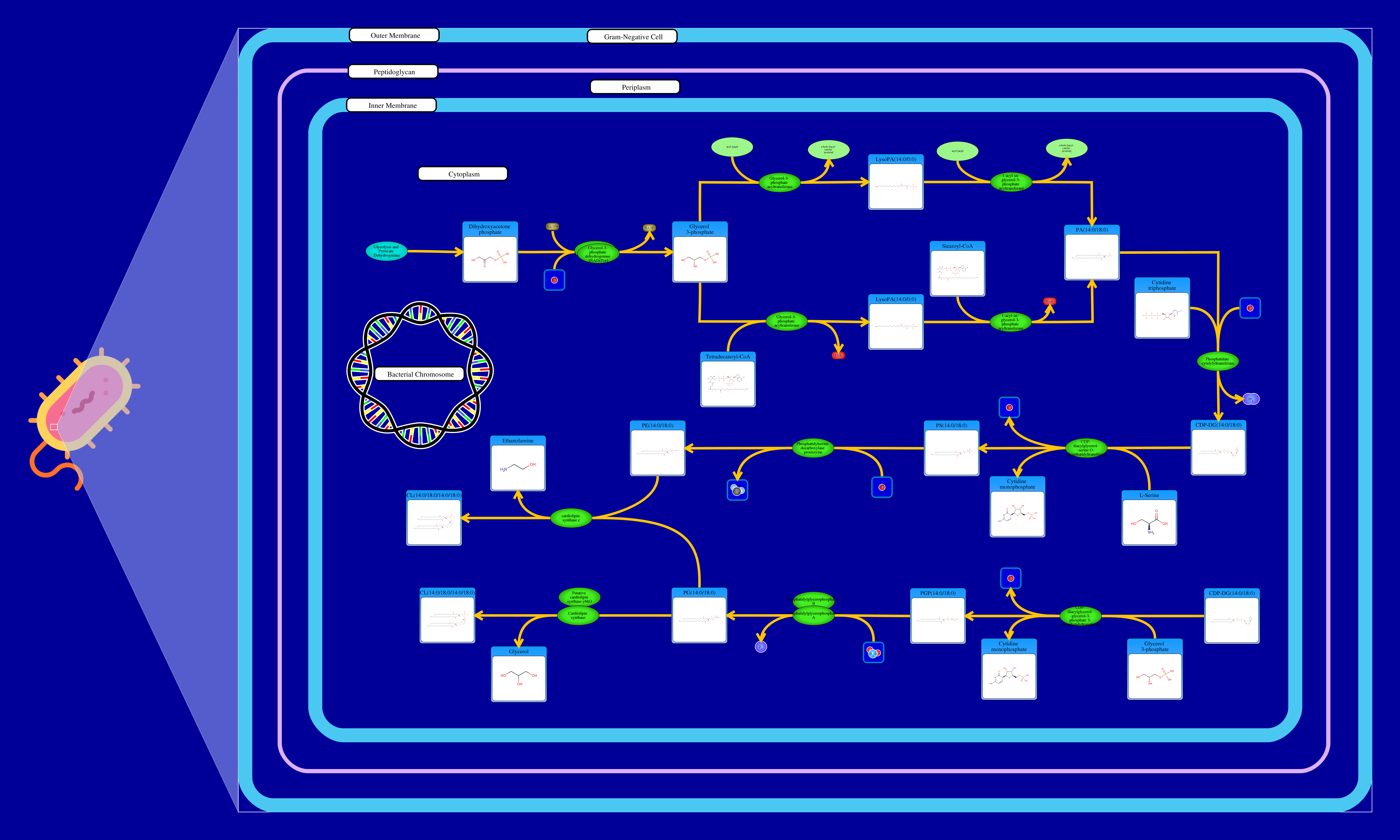 Phospholipids are membrane components in E. coli. The major phospholipids of E. coli are phosphatidylethanolamine, phosphatidylglycerol, and cardiolipin. All phospholipids contain sn-glycerol-3-phosphate esterified with fatty acids at the sn-1 and sn-2 positions. The reaction starts from a glycerone phosphate (dihydroxyacetone phosphate) produced in glycolysis. The glycerone phosphate is transformed into an sn-glycerol 3-phosphate (glycerol 3 phosphate) by NADPH-driven glycerol-3-phosphate dehydrogenase. sn-Glycerol 3-phosphate is transformed to a 1-acyl-sn-glycerol 3-phosphate (lysophosphatidic acid). This can be achieved by an sn-glycerol-3-phosphate acyltransferase that interacts either with a long-chain acyl-CoA or with an acyl-[acp]. The 1-acyl-sn-glycerol 3-phosphate is transformed into a 1,2-diacyl-sn-glycerol 3-phosphate (phosphatidic acid) through a 1-acylglycerol-3-phosphate O-acyltransferase. This compound is then converted into a CPD-diacylglycerol through a CTP phosphatidate cytididyltransferase. CPD-diacylglycerol can be transformed either into an L-1-phosphatidylserine or an L-1-phosphatidylglycerol-phosphate through a phosphatidylserine synthase or a phosphatidylglycerophosphate synthase, respectively. The L-1-phosphatidylserine transforms into L-1-phosphatidylethanolamine through a phosphatidylserine decarboxylase. On the other hand, L-1-phosphatidylglycerol-phosphate gets transformed into an L-1-phosphatidyl-glycerol through a phosphatidylglycerophosphatase. These 2 products combine to produce a cardiolipin and an ethanolamine. The L-1 phosphatidyl-glycerol can also interact with cardiolipin synthase resulting in a glycerol and a cardiolipin.