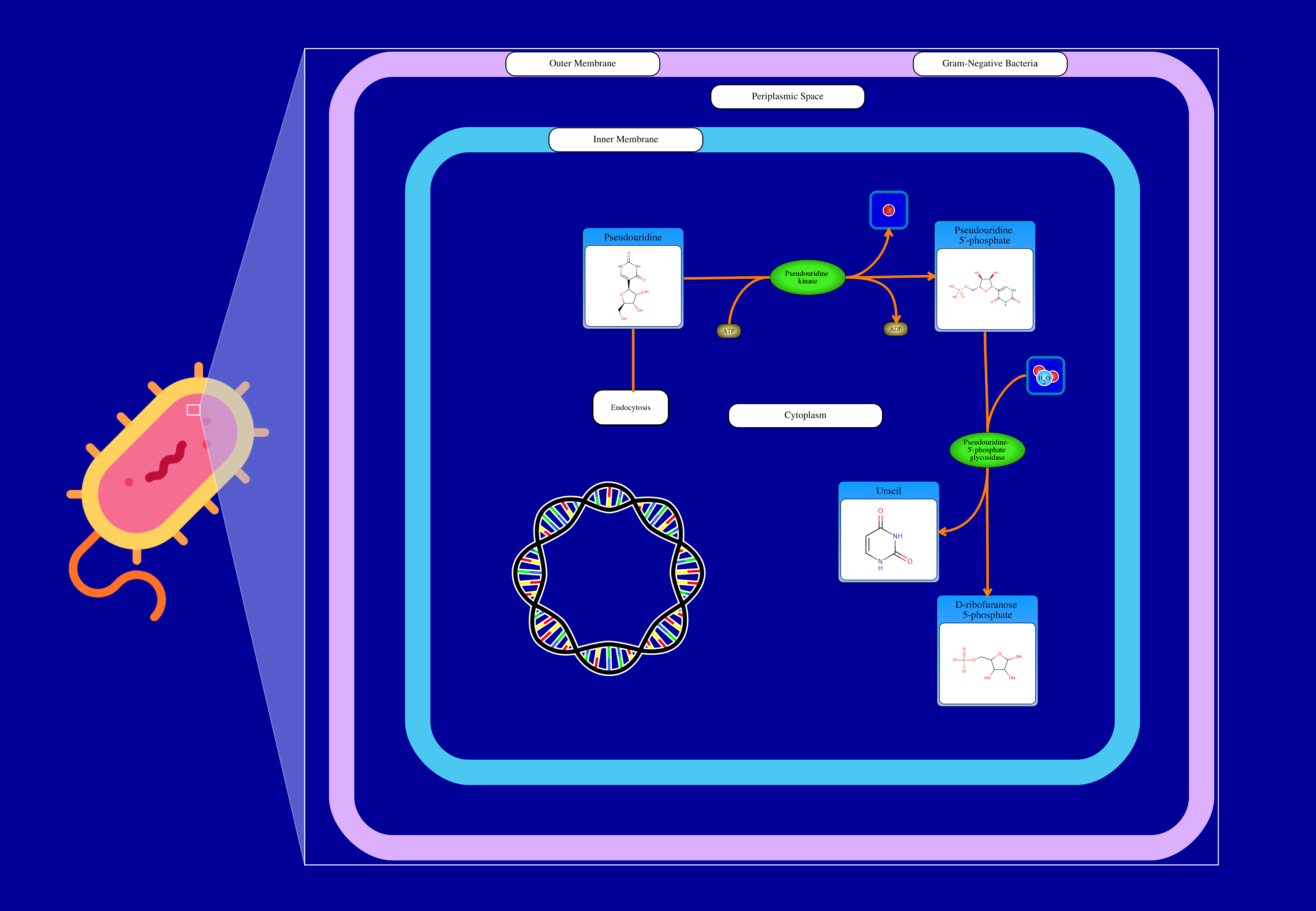 Pseudouridine is phosphorylated by interacting with atp and a psuK resulting in the release of an ADP, a hydrogen ion and a pseudouridine 5'-phosphate. The latter compound then reacts with water through a pseudouridine 5'-phosphate glycosidase resulting in the release of a uracil and D-ribofuranose 5-phosphate