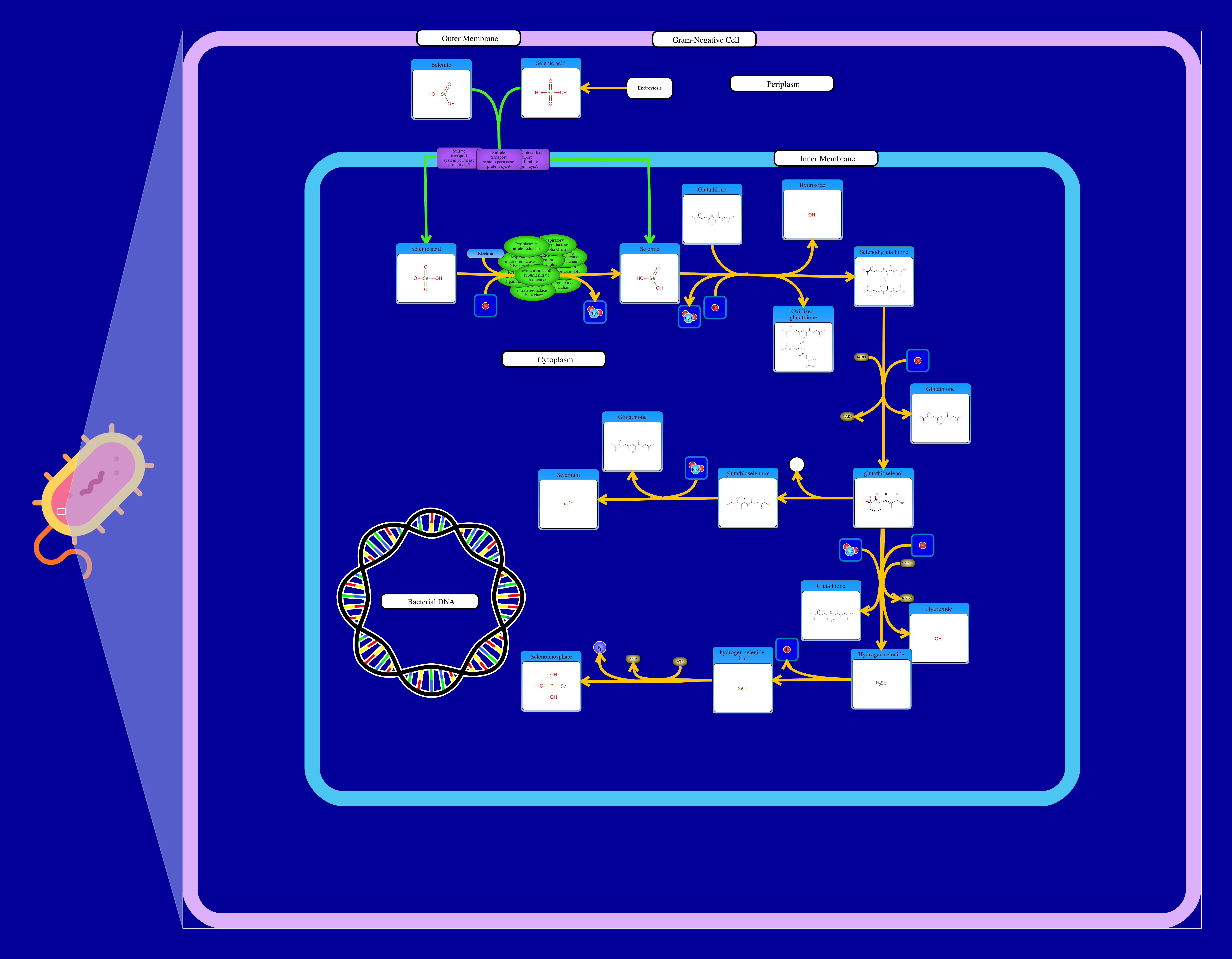 The selenium metabolism begins with the introduction of selenate and selenite to the cytosol through a sulphate permease system. Once in the cell, selenate can be reduced to selenite through nitrate reductases A and Z. Selenite then interacts with glutathione and 2 hydrogen ions resulting in the release of 2 water molecules, a hydroxide molecule, a glutathione disulfide and a selenodiglutathione. The latter compound then reacts with NADPH+H resulting in the release of a NADP, a glutathione and a glutathioselenol.