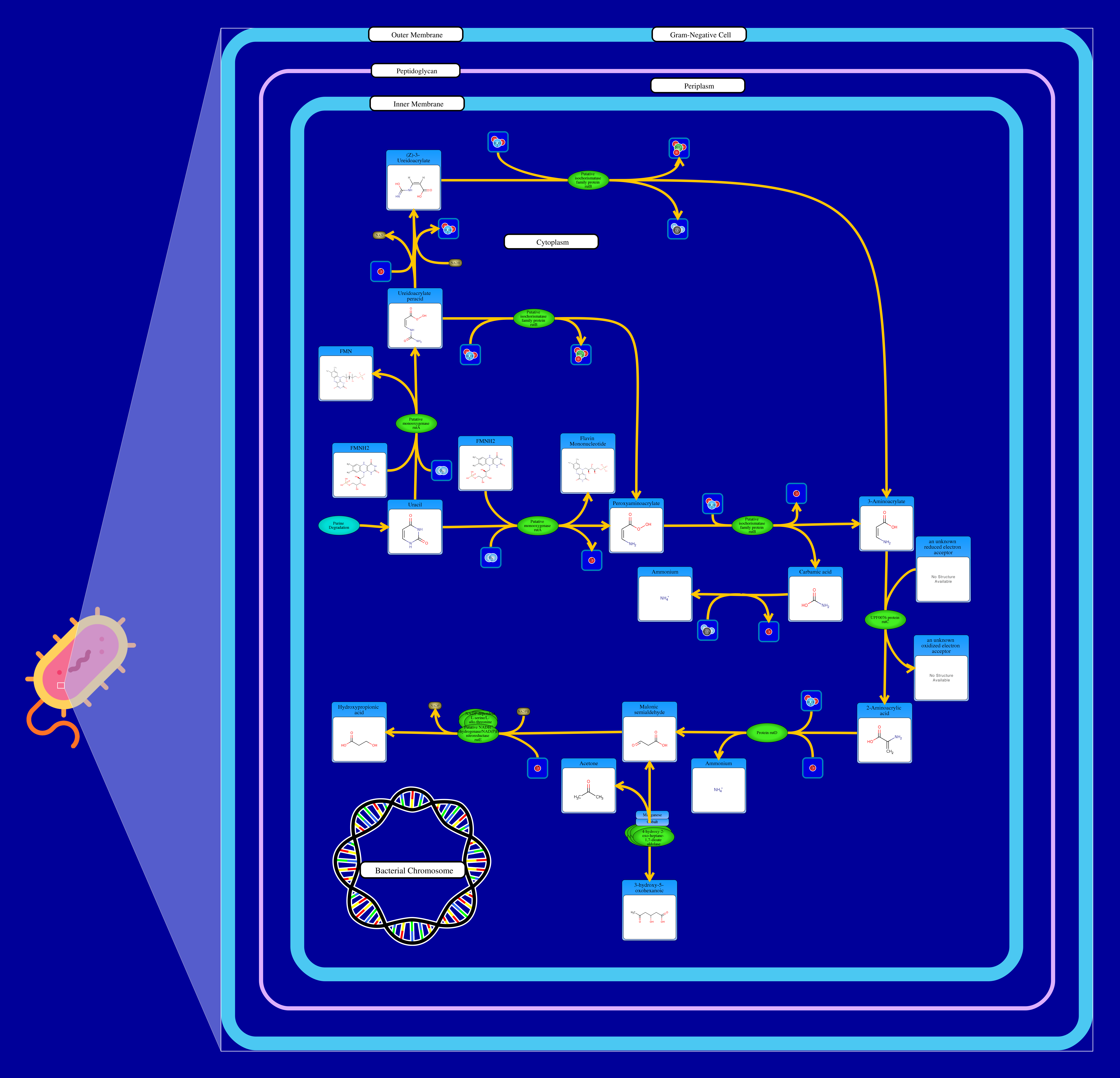Uracil is a pyrimidine nucleobase found in RNA, and can be used as a source of nitrogen for E. coli. There are at least three pathways through which uracil is degraded. This one begins with uracil, which originates from purine degradation. The putative monooxygenase enzyme rutA catalyzes the breakdown of uracil into peroxyaminoacrylate, using FMNH2 as a cofactor. Peroxyaminoacrylate is then broken down into both carbamic acid and 3-aminoacrylate following the addition of a water molecule by the putative isochorismatase family protein rutB. Carbamic acid can then spontaneously, with the addition of a hydrogen ion, split into an ammonium ion and a molecule of carbon dioxide. 3-aminoacrylate, on the other hand, is catalyzed by the UPF0076 protein rutC to form 2-aminoacrylic acid. This compound enters into a reaction catalyzed by protein rutD, which adds a water molecule and hydrogen ion and forms malonic semialdehyde with ammonium being a byproduct. Finally, the putative NADH dehydrogenase/NAD(P)H nitroreductase rutE complex converts malonic semialdehyde into hydroxypropionic acid, which is then used to form other necessary chemicals. The ammonium ions produced will be the important source of nitrogen for the bacteria.
