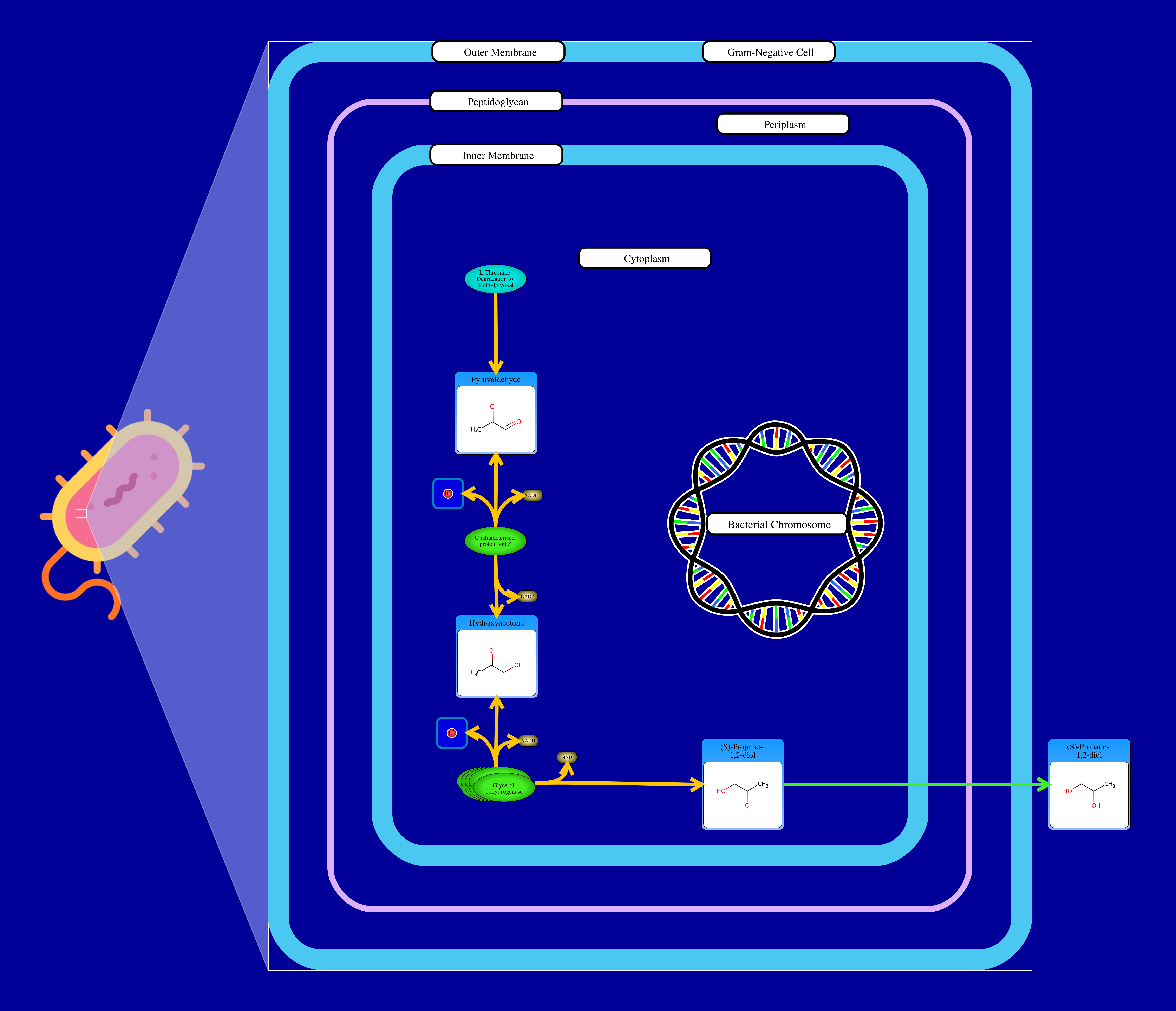 Methylglyoxal, also known as pyruvaldehyde, is a cytotoxic compound derived from pyruvic acid. In E. coli, there are at least eight pathways that are responsible for the detoxification of methylglyoxal. The first reaction in this pathway is the reversible reduction of pyruvaldehyde to hydroxyacetone, along with the cofactor NADPH, catalyzed by an uncharacterized protein encoded by the yghZ gene, now known to be L-glyceraldehyde 3-phosphate reductase. Following this, hydroxyacetone is oxidized into (S)-propane-1,2-diol by the glycerol dehydrogenase enzyme, using NAD as a cofactor. Finally, (S)-propane-1,2-diol is transported into the periplasmic space.