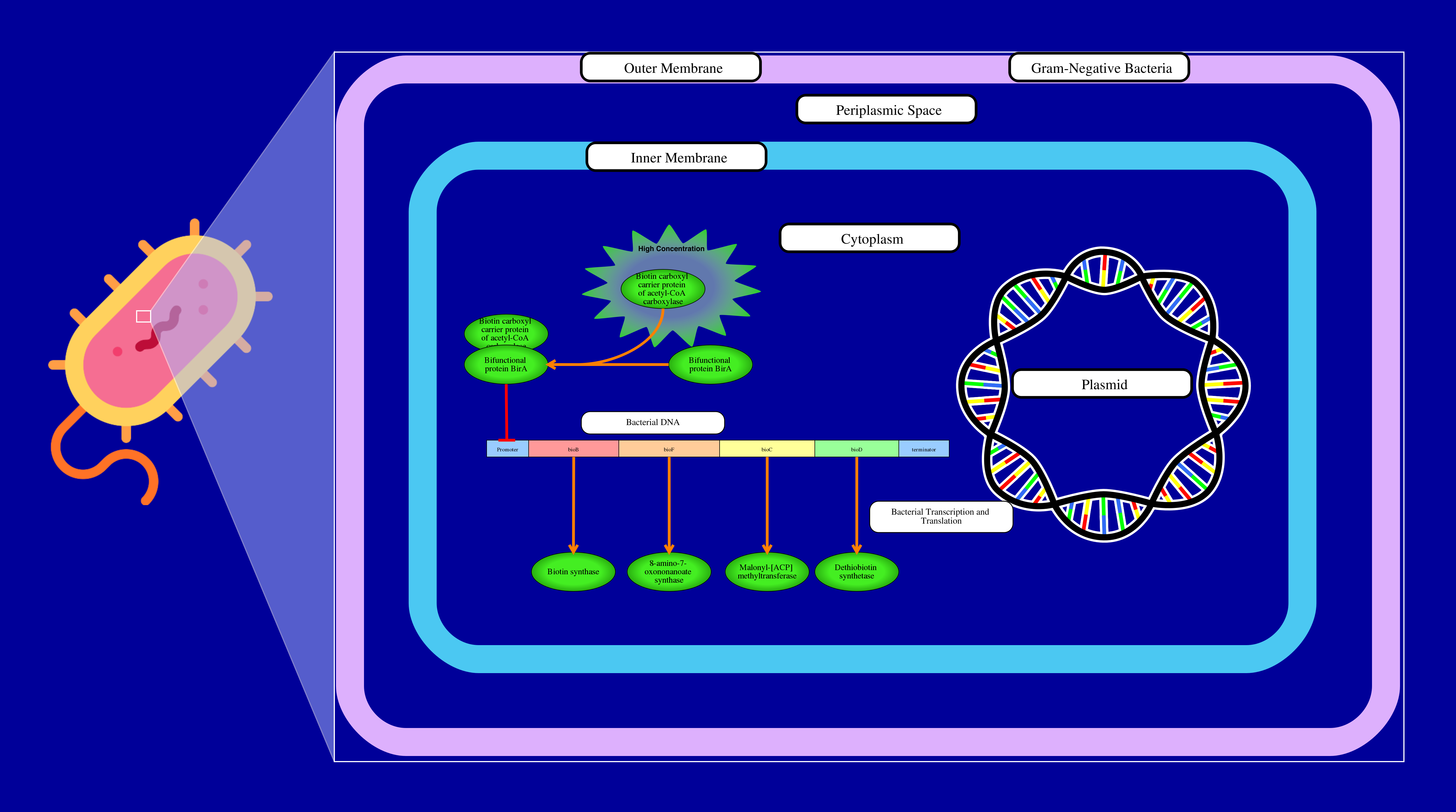 The BioBFCD operon in E. coli contains four genes involved in the biosynthesis of biotin, a molecule important for various metabolic functions in the cell. The operon can be inactivated by the ginding of bifunctional protein BirA when it interacts with the biotin carboxyl carrier protein of acetyl-CoA carboxylase (AccB). This complex forms when AccB is in high concentrations, due to high levels of biotin already in the cell.
