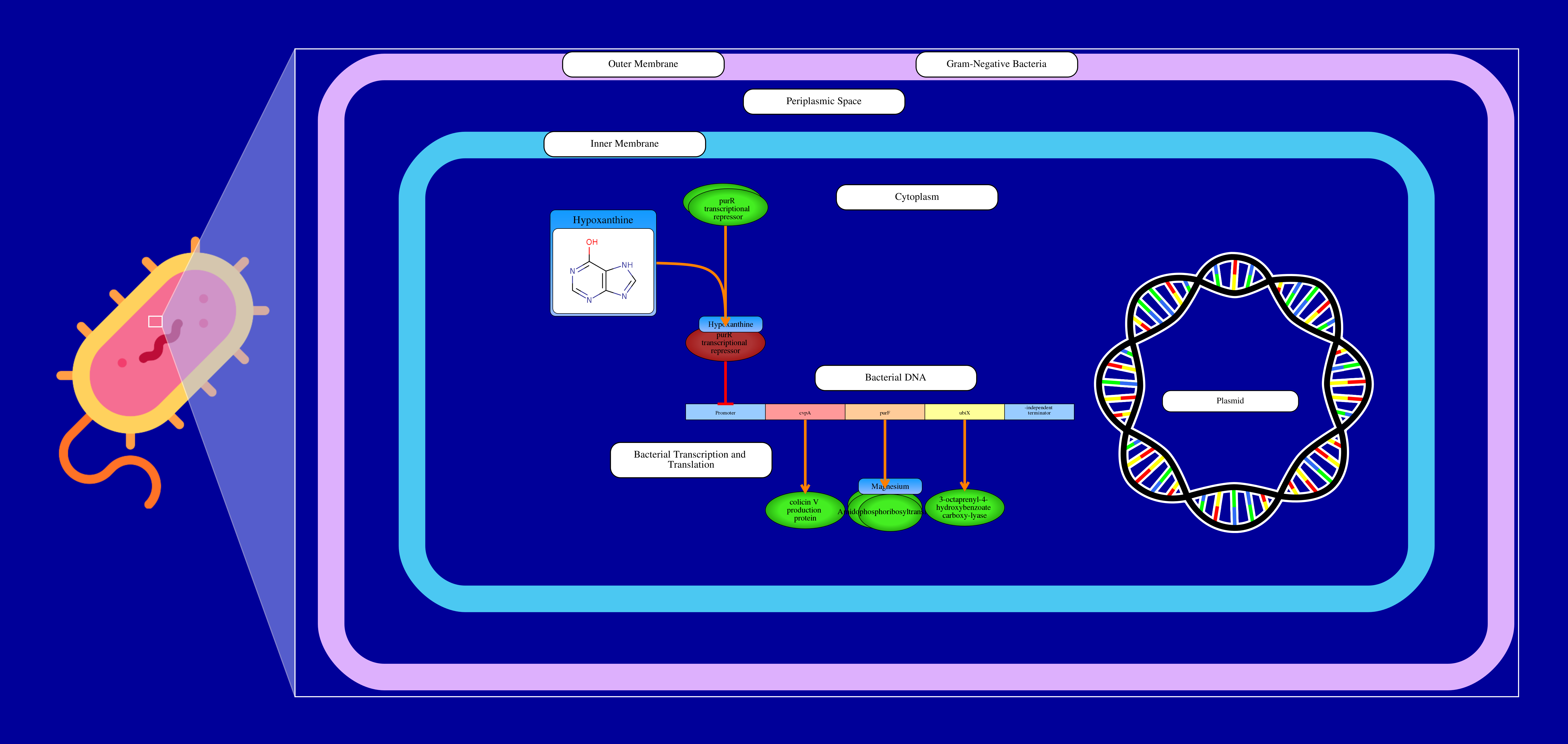 The operon can be inhibited by the PurR transcriptional repressor, which binds to the promoter region and represses transcription. Hypoxanthine can also bind to PurR, which induces a conformational change in the protein, allowing it to bind more strongly to DNA, and increasing its repressive properties.