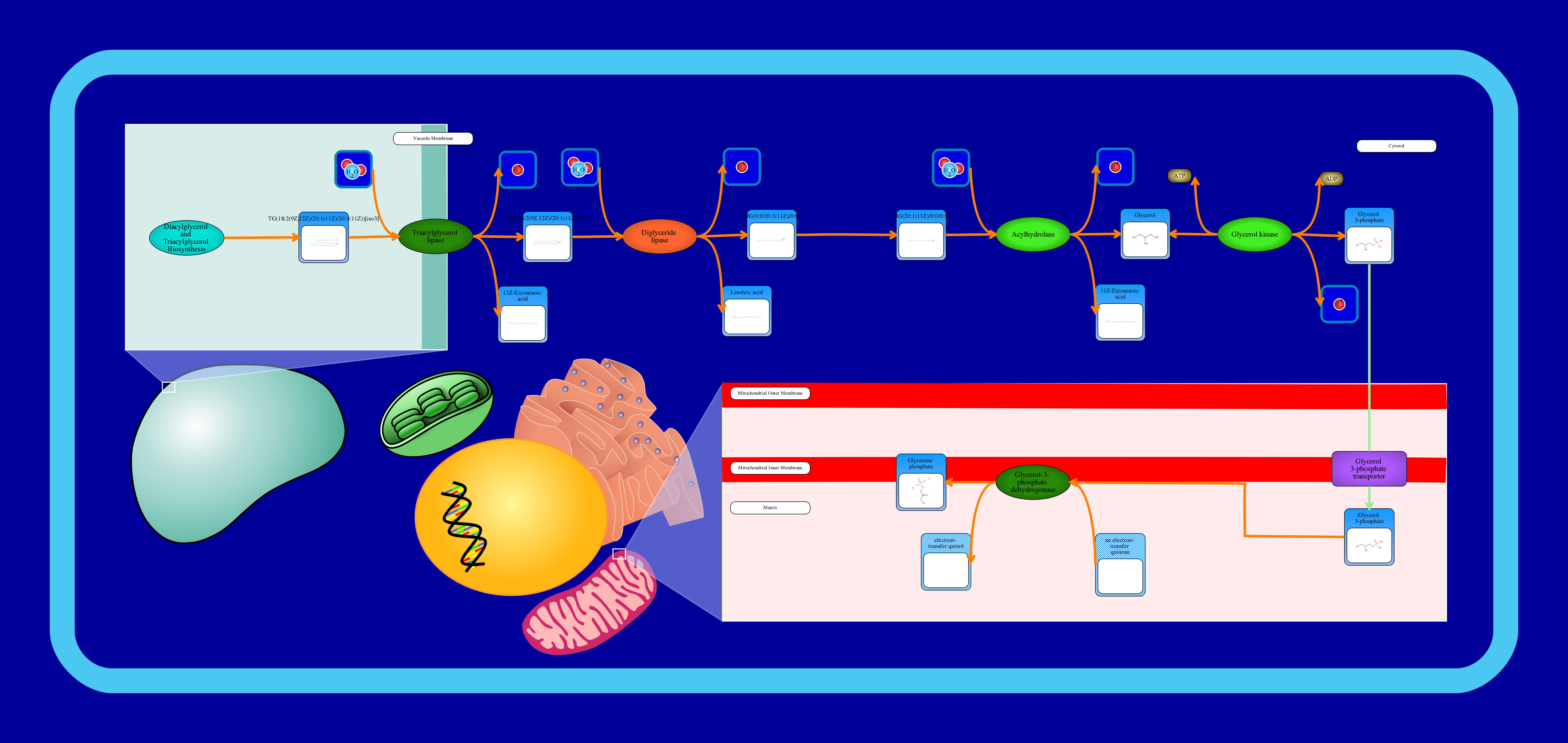 In higher plants, the primary seed storage reserve is triacylglycerol rather than carbohydrates. Thus, triacylglycerol degradation is an important pathway from which plants obtain energy for growth. First, triacylglycerol lipase, an enzyme localized to the oil body (storage vacuole) membrane, catalyzes the conversion of a triglyceride into a 1,2-diglyceride. Second, the predicted enzyme diglyceride lipase (coloured orange in the image) is theorized to catalyze the conversion of a 1,2-diglyceride iinto a 2-acylglycerol. Third, a 2-acylglycerol is spontaneously converted into a 1-monoglyceride. Fourth, acylhydrolase catalyzes the conversion of a 1-monoglyceride into glycerol. Fifth, glycerol kinase catalyzes the conversion of glycerol into glycerol 3-phosphate. Sixth, glycerol-3-phosphate dehydrogenase (coloured dark green in the image), localized to the mitochondrial inner membrane, catalyzes the conversion of glycerol 3-phosphate into glycerone phosphate.