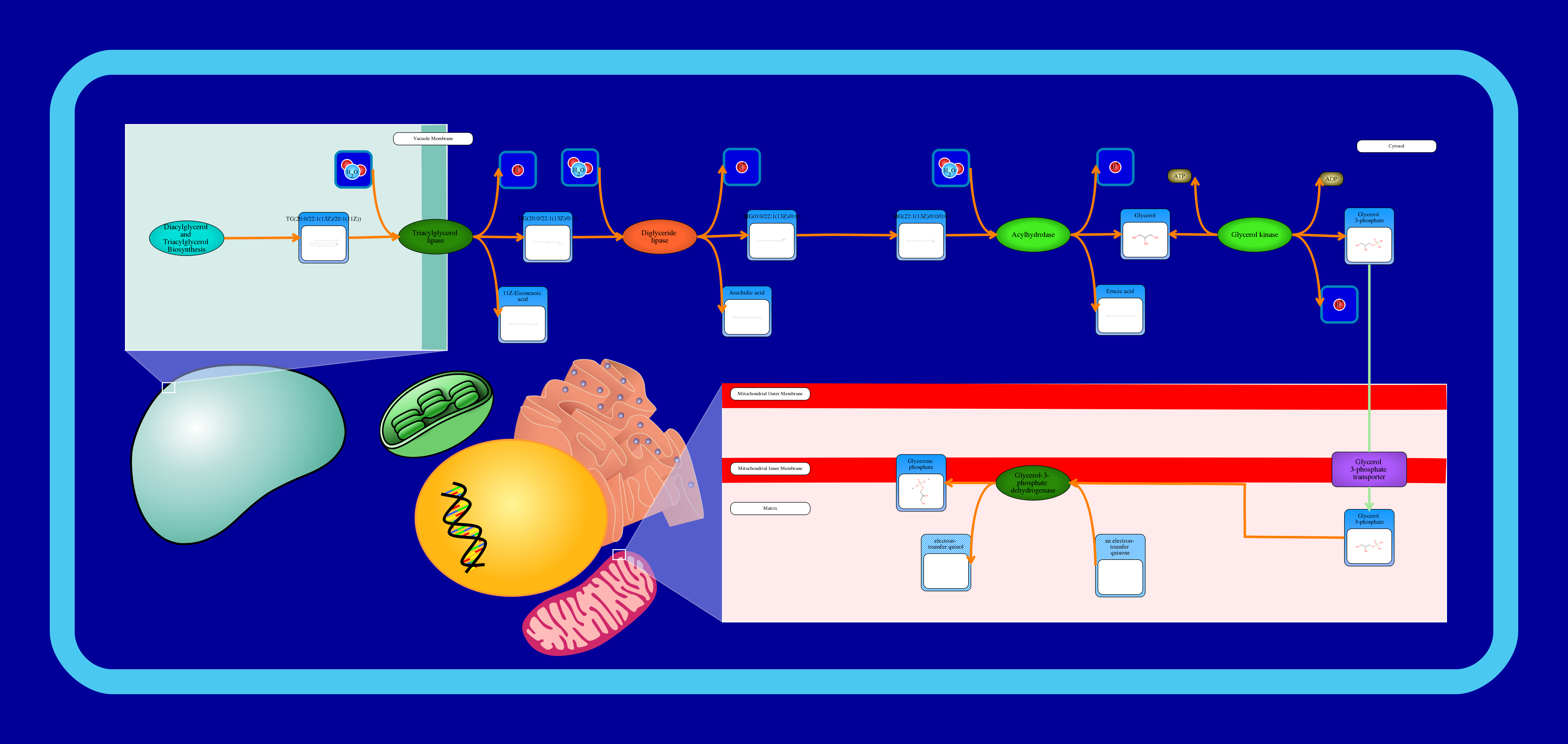 In higher plants, the primary seed storage reserve is triacylglycerol rather than carbohydrates. Thus, triacylglycerol degradation is an important pathway from which plants obtain energy for growth. First, triacylglycerol lipase, an enzyme localized to the oil body (storage vacuole) membrane, catalyzes the conversion of a triglyceride into a 1,2-diglyceride. Second, the predicted enzyme diglyceride lipase (coloured orange in the image) is theorized to catalyze the conversion of a 1,2-diglyceride iinto a 2-acylglycerol. Third, a 2-acylglycerol is spontaneously converted into a 1-monoglyceride. Fourth, acylhydrolase catalyzes the conversion of a 1-monoglyceride into glycerol. Fifth, glycerol kinase catalyzes the conversion of glycerol into glycerol 3-phosphate. Sixth, glycerol-3-phosphate dehydrogenase (coloured dark green in the image), localized to the mitochondrial inner membrane, catalyzes the conversion of glycerol 3-phosphate into glycerone phosphate.