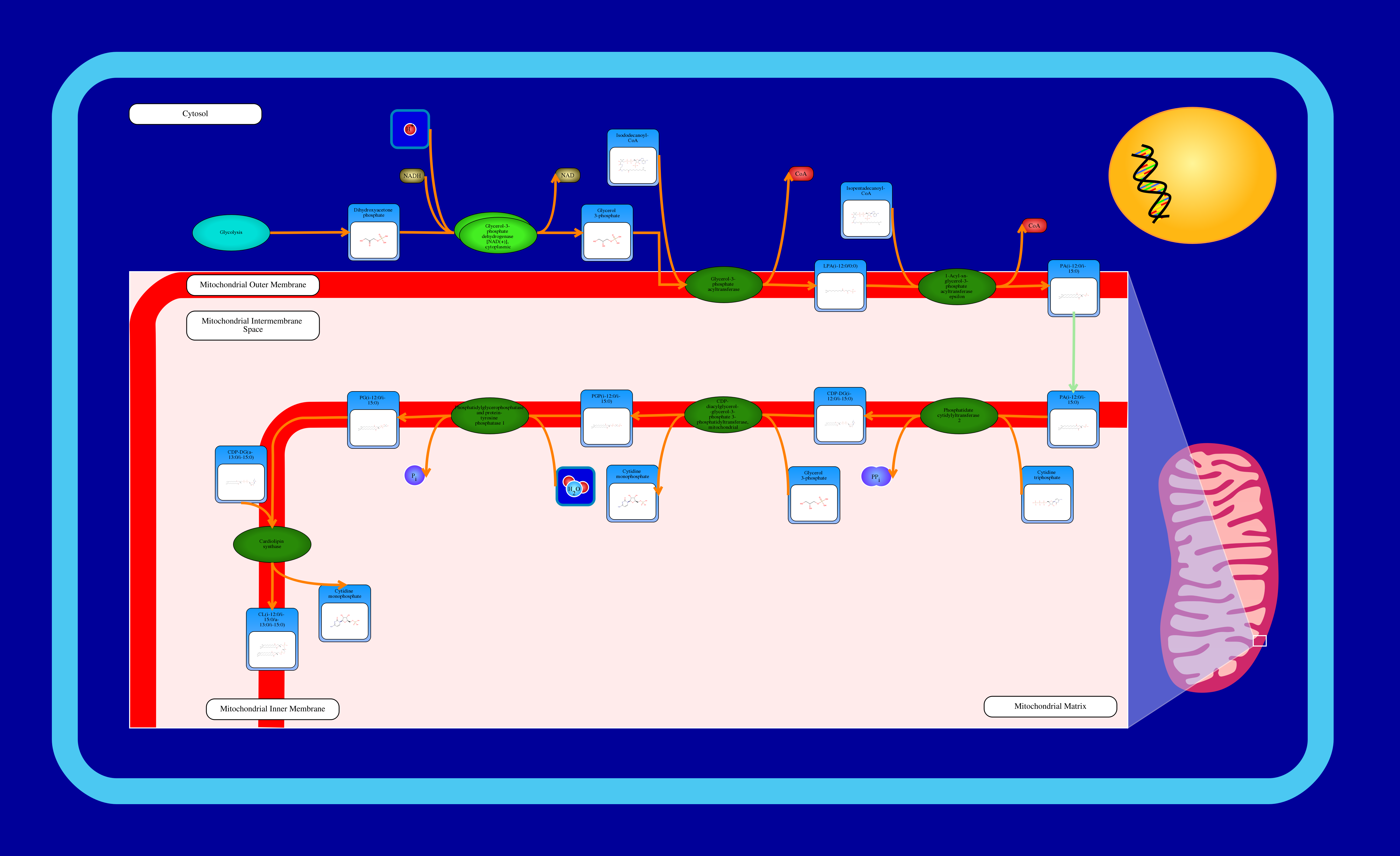 Cardiolipin (CL) is an important component of the inner mitochondrial membrane where it constitutes about 20% of the total lipid composition. It is essential for the optimal function of numerous enzymes that are involved in mitochondrial energy metabolism. (Wikipedia) Cardiolipin biosynthesis occurs mainly in the mitochondria, but there also exists an alternative synthesis route for CDP-diacylglycerol that takes place in the endoplasmic reticulum. This second route may supplement this pathway. All membrane-localized enzymes are coloured dark green in the image. First, dihydroxyacetone phosphate (or glycerone phosphate) from glycolysis is used by the cytosolic enzyme glycerol-3-phosphate dehydrogenase [NAD(+)] to synthesize sn-glycerol 3-phosphate. Second, the mitochondrial outer membrane enzyme glycerol-3-phosphate acyltransferase esterifies an acyl-group to the sn-1 position of sn-glycerol 3-phosphate to form 1-acyl-sn-glycerol 3-phosphate (lysophosphatidic acid or LPA). Third, the enzyme 1-acyl-sn-glycerol-3-phosphate acyltransferase converts LPA into phosphatidic acid (PA or 1,2-diacyl-sn-glycerol 3-phosphate) by esterifying an acyl-group to the sn-2 position of the glycerol backbone. PA is then transferred to the inner mitochondrial membrane to continue cardiolipin synthesis. Fourth, magnesium-dependent phosphatidate cytidylyltransferase catalyzes the conversion of PA into CDP-diacylglycerol. Fifth, CDP-diacylglycerol--glycerol-3-phosphate 3-phosphatidyltransferase synthesizes phosphatidylglycerophosphate (PGP). Sixth, phosphatidylglycerophosphatase and protein-tyrosine phosphatase dephosphorylates PGP to form phosphatidylglycerol (PG). Last, cardiolipin synthase catalyzes the synthesis of cardiolipin by transferring a phosphatidyl group from a second CDP-diacylglycerol to PG. It requires a divalent metal cation cofactor. Newly synthesized cardiolipins undergo remodeling, a process carried out by the enzyme tafazzin. A mutated tafazzin gene disrupts this post-synthetic remodeling and causes Barth syndrome (BTHS), an X-linked human disease (PMID: 16973164). BTHS patients seem to lack acyl specificity and consequently, many potential cardiolipin species can exist (PMID: 16226238).
