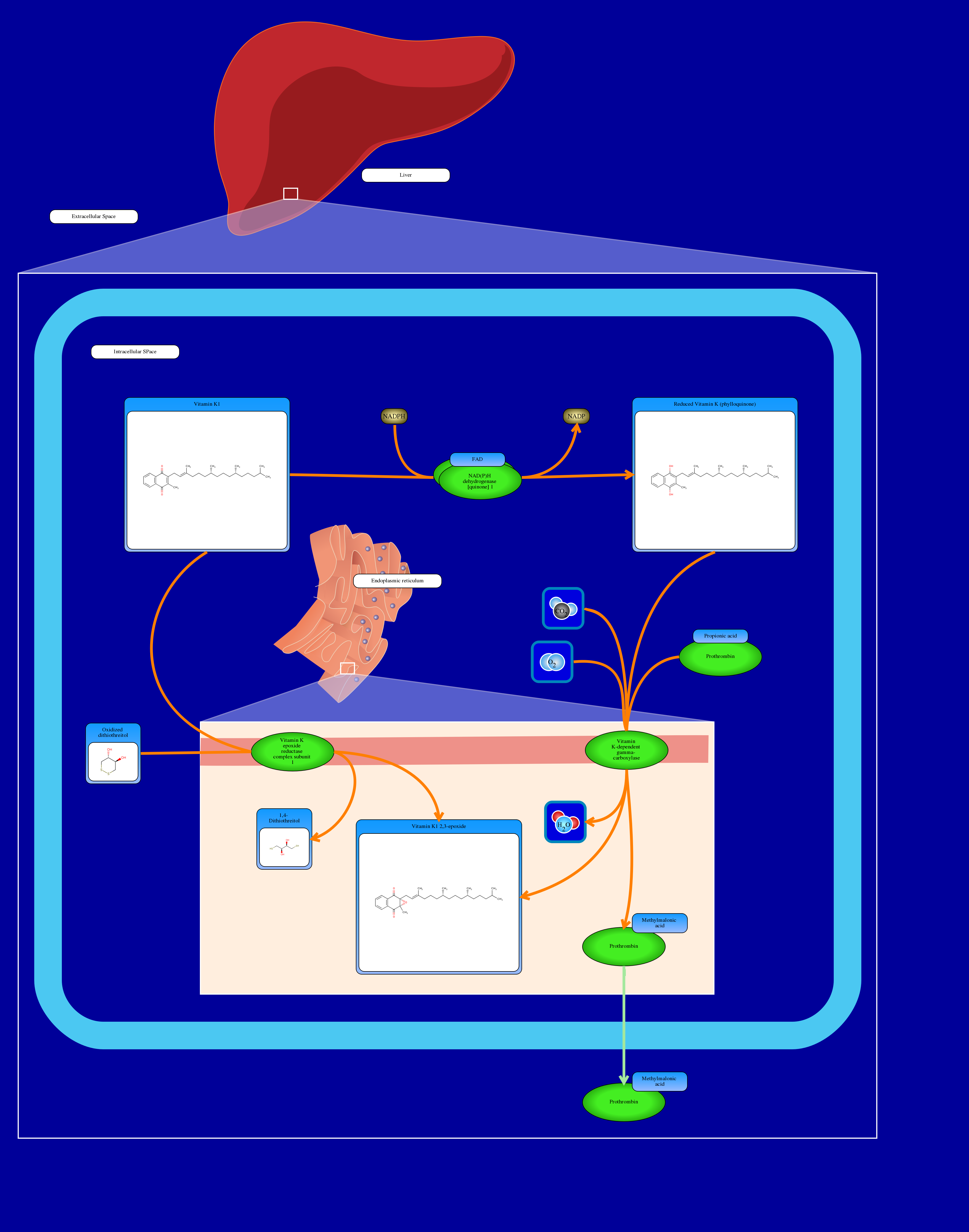 Vitamin K describes a group of lipophilic, hydrophobic vitamins that exist naturally in two forms (and synthetically in three others): vitamin K1, which is found in plants, and vitamin K2, which is synthesized by bacteria. Vitamin K is an important dietary component because it is necessary as a cofacter in the activation of vitamin K dependent proteins. Metabolism of vitamin K occurs mainly in the liver. In the first step, vitamin K is reduced to its quinone form by a quinone reductase such as NAD(P)H dehydrogenase. Reduced vitamin K is the form required to convert vitamin K dependent protein precursors to their active states. It acts as a cofactor to the integral membrane enzyme vitamin K-dependent gamma-carboxylase (along with water and carbon dioxide as co-substrates), which carboxylates glutamyl residues to gamma-carboxy-glutamic acid residues on certain proteins, activating them. Each converted glutamyl residue produces a molecule of vitamin K epoxide, and certain proteins may have more than one residue requiring carboxylation. To complete the cycle, the vitamin K epoxide is returned to vitamin K via the vitamin K epoxide reductase enzyme, also an integral membrane protein. The vitamin K dependent proteins include a number of important coagulation factors, such as prothrombin. Thus, warfarin and other coumarin drugs act as anticoagulants by blocking vitamin K epoxide reductase.