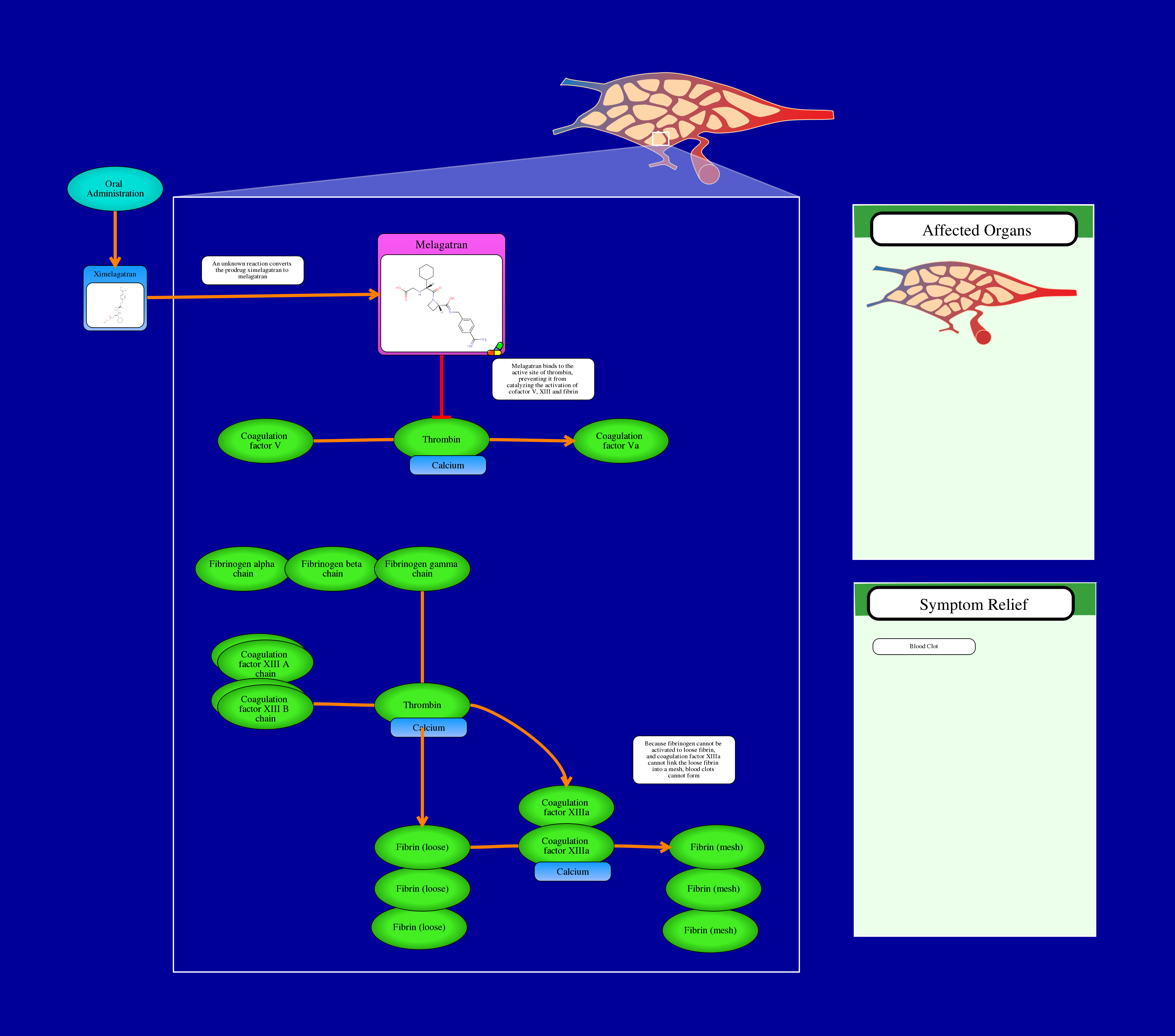 After oral administration, ximelagatran is absorbed and converted to melagatran through an unknown series of reactions. From there, melagatran directly binds to thrombin, preventing its use as an enzyme. This prevents catalyzation of factor V to factor Va, which would form the prothrombinase complex and create more thrombin. It also prevents the catalysis fibrinogen or factor I to fibrin, which then polymerizes to form the blood clot. The lack of useable thrombin also prevents the catalysis of factor XIII to factor XIIIa, which is necessary to crosslink the polymerized fibrin to form a water insoluble clot.