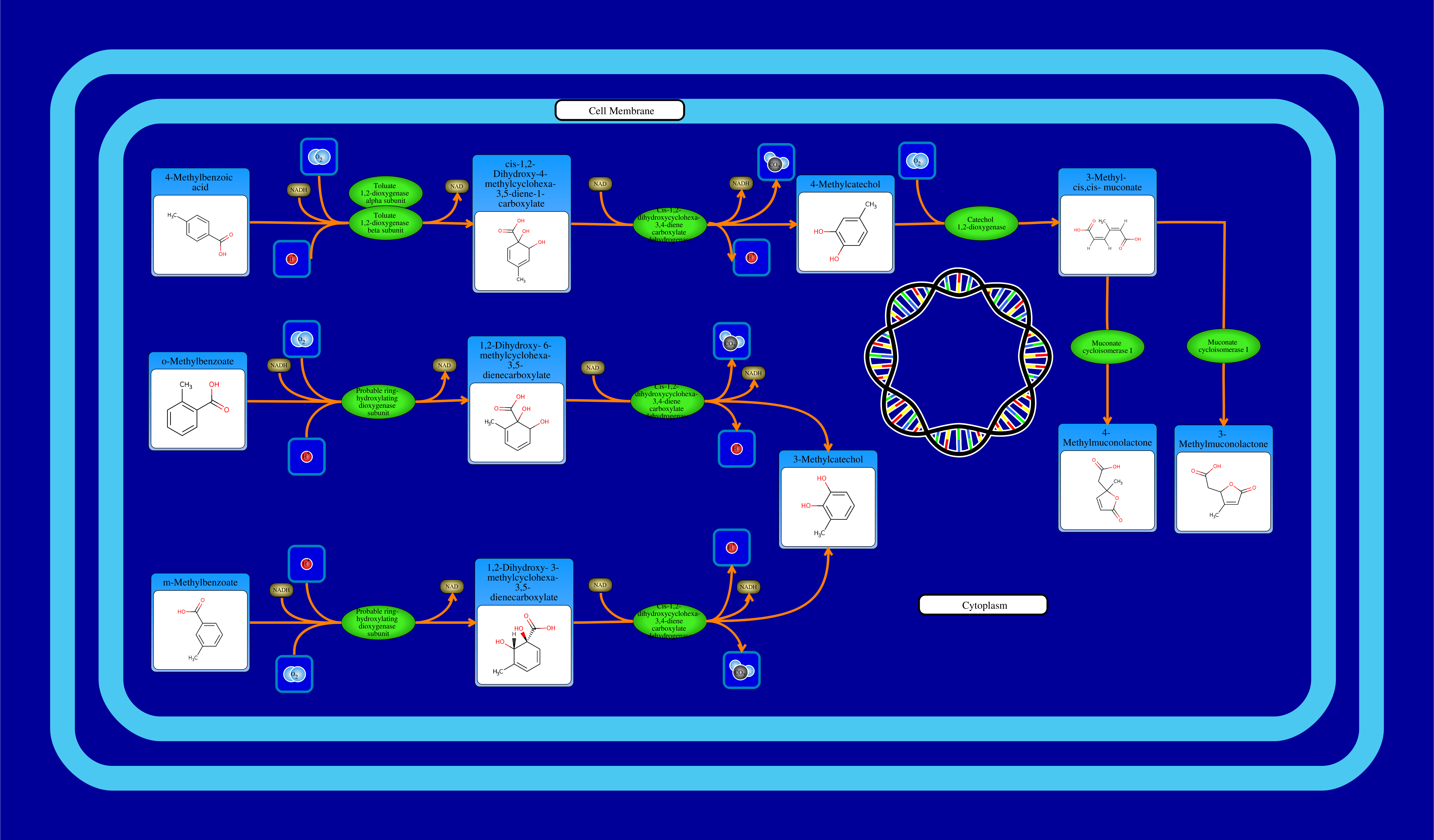 One part of this pathway starts with 4-methylbenzoic acid / p-methylbenzoate which is a product downstream of the p-xylene degradation and forms other intermediates: cis-1,2-dihydroxy-4-methylcyclohexa-3,5-diene-1-carboxylate, 4-methylcatechol, 3-methyl-cis,cis-muconate, 4-methylmuconolactone and 3-methylmuconolactone aided by the proteins and protein complexes: toluate-1,2-deoxygenase alpha and beta subunit, cis-1,2-dihydroxycyclohexa-3,4-diene carboxylate dehydrogenase, catechol 1,2-dioxygenase, and muconate cycloisomerase I. It must be noted that the intermediate 3-methyl-cis,cis-muconate gives rise to two products in this pathway via two different reactions using the same protein muconate cycloisomerase I.