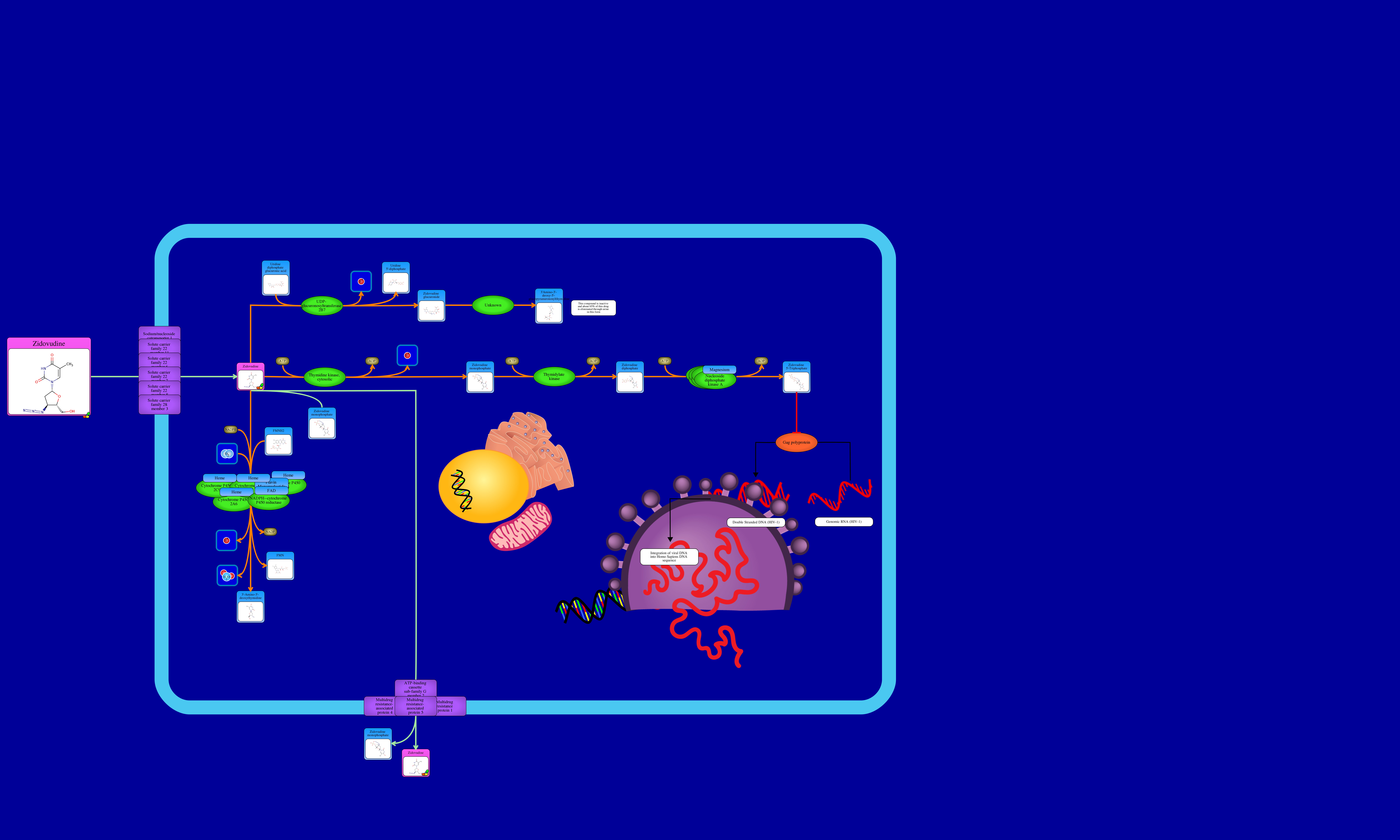 Zidovudine is a medication used to prevent and to treat HIV/AIDS. It is part of the an antiretroviral and belongs to the NRTI class of drugs, also known as nucleoside reverse transcriptase inhibitors and its generic name is azidothymidine. Zidovudine is generally taken orally, which begins this pathway. After being ingested, Zidovudine is transported into the cell using 6 transporters, namely SLC28A1, SLC28A3, SLC22A6, SLC22A7, SLC22A8, and SLC22A11. After entering the cell, Zidovudine is converted by TK1 to create zidovudine monophosphate. Zidovudine monophosphate is then turned into zidovudine diphosphate through the enzyme DTYMK. Zidovudine diphosphate undergoes a final transformation into zidovudine triphosphate, before being able to perform its intended function and inhibiting HIV RT. Zidovudine also undergoes two other branches of reactions upon entering the cell, the first being catalyzation into 5’-glucuronyl zidovudine, and subsequently being converted by an unknown protein into 3’amino-3’-deoxy-5’-glcopyranuronosylthymidine, which is then eliminated. The second branch of reactions that zidovudine undergoes is its conversion to 3’-amino-3’-deoxythymidine, through the various proteins CYP2C9, CYP2A6, CYP2E1, CYP3A4, and POR, which may or may not be cytotoxic in the cell.