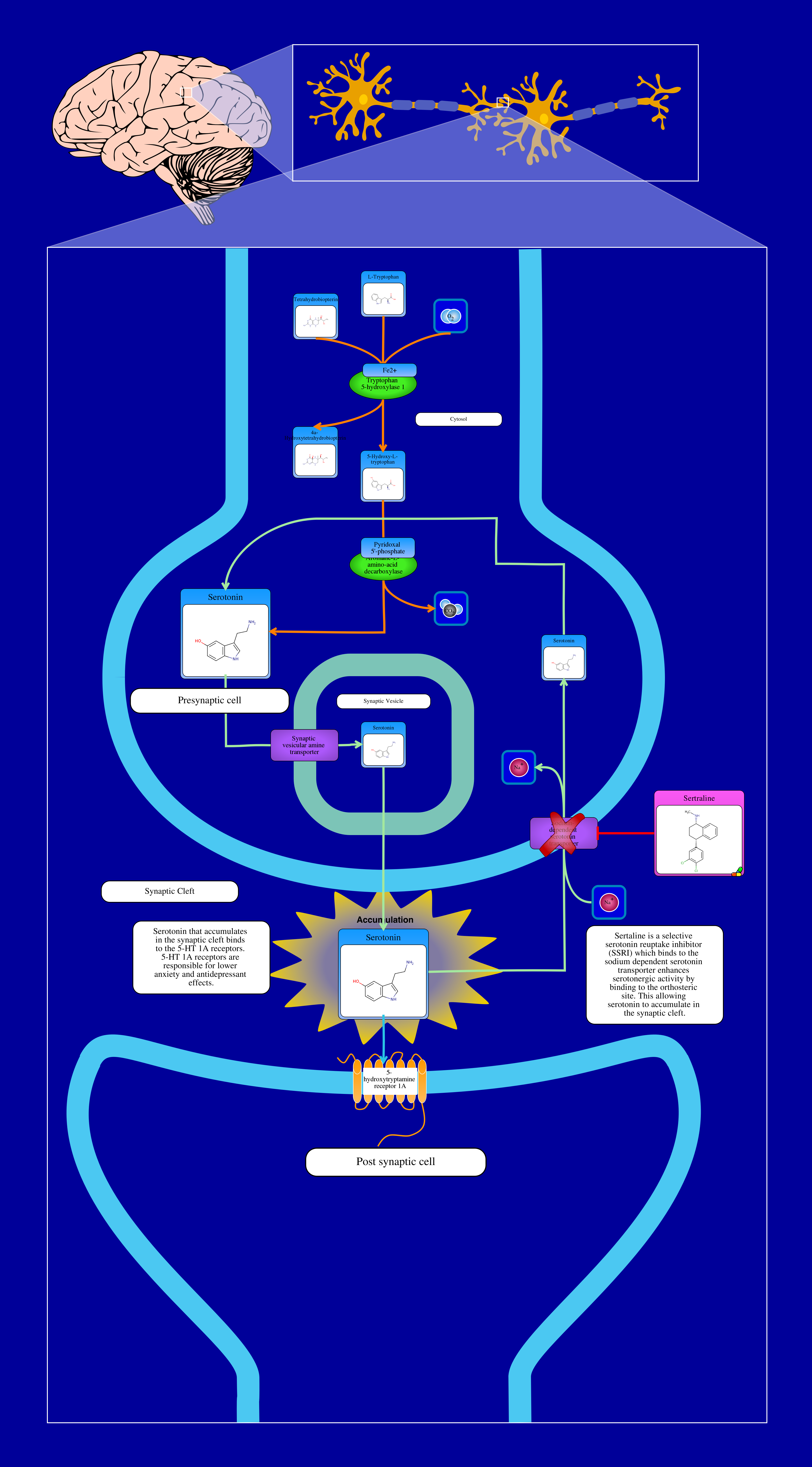It's mechanism of action it to bind selectively bind to the sodium dependent serotonin transporter and blocking the recycling of serotonin from the synapse. As serotonin accumulates it enhances the serotonergic function of the 5-hydroxytryptamine 1A receptor leading to decreased anxiety and depressive moods.
