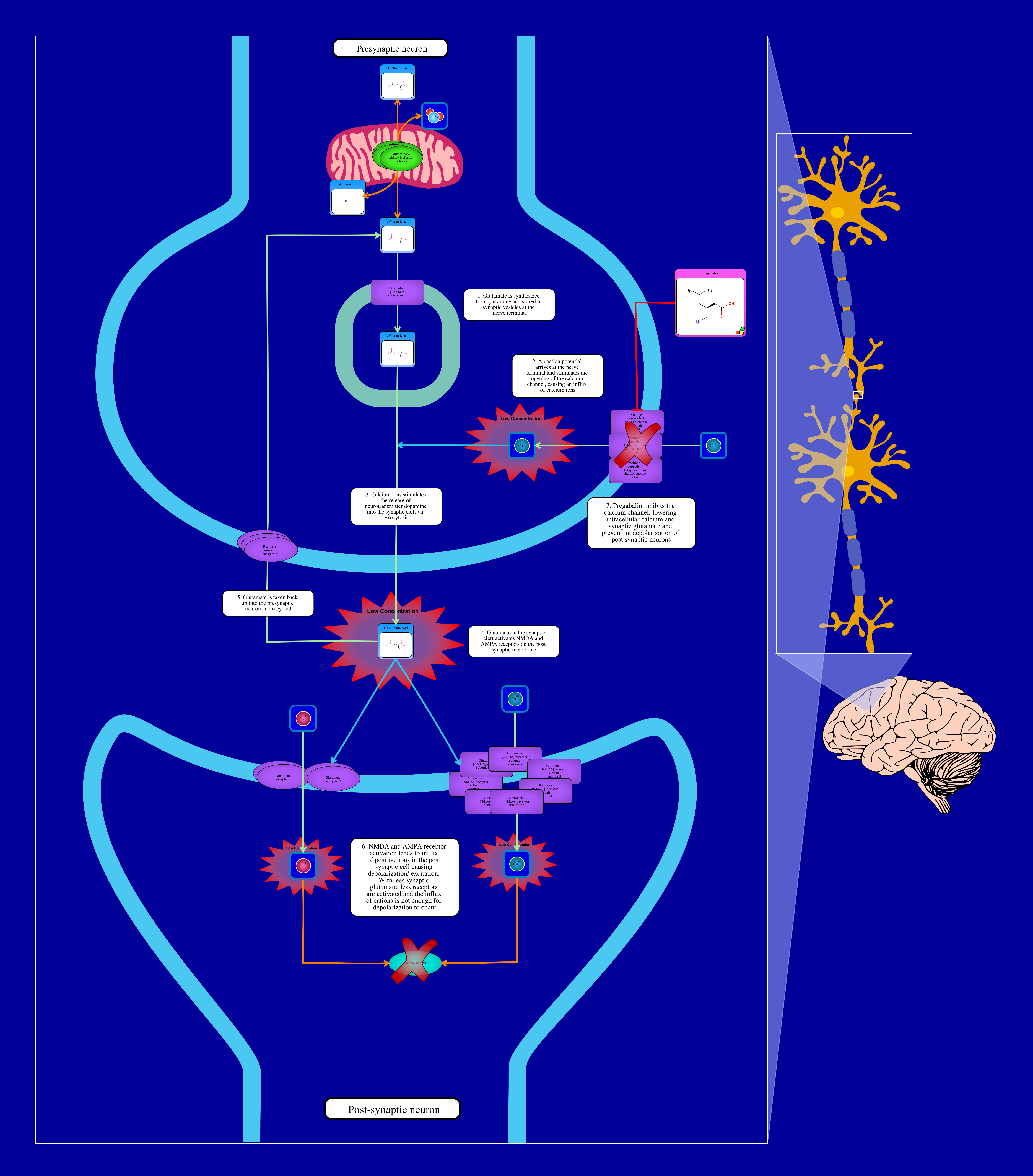 In glutamatergic neurons, glutamate is synthesized from the amino acid glutamine and transported into synaptic vesicles by excitatory amino acid transporter and stored until an action potential arrives at the nerve terminal. When an action potential does arrive at the nerve terminal, this triggers the opening of voltage gated L-type calcium channel, leading to the influx of calcium ions into the presynaptic nerve terminal. The influx of calcium triggers the release of the stored neurotransmitter into the synapse via exocytosis. Glutamate is an excitatory neurotransmitter, thus, once it gets in the synapse it activates NMDA and AMPA receptors. Activation of NMDA receptors results in calcium ions being transported into the post synaptic neuron. Activation of AMPA receptor results in sodium being transported into the post synaptic neuron. The influx of cations into the post synaptic neuron leads to depolarization/ excitation of the neuron.