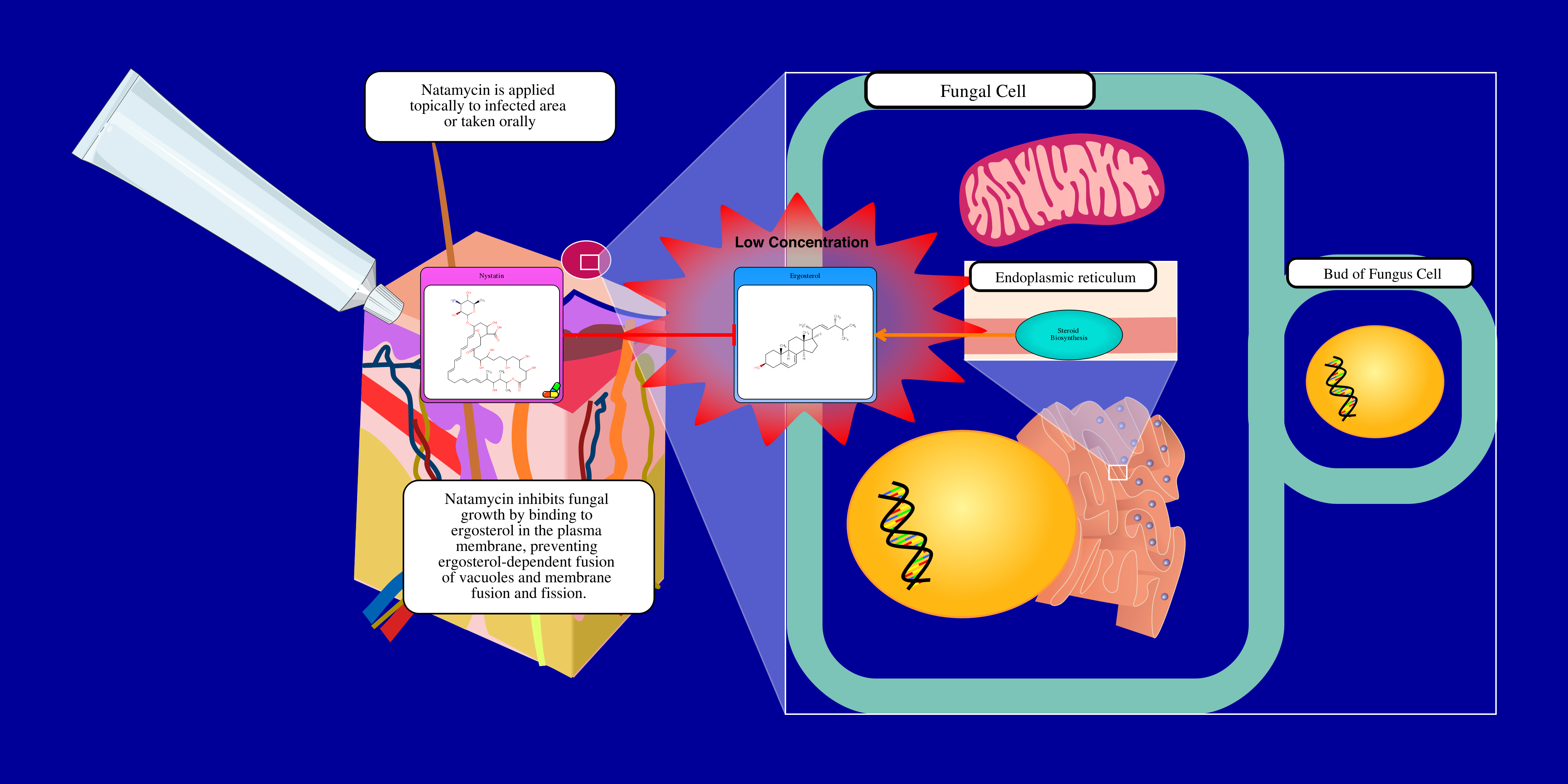Nystatin is a channel-forming ionophore, meaning it exerts its therapeutic effect via formation of a membrane-spanning pore in the fungal plasma membrane. The formation of this pore results in a change in membrane permeability that allows for leakage of intracellular contents and the subsequent disruption of electrochemical gradients necessary for proper cell function. Selectivity for fungal cells over mammalian cells is due to nystatin’s greater binding affinity for ergosterol, a key sterol found in fungal cell walls, as opposed to its mammalian counterpart, cholesterol.