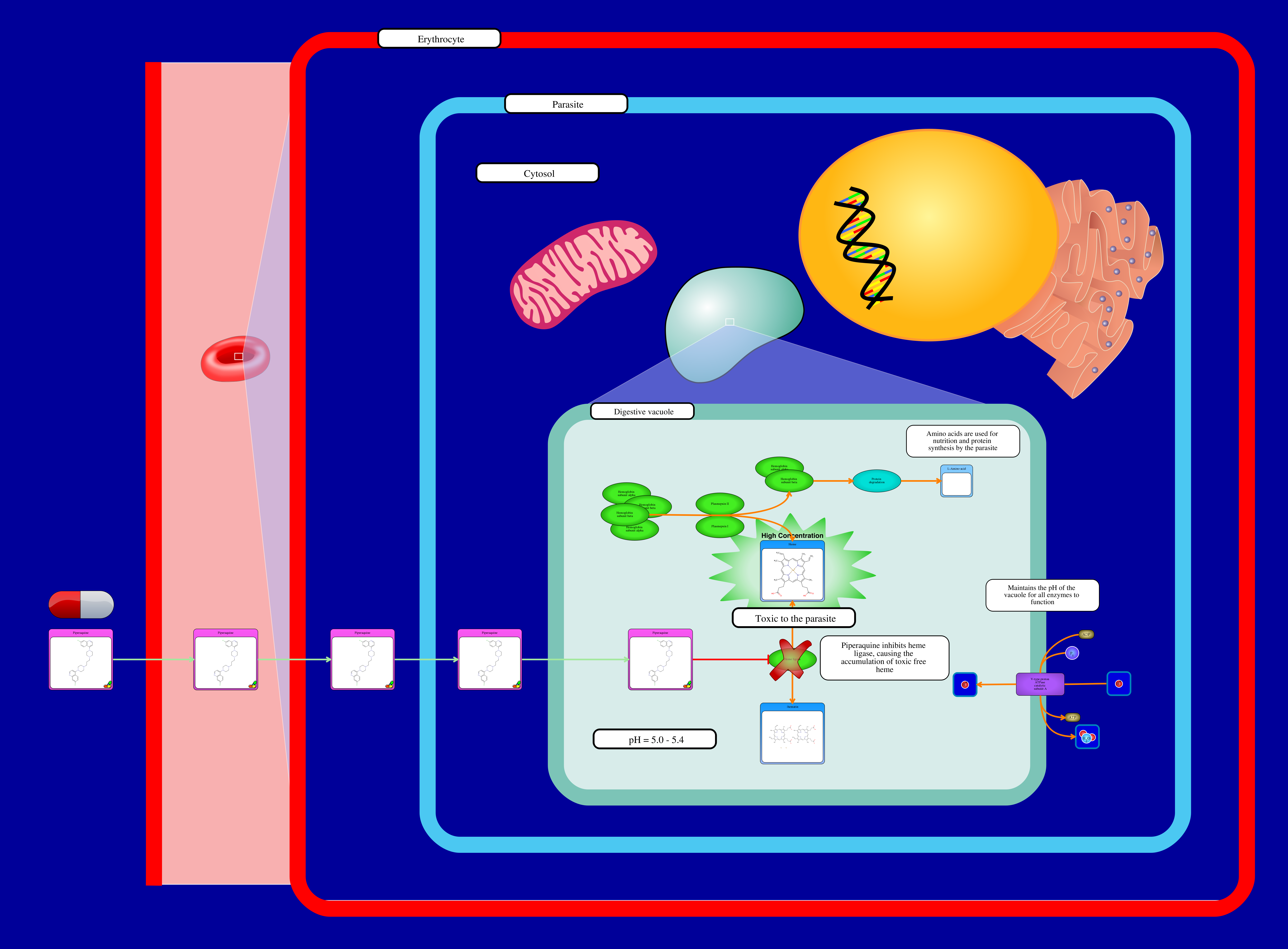 The mechanism of piperaquine inhibition of the haem detoxification pathway is unknown but is expected to be similar to that of Chloroquine.