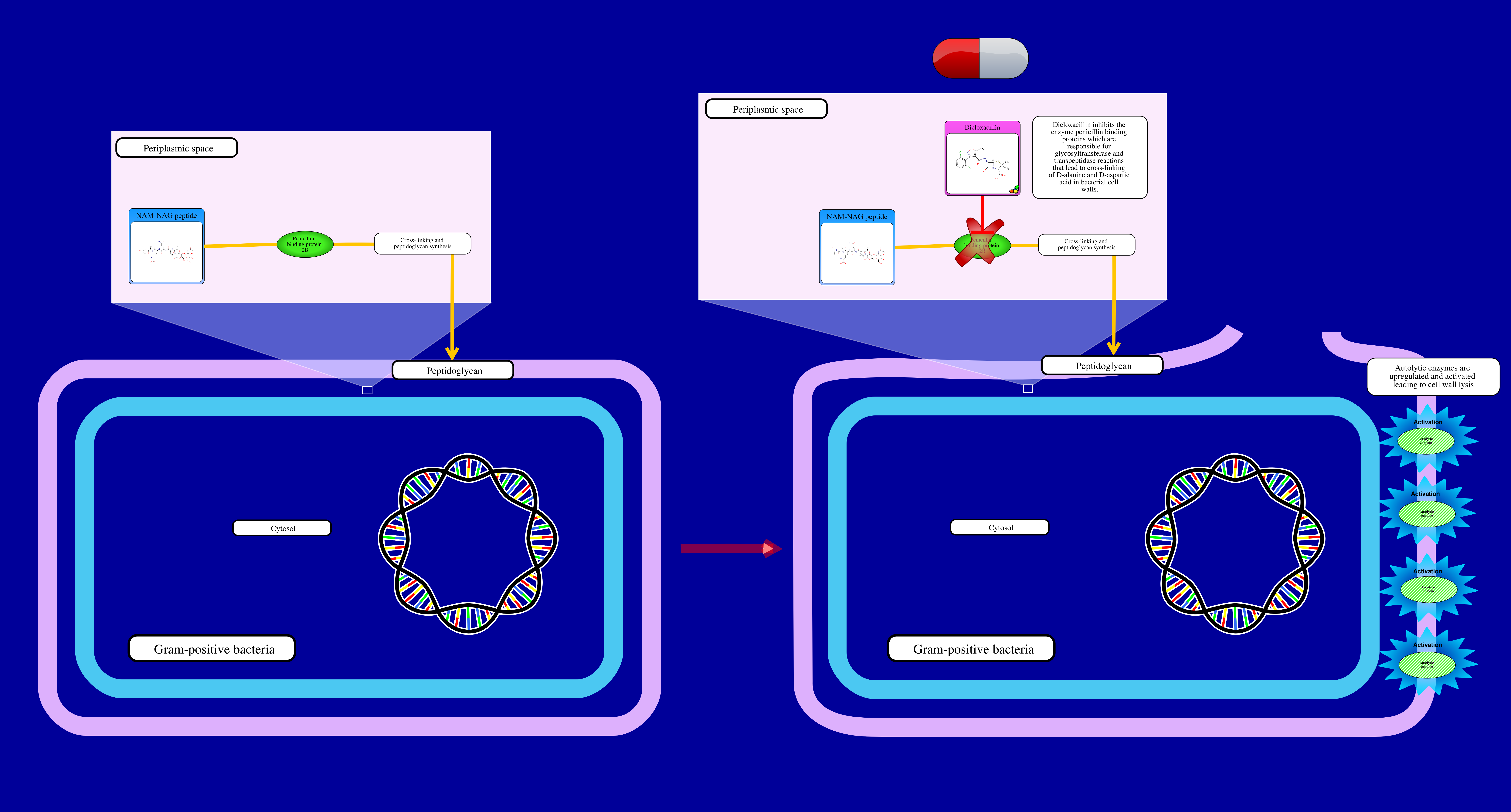 Dicloxacillin is a beta-lactamase resistant penicillin similar to oxacillin. Dicloxacillin has in vitro activity against gram-positive and gram-negative aerobic and anaerobic bacteria. Dicloxacillin exerts a bactericidal action against penicillin-susceptible microorganisms during the state of active multiplication. It inhibits the biosynthesis of the bacterial cell wall. By binding to specific penicillin-binding proteins (PBPs) located inside the bacterial cell wall, dicloxacillin inhibits the third and last stage of bacterial cell wall synthesis. Cell lysis is then mediated by bacterial cell wall autolytic enzymes such as autolysins; it is possible that dicloxacillin interferes with an autolysin inhibitor.