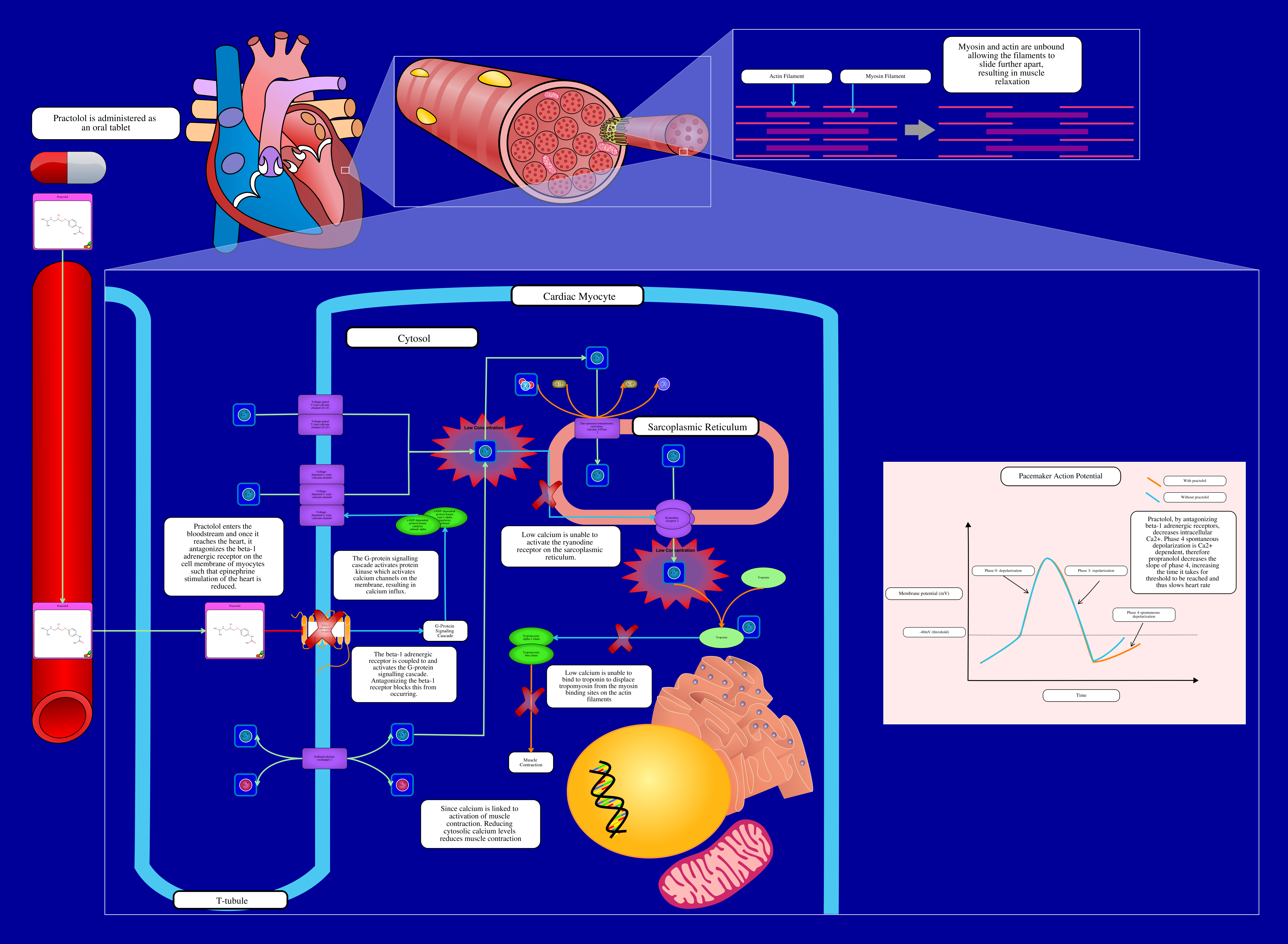 Practolol is a cardioselective beta 1 blocker. It can be administered orally, where it passes through hepatic portal circulation, and enters the bloodstream and travels to act on cardiomyocytes. In bronchial and vascular smooth muscle, practolol can compete with epinephrine for beta-2 adrenergic receptors. By competing with catecholamines for adrenergic receptors, it inhibits sympathetic stimulation of the heart. The reduction of neurotransmitters binding to beta receptor proteins in the heart inhibits adenylate cyclase type 1. Because adenylate cyclase type 1 typically activates cAMP synthesis, which in turn activates PKA production, which then activates SRC and nitric oxide synthase, its inhibition causes the inhibition of cAMP, PKA, SRC and nitric oxide synthase signaling. Following this chain of reactions, we see that the inhibition of nitric oxide synthase reduces nitric oxide production outside the cell which results in vasoconstriction. On a different end of this reaction chain, the inhibition of SRC in essence causes the activation of Caspase 3 and Caspase 9. This Caspase cascade leads to cell apoptosis. The net result of all these reactions is a decreased sympathetic effect on cardiac cells, causing the heart rate to slow and arterial blood pressure to lower; thus, practolol administration and binding reduces resting heart rate, cardiac output, afterload, blood pressure and orthostatic hypotension. By prolonging diastolic time, it can prevent re-infarction. One potentially less than desirable effect of non-selective beta blockers like practolol is the bronchoconstrictive effect exerted by antagonizing beta-2 adrenergic receptors in the lungs. Clinically, it is used to increase atrioventricular block to treat supraventricular dysrhythmias. Practolol also reduce sympathetic activity and is used to treat hypertension, angina, migraine headaches, and hypertrophic subaortic stenosis. Practolol is administered as an oral tablet. Some side effects of using Practolol may include bronchoconstriction, fatigue, and cold extremities.