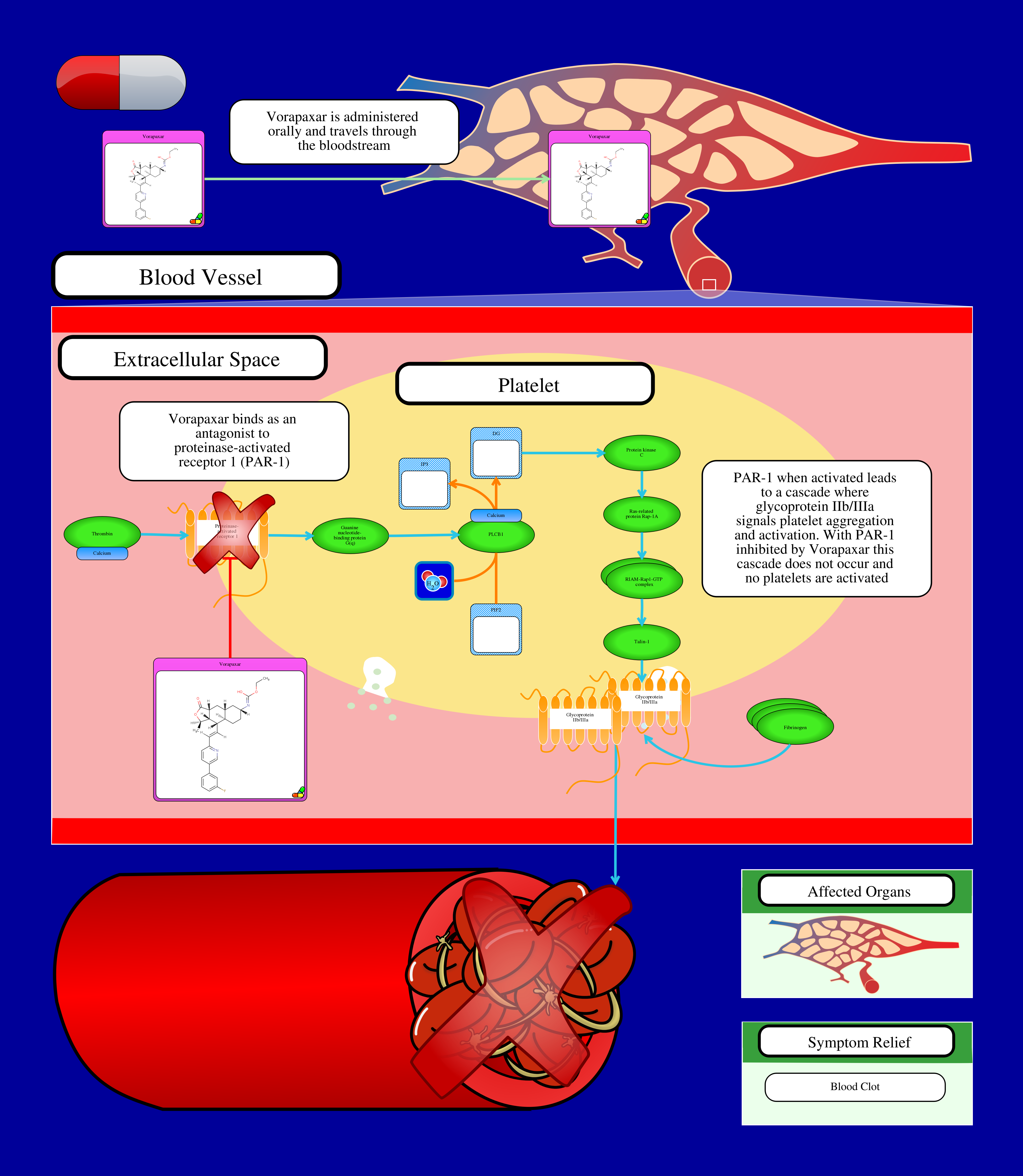 Vorapaxar also known as Zontivity, is an inhibitor for platelet aggregation used to treat patients with a history of myocardial infarction or peripheral arterial disease to reduce the chance of thrombotic cardiovascular events. Vorapaxar inhibits protease-activated receptor 1 (PAR-1), which is a G protein-coupled receptor that is expressed on the platelet. Inhibition of PAR-1 prevents platelet aggregation and activation. Vorapaxar is administered orally and rapidly absorbs and travels through the bloodstream. It is metabolized to major metabolites M20 and M19 by CYP3A4 and CYP2J2. This is then eliminated primarily through feces and urine. Due to the anticoagulant and antiplatelet nature, herbs and supplements with similar activity should be avoided such as garlic, ginger, bilberry, danshen, piracetam and ginkgo biloba. St.John's Wort should also be avoided as it induces CYP3A metabolism and will reduce the concentration of Vorapaxar. Caution should be exercised with grapefruit products, as coadministration with strong inhibitors should be avoided.