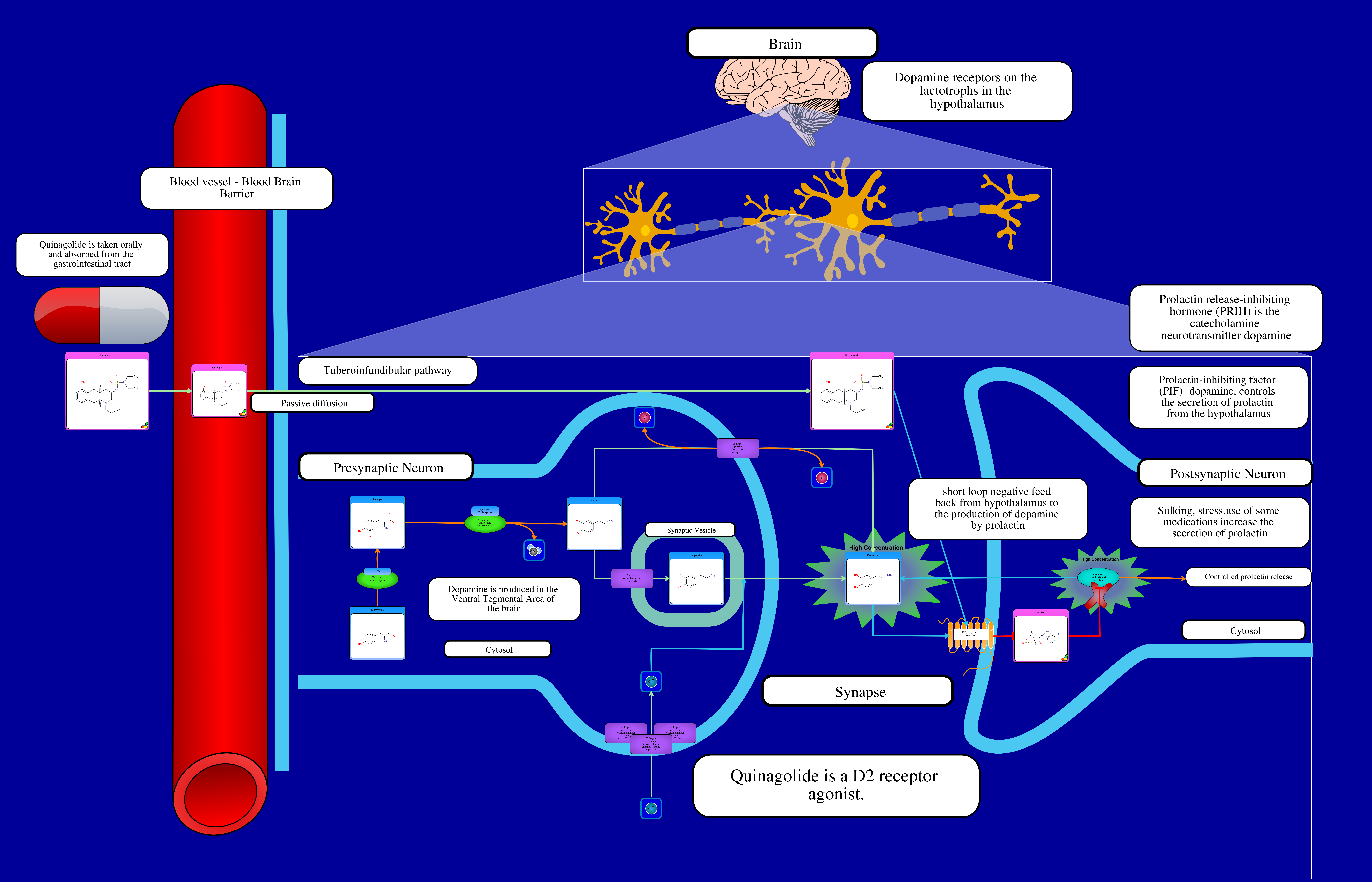 Newer dopamine receptor agonists such as quinagolide and Cabergoline are shown to effectively inhibit prolactin secretion with improved efficacy over Bromocriptine. These drugs are effective in patients who are intolerant or resistant to Bromocriptine. Quinagolide exists as a racemate and its relevant clinical activity is mediated predominantly by the (-) enantiomer. It is typically present in the hydrochloride salt form and is marketed as oral tablets. Quinagolide is a non-ergot-derived selective dopamine D2 receptor agonist used for the treatment of elevated levels of prolactin or hyperprolactinaemia. Quinagolide achieves long-lasting reduction in prolactin levels in a dose-proportional effect via selectively targeting D2 receptors as an agonist. It potently suppresses both basal and stimulated serum prolactin levels by exerting a strong inhibitory effect on the secretion of the anterior pituitary hormone prolactin. Prolactin secretion from the lactotroph cells present in the anterior pituitary gland is under tonic inhibitory control mediated by dopaminergic signalling via D2 receptors. Quinagolide selectively binds to D2 receptors expressed on the surface of lactotroph cells with high affinity which results in reduced adenylyl cyclase activity, reduced intracellular cyclic adenosine monophosphate and inhibited prolactin secretion. It also binds to D1 receptors but with low affinity and little clinical relevance.