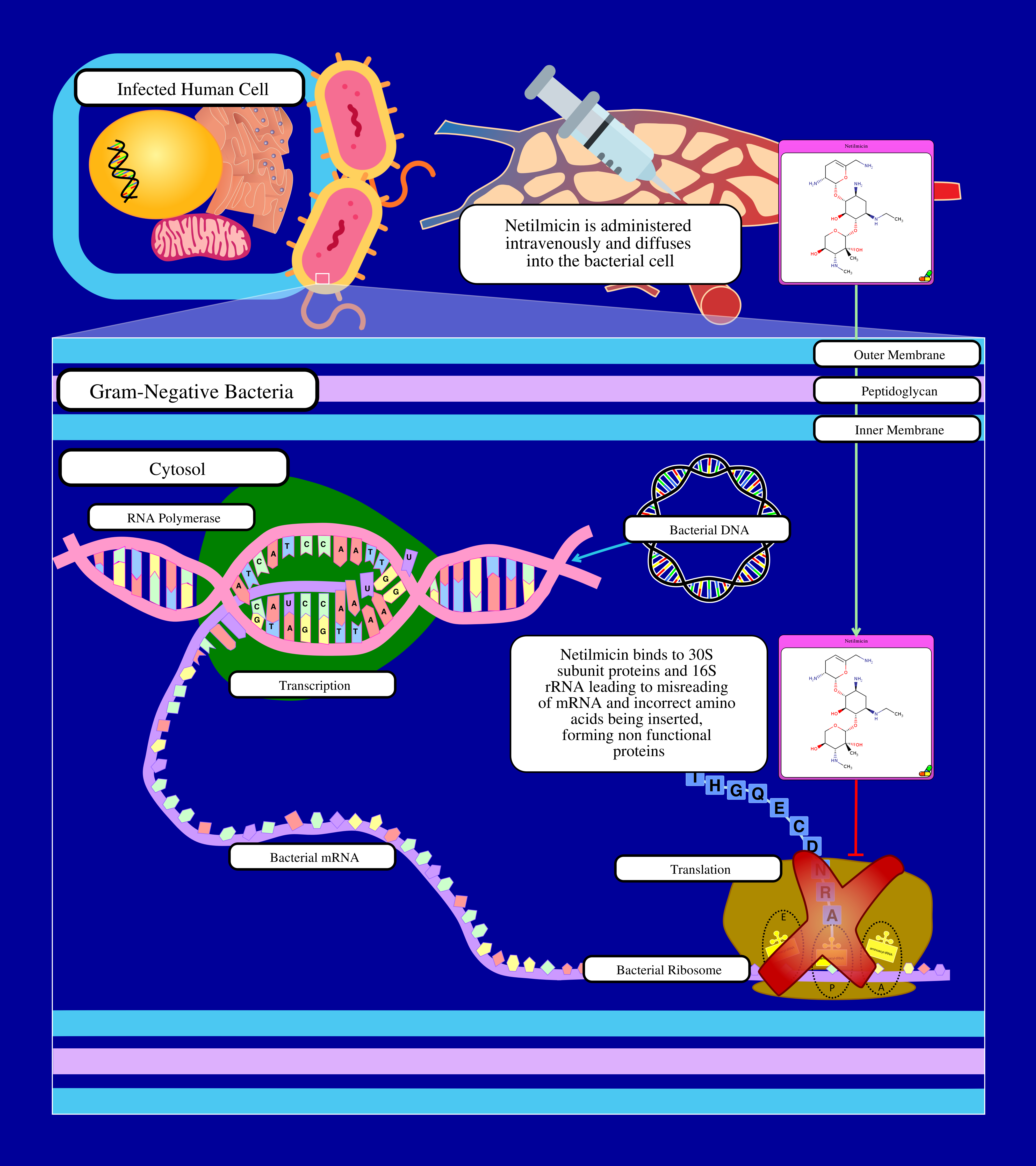 Netilmicin is a semisynthetic aminoglycoside that is used to treat bacterial infections within the body such as bacteremia, septicemia, respiratory tract infections, skin and soft tissue infections, burns, wounds, and peri-operative infections. It is a 1-N-ethyl derivative of sisomycin, that is similar to that of gentamicin except for the reduced ototoxicity and nephrotoxicity. Its mechanism of action is to inhibit protein synthesis by irreversibly binding to the 30S ribosomal subunit (protein S12) and interfering with the mRNA binding and acceptor tRNA sites. Due to its interference with mRNA binding and tRNA wobble base pairing this leads to misreading and early termination of peptides that are rendered nonfunctional or toxic, stunting the bacterial growth and development. It is commonly administered intramuscularly and is rapidly absorbed.