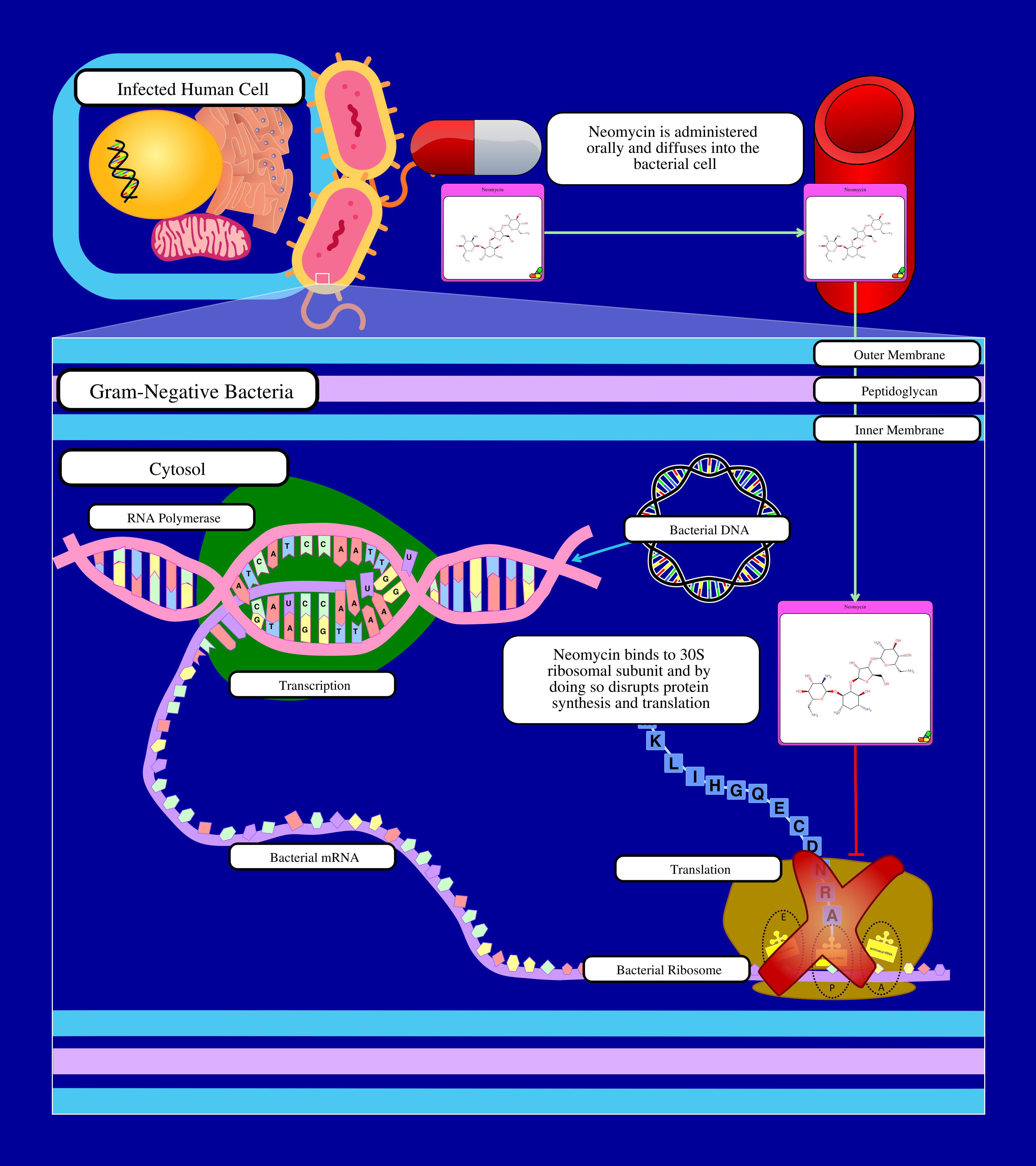 Neomycin is an antibiotic agent from the aminoglycoside family. It is administered as an oral tablet and as a topical ointment to treat bacterial infections. Neomycin is derived from Streptomyces fradiae by-products. There are three components A, B, and C, component B is the most active. This aminoglycoside is effective against gram-positive and gram-negative bacteria. It acts by binding to the 30S ribosomal subunit disrupting protein synthesis and inhibiting further translation. Specifically, this drug binds the 30S ribosomal protein S12. Due to its low absorption, overdosing is unlikely to occur, although a prolonged administration can cause the risk of neurotoxicity, ototoxicity, and nephrotoxicity in humans.