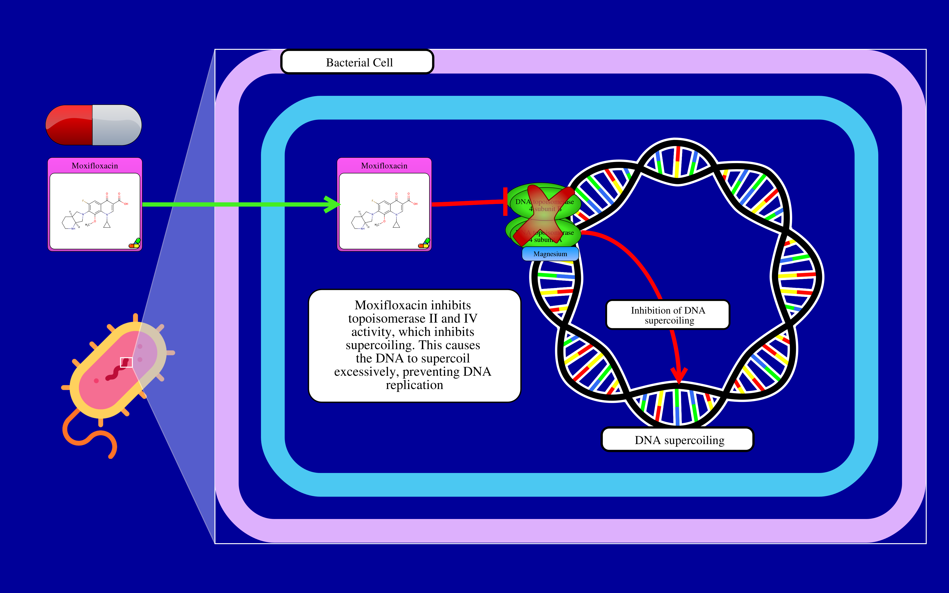 Moxifloxacin is a fluoroquinolone antibiotic used to treat various bacterial infections. Moxifloxacin inhibits DNA gyrase (topoisomerase II) and topoisomerase IV. These proteins prevent supercoiling in bacterial DNA. The inhibition of DNA gyrase (topoisomerase II) and topoisomerase IV causes supercoiling of the bacterial DNA. This prevents DNA replication.