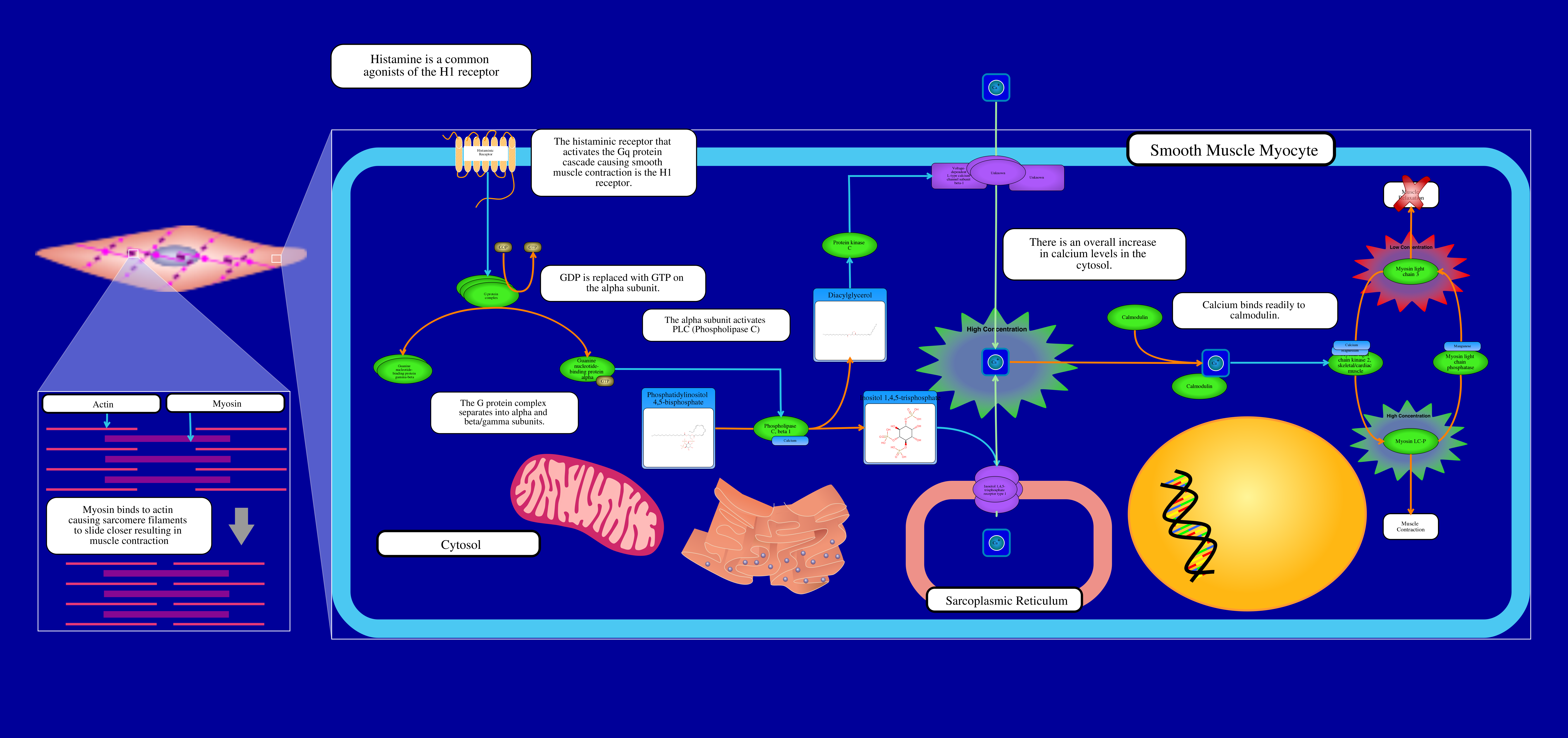The H1 receptor is a histamine receptor belonging to the family of rhodopsin-like G-protein-coupled receptors. This receptor is activated by the biogenic amine histamine. It is expressed in smooth muscles, on vascular endothelial cells, in the heart, and in the central nervous system. The H1 receptor is linked to an intracellular G-protein (Gq) that activates phospholipase C and the inositol triphosphate (IP3) signalling pathway. Histamine H1 receptors are activated by endogenous histamine, which is released by neurons that have their cell bodies in the tuberomammillary nucleus of the hypothalamus. Gq protein alpha subunit is a family of heterotrimeric G protein alpha subunits. This family is also commonly called the Gq/11 (Gq/G11) family or Gq/11/14/15 family to include closely related family members. G alpha subunits may be referred to as Gq alpha, Gαq, or Gqα. Gq proteins couple to G protein-coupled receptors to activate beta-type phospholipase C (PLC-β) enzymes. PLC-β in turn hydrolyzes phosphatidylinositol 4,5-bisphosphate (PIP2) to diacyl glycerol (DAG) and inositol trisphosphate (IP3). IP3 acts as a second messenger to release stored calcium into the cytoplasm, while DAG acts as a second messenger that activates protein kinase C (PKC). The general function of Gq is to activate intracellular signaling pathways in response to activation of cell surface G protein-coupled receptors (GPCRs). GPCRs function as part of a three-component system of receptor-transducer-effector. The transducer in this system is a heterotrimeric G protein, composed of three subunits: a Gα protein such as Gαq, and a complex of two tightly linked proteins called Gβ and Gγ in a Gβγ complex. When not stimulated by a receptor, Gα is bound to guanosine diphosphate (GDP) and to Gβγ to form the inactive G protein trimer. When the receptor binds an activating ligand outside the cell (such as a hormone or neurotransmitter), the activated receptor acts as a guanine nucleotide exchange factor to promote GDP release from and guanosine triphosphate (GTP) binding to Gα, which drives dissociation of GTP-bound Gα from Gβγ. Gq/11/14/15 proteins all activate beta-type phospholipase C (PLC-β) to signal through calcium and PKC signaling pathways. PLC-β then cleaves a specific plasma membrane phospholipid, phosphatidylinositol 4,5-bisphosphate (PIP2) into diacyl glycerol (DAG) and inositol 1,4,5-trisphosphate (IP3). DAG remains bound to the membrane, and IP3 is released as a soluble molecule into the cytoplasm. IP3 diffuses to bind to IP3 receptors, a specialized calcium channel in the endoplasmic reticulum (ER). These channels are specific to calcium and only allow the passage of calcium from the ER into the cytoplasm. Since cells actively sequester calcium in the ER to keep cytoplasmic levels low, this release causes the cytosolic concentration of calcium to increase, causing a cascade of intracellular changes and activity through calcium binding proteins and calcium-sensitive processes. The functions of H1 activating the Gq signalling cascade in smooth muscle include ileum contraction and bronchoconstriction mainly.