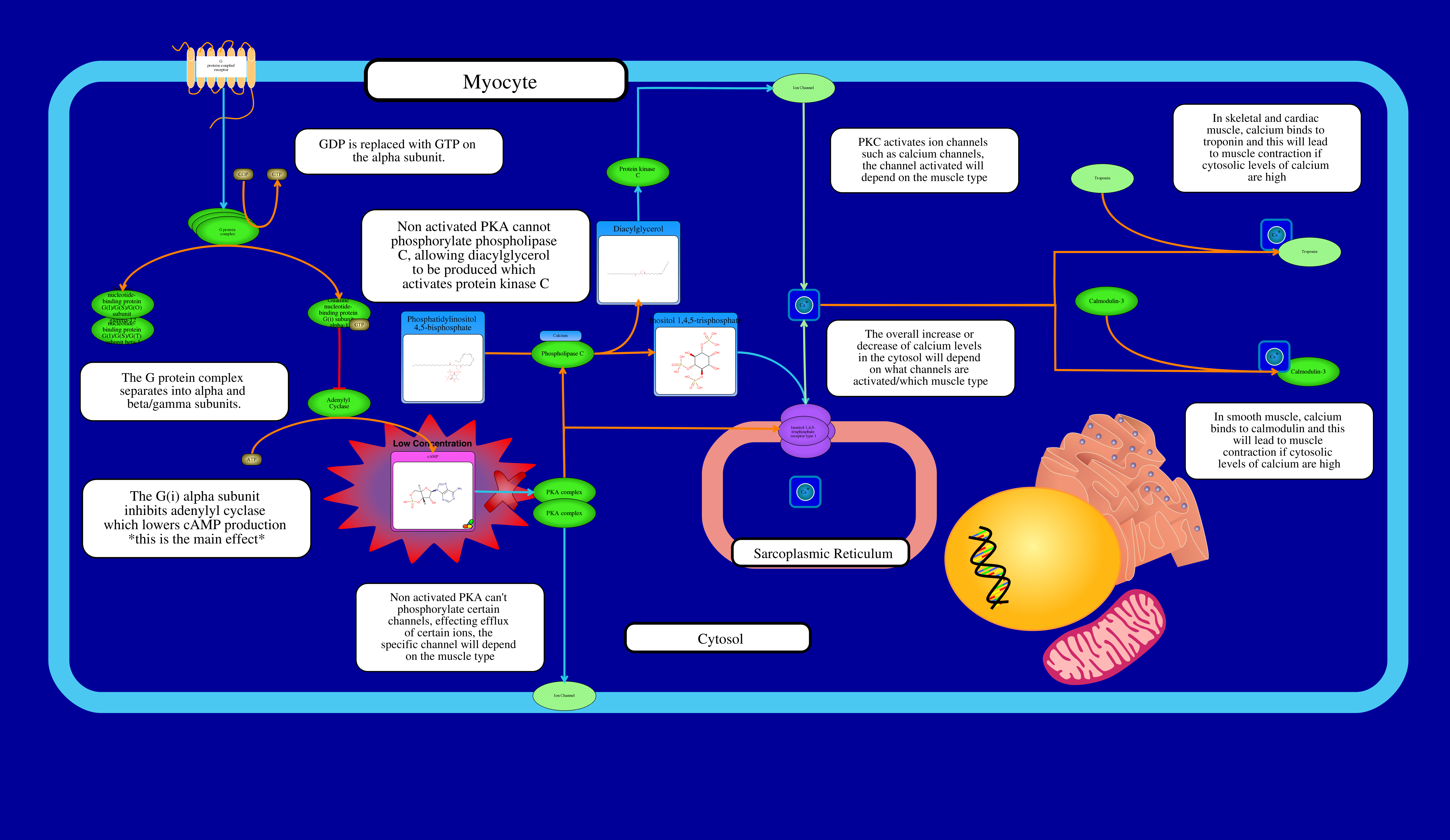 G proteins, also known as guanine nucleotide-binding proteins, are a family of proteins that act as molecular switches inside cells, and are involved in transmitting signals from a variety of stimuli outside a cell to its interior. Their activity is regulated by factors that control their ability to bind to and hydrolyze guanosine triphosphate (GTP) to guanosine diphosphate (GDP). When they are bound to GTP, they are 'on', and, when they are bound to GDP, they are 'off'. G proteins belong to the larger group of enzymes called GTPases. Heterotrimeric G proteins located within the cell are activated by G protein-coupled receptors (GPCRs) that span the cell membrane. Signaling molecules bind to a domain of the GPCR located outside the cell, and an intracellular GPCR domain then in turn activates a particular G protein. Some active-state GPCRs have also been shown to be "pre-coupled" with G proteins, whereas in other cases a collision coupling mechanism is thought to occur. The G protein triggers a cascade of further signaling events that finally results in a change in cell function. G protein-coupled receptors and G proteins working together transmit signals from many hormones, neurotransmitters, and other signaling factors. G proteins regulate metabolic enzymes, ion channels, transporter proteins, and other parts of the cell machinery, controlling transcription, motility, contractility, and secretion, which in turn regulate diverse systemic functions such as embryonic development, learning and memory, and homeostasis. Receptor-activated G proteins are bound to the inner surface of the cell membrane. They consist of the Gα and the tightly associated Gβγ subunits. There are four main families of Gα subunits: Gαs (G stimulatory), Gαi (G inhibitory), Gαq/11, and Gα12/13. They behave differently in the recognition of the effector molecule, but share a similar mechanism of activation. When a ligand activates the G protein-coupled receptor, it induces a conformational change in the receptor that allows the receptor to function as a guanine nucleotide exchange factor (GEF) that exchanges GDP for GTP. The GTP (or GDP) is bound to the Gα subunit in the traditional view of heterotrimeric GPCR activation. This exchange triggers the dissociation of the Gα subunit (which is bound to GTP) from the Gβγ dimer and the receptor as a whole. Both Gα-GTP and Gβγ can then activate different signaling cascades (or second messenger pathways) and effector proteins, while the receptor is able to activate the next G protein. Gi protein alpha subunit is a family of heterotrimeric G protein alpha subunits. This family is also commonly called the Gi/o (Gi /Go ) family or Gi/o/z/t family to include closely related family members. G alpha subunits may be referred to as Gi alpha, Gαi, or Giα. Gi proteins primarily inhibit the cAMP dependent pathway by inhibiting adenylyl cyclase activity, decreasing the production of cAMP from ATP, which, in turn, results in decreased activity of cAMP-dependent protein kinase. Therefore, the ultimate effect of Gi is the inhibition of the cAMP-dependent protein kinase. The Gβγ liberated by activation of Gi and Go proteins is particularly able to activate downstream signaling to effectors such as G protein-coupled inwardly-rectifying potassium channels (GIRKs). Gi and Go proteins are substrates for pertussis toxin, produced by Bordetella pertussis, the infectious agent in whooping cough. Pertussis toxin is an ADP-ribosylase enzyme that adds an ADP-ribose moiety to a particular cysteine residue in Giα and Goα proteins, preventing their coupling to and activation by GPCRs, thus turning off Gi and Go cell signaling pathways. Activation of Gi proteins in vascular smooth muscle cells often results in vasoconstriction. This is because reduced cAMP levels and decreased PKA activity lead to increased intracellular calcium concentrations, promoting smooth muscle contraction. In summary, while Gi signaling plays a role in both smooth and cardiac muscle tissues, its specific effects and functions differ due to the distinct roles and regulatory mechanisms of these muscles. In smooth muscle, Gi signaling often leads to vasoconstriction, while in cardiac muscle, it primarily regulates heart rate through the inhibition of If channels in the SA node, resulting in a negative chronotropic effect.