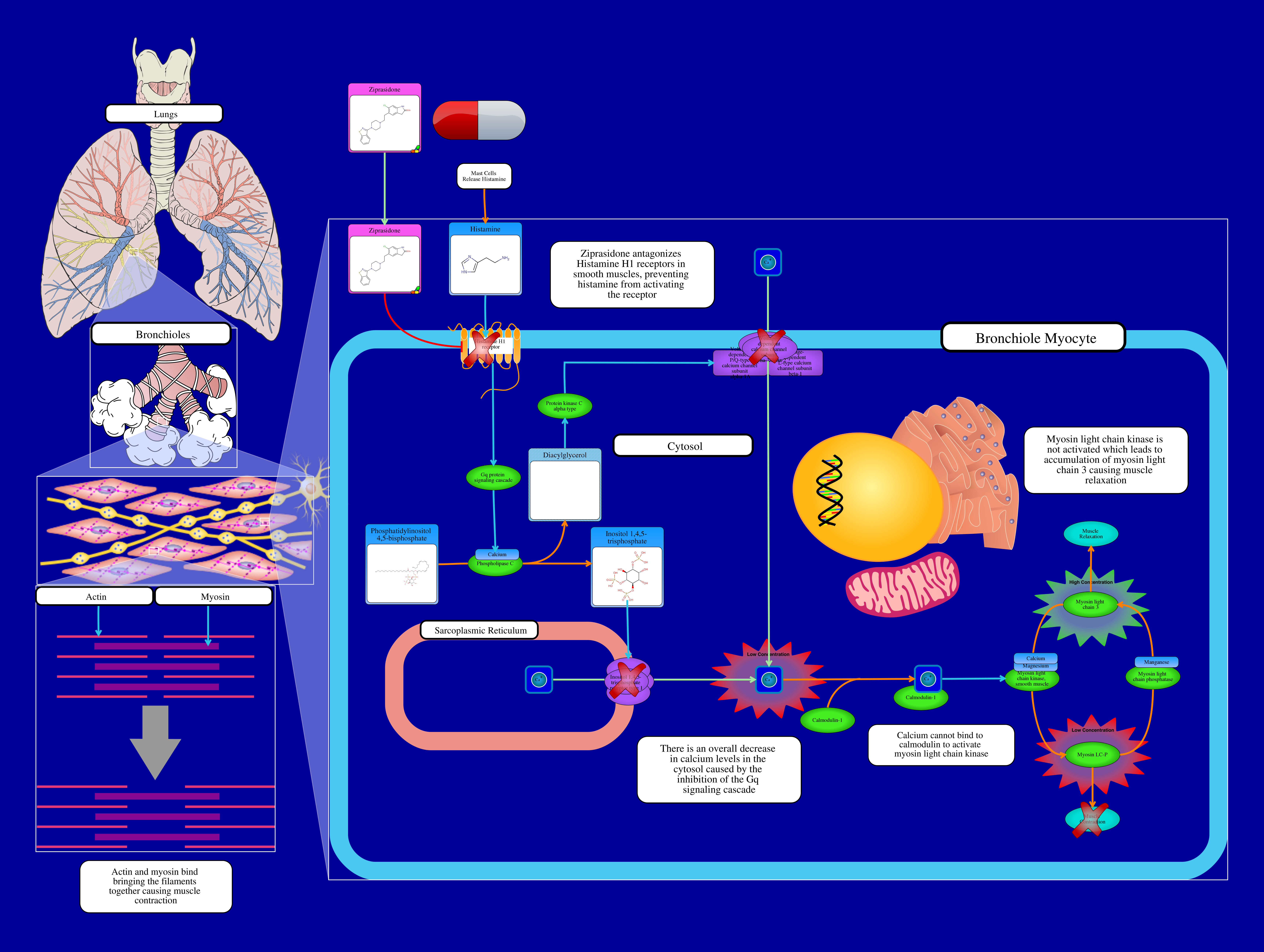 H1-antihistamines interfere with the agonist action of histamine at the H1 receptor and are administered to attenuate inflammatory process in order to treat conditions such as allergic rhinitis, allergic conjunctivitis, and urticaria. H1-antihistamines act on H1 receptors in T-cells to inhibit the immune response, in blood vessels to constrict dilated blood vessels, and in smooth muscles of lungs and intestines to relax those muscles. Allergies causes blood vessel dilation which causes swelling (edema) and fluid leakage. Ziprasidone also inhibits the H1 histamine receptor on bronchiole smooth muscle myocytes. This normally activates the Gq signalling cascade which activates phospholipase C which catalyzes the production of Inositol 1,4,5-trisphosphate (IP3) and Diacylglycerol (DAG). Because of the inhibition, IP3 doesn't activate the release of calcium from the sarcoplasmic reticulum, and DAG doesn't activate the release of calcium into the cytosol of the endothelial cell. This causes a low concentration of calcium in the cytosol, and it, therefore, cannot bind to calmodulin.Calcium bound calmodulin is required for the activation of myosin light chain kinase. This prevents the phosphorylation of myosin light chain 3, causing an accumulation of myosin light chain 3. This causes muscle relaxation, opening up the bronchioles in the lungs, making breathing easier.