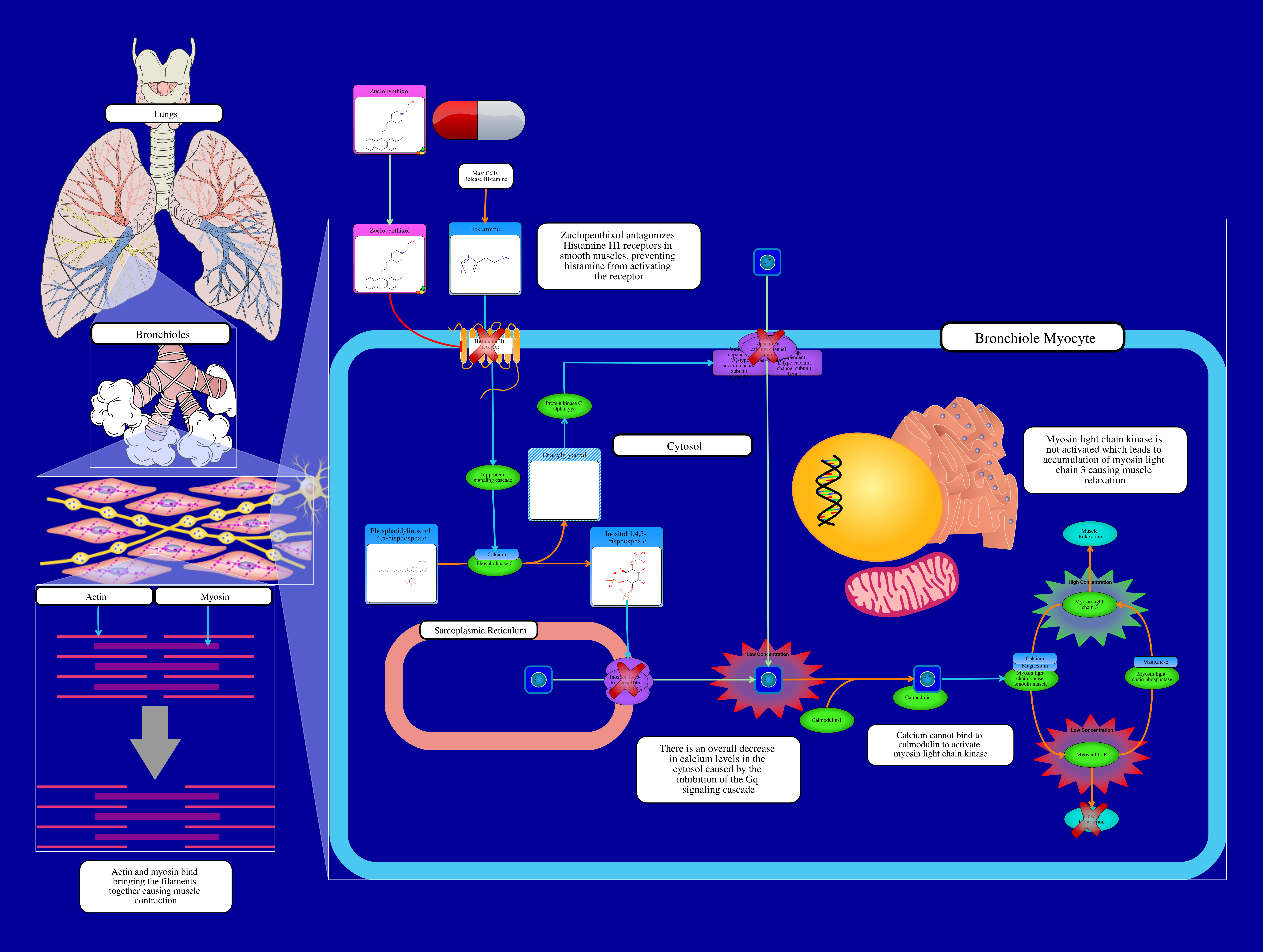 H1-antihistamines interfere with the agonist action of histamine at the H1 receptor and are administered to attenuate inflammatory process in order to treat conditions such as allergic rhinitis, allergic conjunctivitis, and urticaria. H1-antihistamines act on H1 receptors in T-cells to inhibit the immune response, in blood vessels to constrict dilated blood vessels, and in smooth muscles of lungs and intestines to relax those muscles. Allergies causes blood vessel dilation which causes swelling (edema) and fluid leakage. Zuclopenthixol also inhibits the H1 histamine receptor on bronchiole smooth muscle myocytes. This normally activates the Gq signalling cascade which activates phospholipase C which catalyzes the production of Inositol 1,4,5-trisphosphate (IP3) and Diacylglycerol (DAG). Because of the inhibition, IP3 doesn't activate the release of calcium from the sarcoplasmic reticulum, and DAG doesn't activate the release of calcium into the cytosol of the endothelial cell. This causes a low concentration of calcium in the cytosol, and it, therefore, cannot bind to calmodulin.Calcium bound calmodulin is required for the activation of myosin light chain kinase. This prevents the phosphorylation of myosin light chain 3, causing an accumulation of myosin light chain 3. This causes muscle relaxation, opening up the bronchioles in the lungs, making breathing easier.