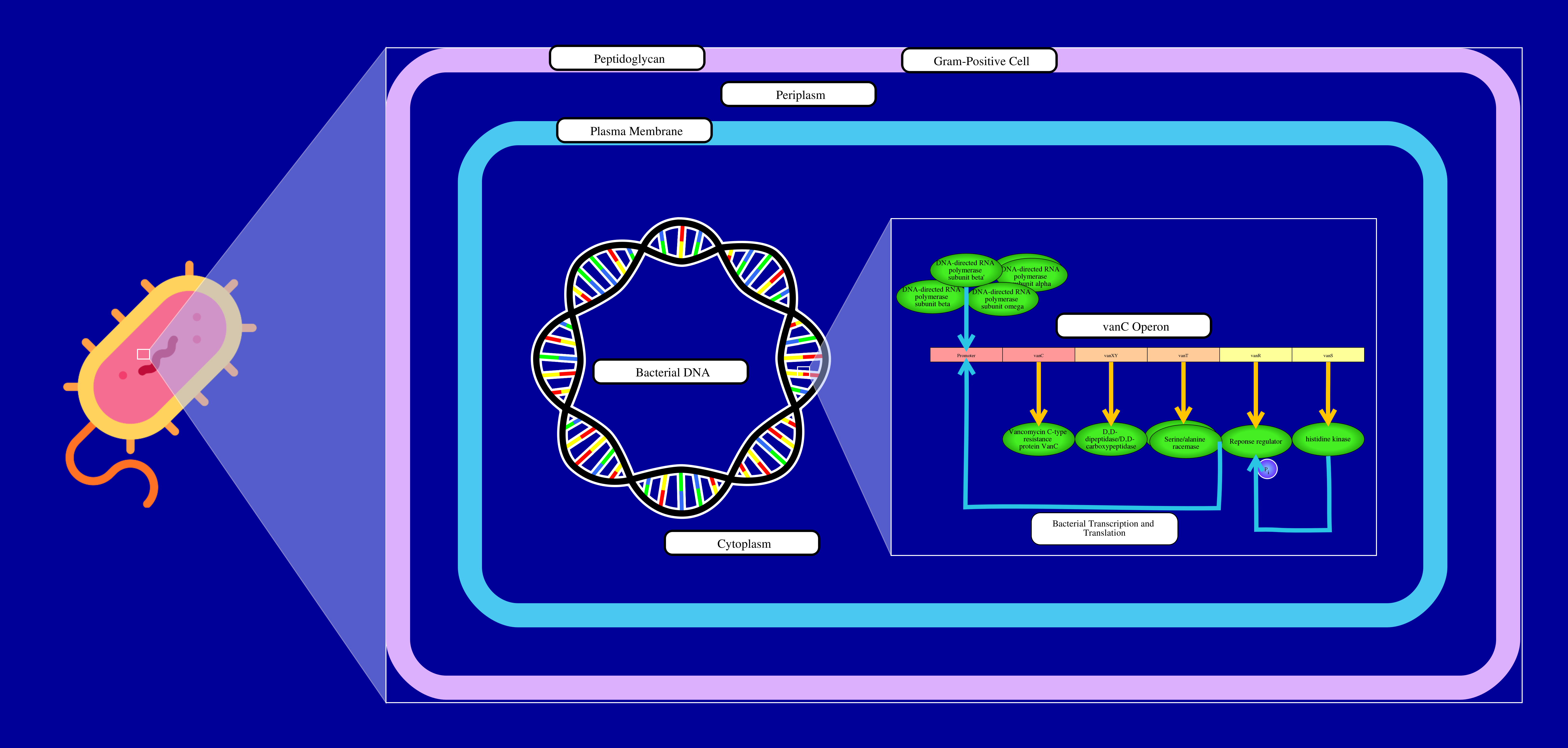 The VanC-type vancomycin resistance pathway enables enterococcal bacteria to resist the action of the glycopeptide antibiotic vancomycin. This pathway involves a series of genes organized in an the VanC operon, which encodes enzymes and regulatory proteins that alter the bacterial cell wall, making it resistant to vancomycin. The operon is made up of 5 genes which can be divided into regulatory (vanR and vanS) and resistance (vanC, vanT and vanXY). The vanR gene is a response regulator that is part of a two-component regulatory system and activates transcription once phosphorylated by histidine kinase that is encoded by vanS, after detecting vancomycin. vanC gene encodes a D-Ala-D-Ser ligase, which synthesizes D-Ala-D-Ser (D-alanine-D-serine) dipeptides instead of the usual D-Ala-D-Ala in the peptidoglycan precursor, which has reduced affinity for vancomycin and is added to UDP-MurNAc-tripeptide.vanXY gene encodes a bifunctional D,D-dipeptidase and D,D-carboxypeptidase that hydrolyzes any remaining D-Ala-D-Ala dipeptides and removes D-alanine from peptidoglycan precursors (UDP-MurNAc-pentapeptide[d-Ala]), ensuring that only D-Ala-D-Ser is incorporated into the cell wall. Lastly, VanT encodes a serine racemase that is membrane-bound and supplies d-Ser for the synthesis pathway.