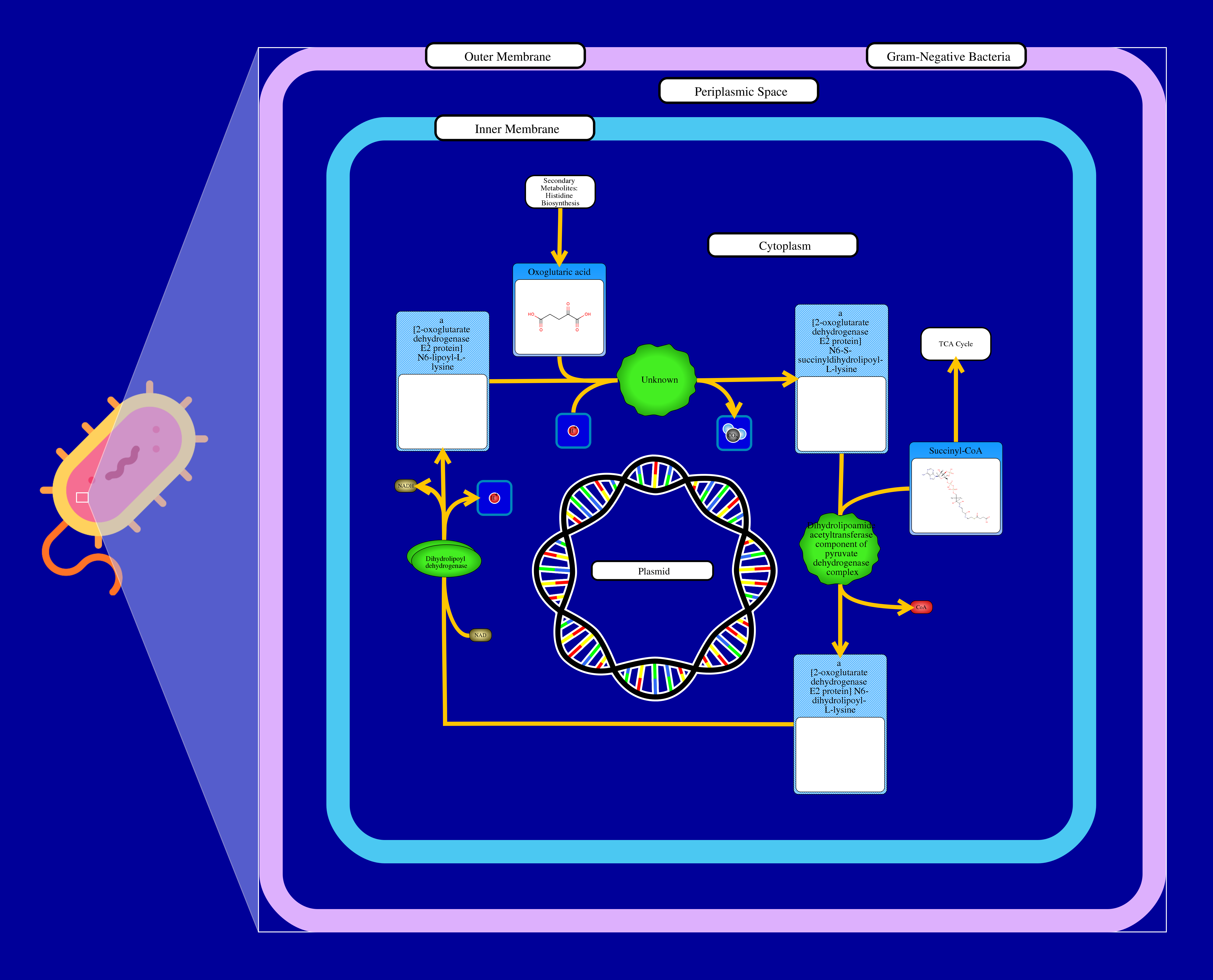 2-oxoglutarate dehydrogenase complex is consisted of oxoglutarate decarboxylase, dihydrolipoyl succinyltransferase and dihydrolipoyl dehydrogenase), which is a rate-limiting enzyme of the citric acid cycle (TCA cycle) in prokaryote. The reaction that catalyzed by 2-oxoglutarate dehydrogenase complex can be generalized as 2-oxoglutarate + coenzyme A + NAD+ → succinyl-CoA + CO2 + NADH. During the OGDHC reaction cycle, 2-oxoglutarate is bound and decarboxylated by E1(o), a thiamin-diphosphate cofactor containing enzyme. The succinyl group is transferred to the lipoyl domain of E2(o) where it is carried to the active site and transferred to coenzyme A, forming succinyl-CoA. During this transfer the lipoyl group is reduced to dihydrolipoyl. The succinyl-CoA is released and the lipoyl domain of E2(o) is oxidized by E3 via transfer of protons to NAD, forming NADH and regenerating the lipoyl group back to lipoyllysine for another cycle. Under aerobic growth conditions the OGDHC not only catalyzes a key reaction in the TCA cycle, it also provides succinyl-CoA for methionine and lysine biosynthesis, the latter pathway also leading to peptidoglycan biosynthesis. The synthesis of the OGDHC is repressed by anaerobiosis and is also subject to glucose repression. It is induced by aerobic growth on acetate. (EcoCyc)