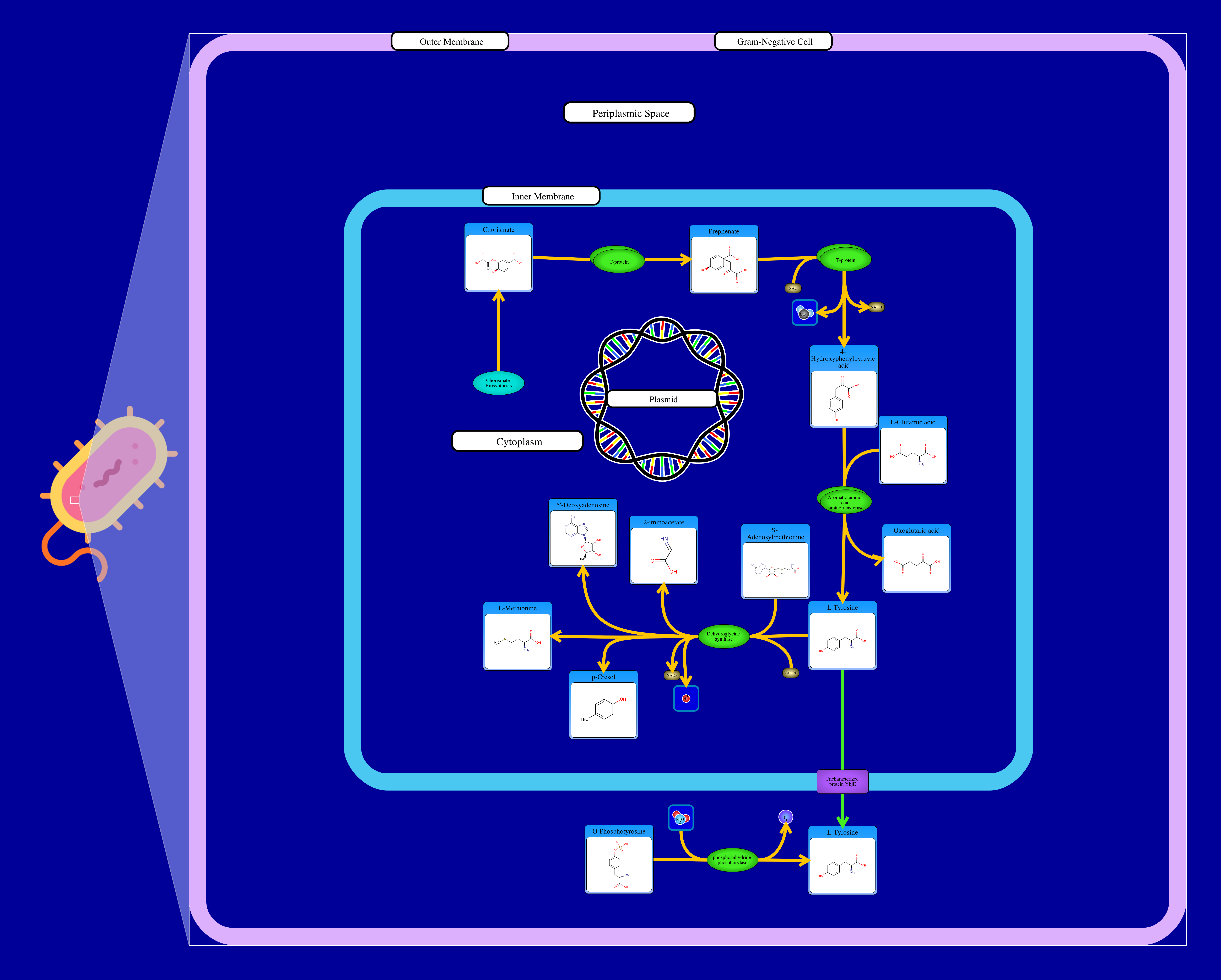 Tyrosine is one of the amino acid used in protein synthesis. The tyrosine biosynthesis pathways is connected with the chorismate biosynthesis pathway. Chorismate biosynthesis produce the chorismate, which can further be converted to prephenate by T-protein. Combined with cofactor, NAD, prephenate has been further converted to 4-Hydroxyphenylpyruvic acid by T-protein with generated NADH and carbon dioxide. Tyrosine aminotransferase catalyzes 4-Hydroxyphenylpyruvic acid to tyrosine, and also converts glutamic acid to oxoglutaric acid. Tyrosine will be further catalyzed into various molecules such as 2-iminoacetate, p-Cresol, 5'Deoxyadenosine and L-Methionine; or it will be exported from cell via the lysine exporter.