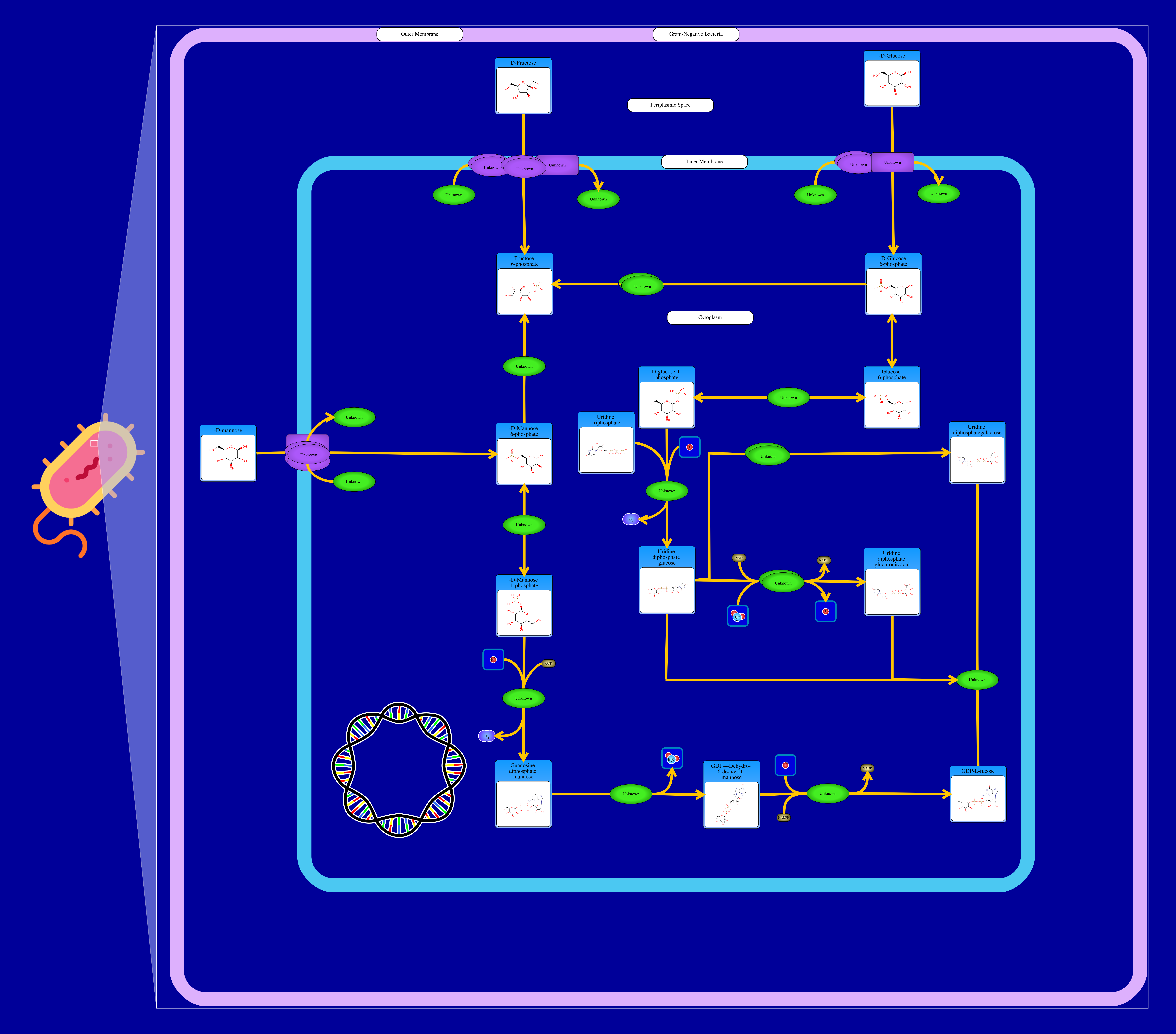 The colonic acid building blocks biosynthesis starts with a Beta-D-Glucose undergoing a transport reaction mediated by a glucose PTS permease. The permease phosphorylates the Beta-D-Glucose, producing a Beta-D-Glucose 6-phosphate. This compound can either change to an Alpha-D-Glucose 6-phosphate spontaneously or into a fructose 6-phosphate through a glucose-6-phosphate isomerase. The latter compound can also be present in E.coli through the interaction of D-fructose and a mannose PTS permease which phosphorylate the D-fructose.