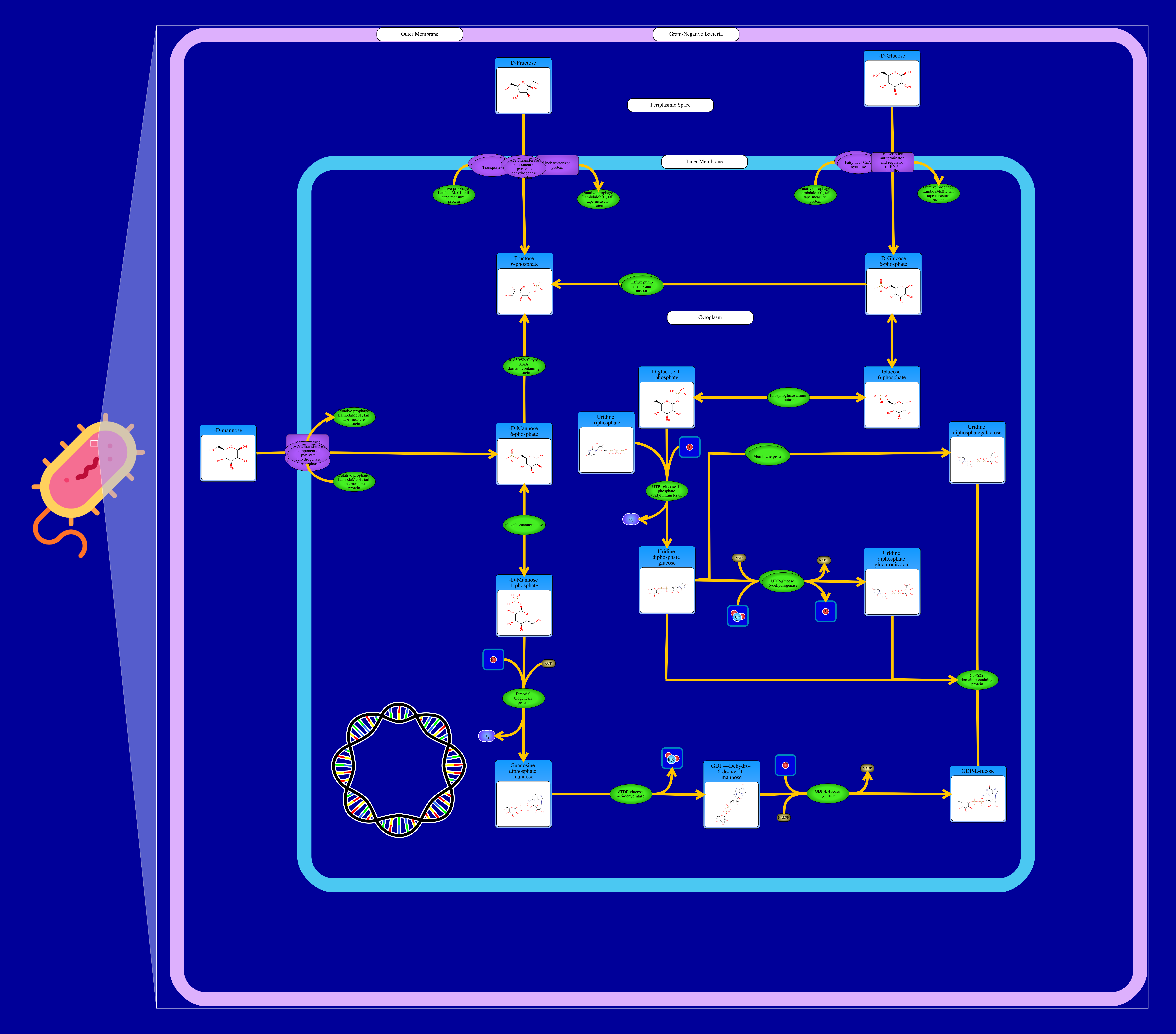 The colonic acid building blocks biosynthesis starts with a Beta-D-Glucose undergoing a transport reaction mediated by a glucose PTS permease. The permease phosphorylates the Beta-D-Glucose, producing a Beta-D-Glucose 6-phosphate. This compound can either change to an Alpha-D-Glucose 6-phosphate spontaneously or into a fructose 6-phosphate through a glucose-6-phosphate isomerase. The latter compound can also be present in E.coli through the interaction of D-fructose and a mannose PTS permease which phosphorylate the D-fructose.