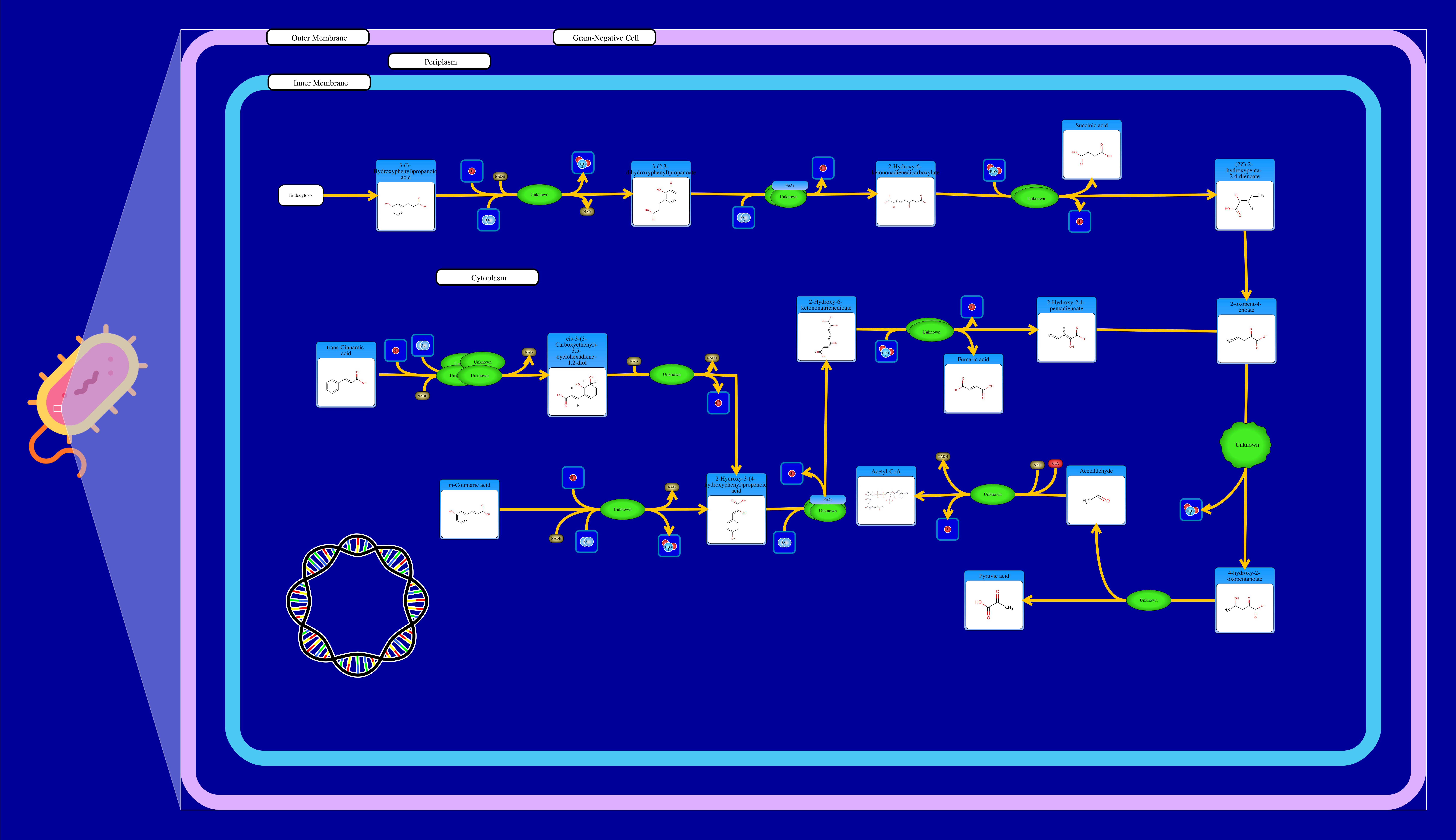The compound 2,3 dihydroxy-trans-cinnamate then interacts with an oxygen molecule through a 2,3-dihydroxyphenylpropionate 1,2-dioxygenase resulting in a hydrogen ion and a 2-hydroxy-6-oxonona-2,4,7-triene-1,9-dioate. The latter compound then interacts with a water molecule through a 2-hydroxy-6-oxononatrienedioate hydrolase resulting in a release of a hydrogen ion, a fumarate molecule and (2Z)-2-hydroxypenta-2,4-dienoate. The latter compound reacts spontaneously to isomerize into a 2-oxopent-4-enoate. This compound is then hydrated through a 2-oxopent-4-enoate hydratase resulting in a 4-hydroxy-2-oxopentanoate. This compound then interacts with a 4-hydroxy-2-ketovalerate aldolase resulting in the release of a pyruvate, and an acetaldehyde. The acetaldehyde then interacts with a coenzyme A and a NAD molecule through a acetaldehyde dehydrogenase resulting in a hydrogen ion, a NADH and an acetyl-coa which can be incorporated into the TCA cycle