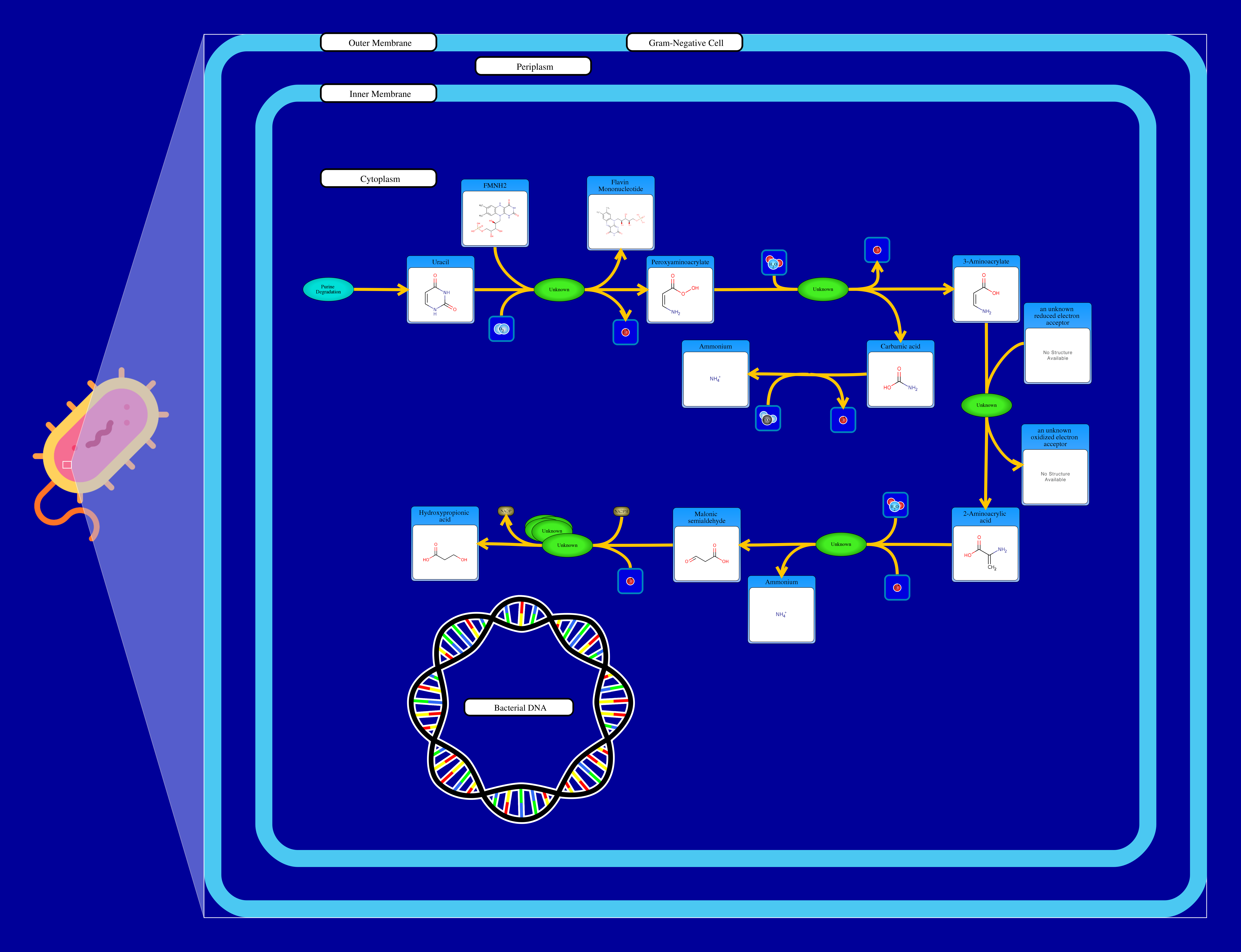 Uracil is a pyrimidine nucleobase found in RNA, and can be used as a source of nitrogen for E. coli. There are at least three pathways through which uracil is degraded. This one begins with uracil, which originates from purine degradation. The putative monooxygenase enzyme rutA catalyzes the breakdown of uracil into peroxyaminoacrylate, using FMNH2 as a cofactor. Peroxyaminoacrylate is then broken down into both carbamic acid and 3-aminoacrylate following the addition of a water molecule by the putative isochorismatase family protein rutB. Carbamic acid can then spontaneously, with the addition of a hydrogen ion, split into an ammonium ion and a molecule of carbon dioxide. 3-aminoacrylate, on the other hand, is catalyzed by the UPF0076 protein rutC to form 2-aminoacrylic acid. This compound enters into a reaction catalyzed by protein rutD, which adds a water molecule and hydrogen ion and forms malonic semialdehyde with ammonium being a byproduct. Finally, the putative NADH dehydrogenase/NAD(P)H nitroreductase rutE complex converts malonic semialdehyde into hydroxypropionic acid, which is then used to form other necessary chemicals. The ammonium ions produced will be the important source of nitrogen for the bacteria.