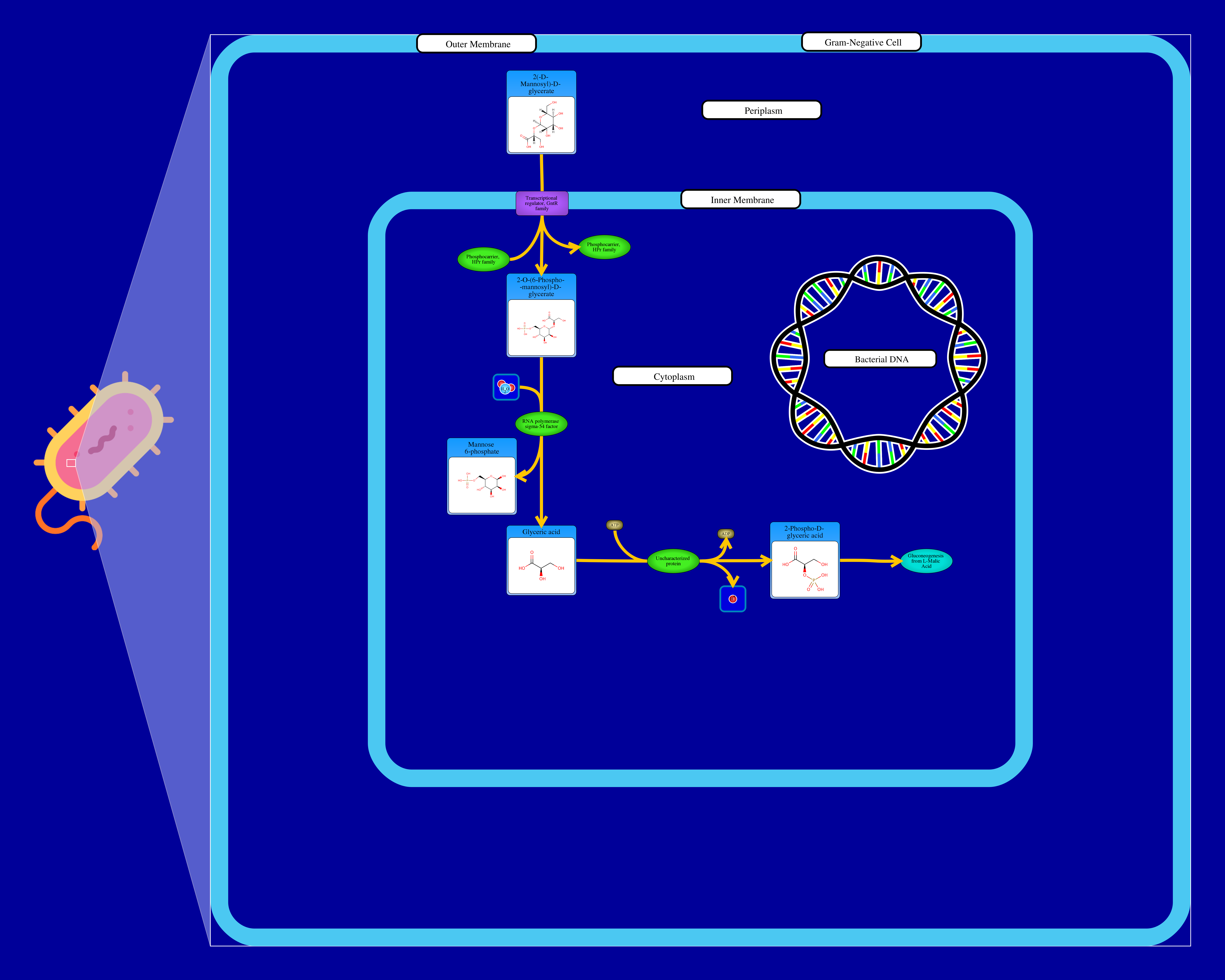 2-O-α-Mannosyl-D-glycerate (MG; also named as Alpha-Mannosylglycerate) is an organic compound that will affect the osmosis in hyperthermophilic archaea and bacteria. In E.coli, 2-O-α-mannosyl-D-glycerate PTS permease (mngA) import MG into cell, and then phosphorylate MG to 2-O-(6-phospho-α-mannosyl)-D-glycerate by phosphocarrier protein HPr. 2-O-(6-phospho-α-mannosyl)-D-glycerate is converted to glyceric acid as well as mannose 6-phosphate by alpha-mannosidase mngB. Finally, glyceric acid is catalyzed to 2-Phospho-D-glyceric acid with ATP as energy source by Glycerate kinase 2. E.coli can't use MG as osmotic stress protection, but it can use MG as a carbon source.