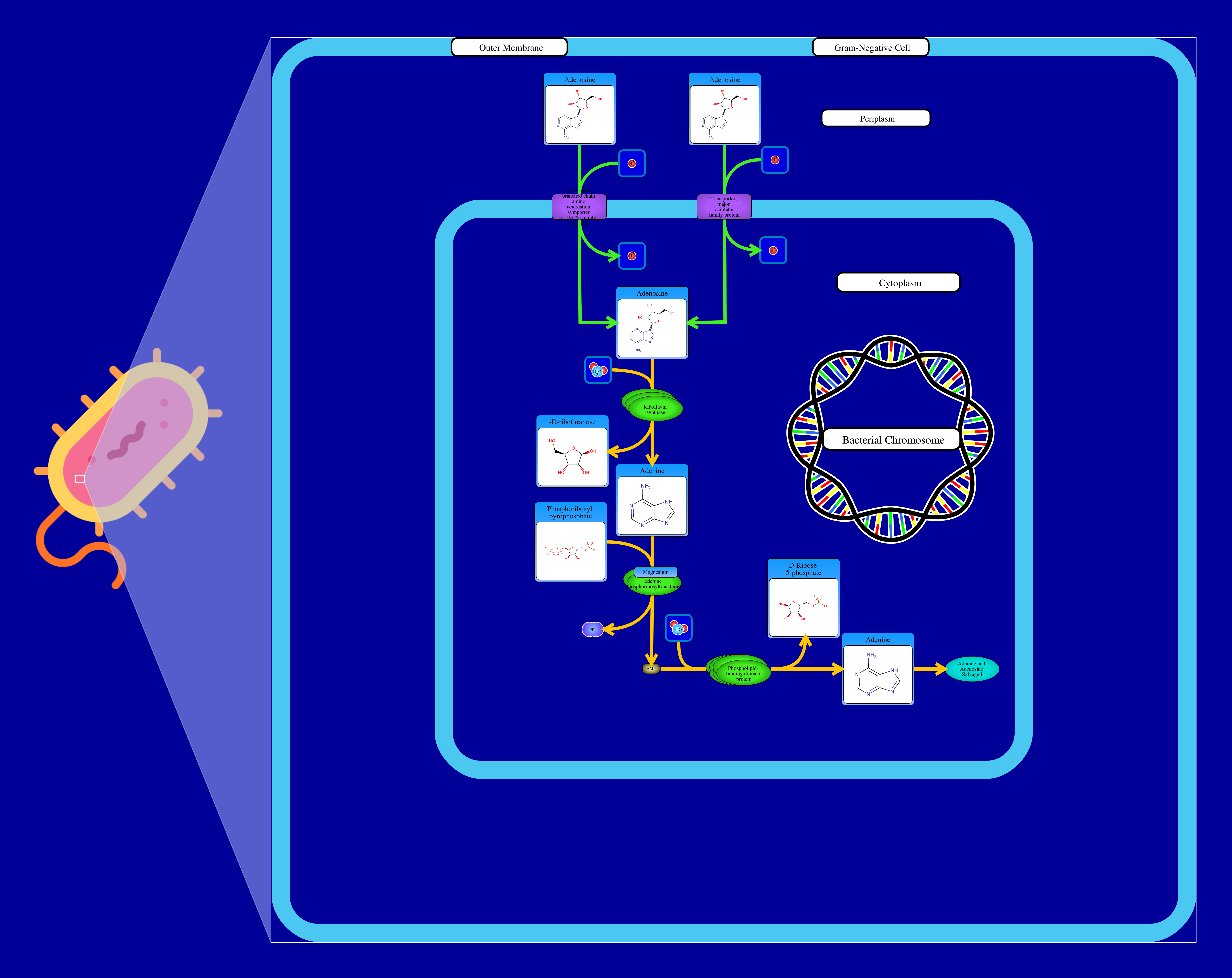 Adenosine is first incorporated into the cytosol through either a nupG or a nupC transporter. Once in the cytosol, adenosine is degraded into adenine by reacting with a water and a adenosine nucleosidase, releasing a D-ribofuranose and a adenine. The adenine then reacts with a PRPP through a adenine phosphoribosyltransferase resulting in the release of a pyrophosphate and an AMP . The AMP in turn reacts with a water molecule through a AMP nucleosidase resulting in the release of a D-ribofuranose 5-phosphate and a adenine.