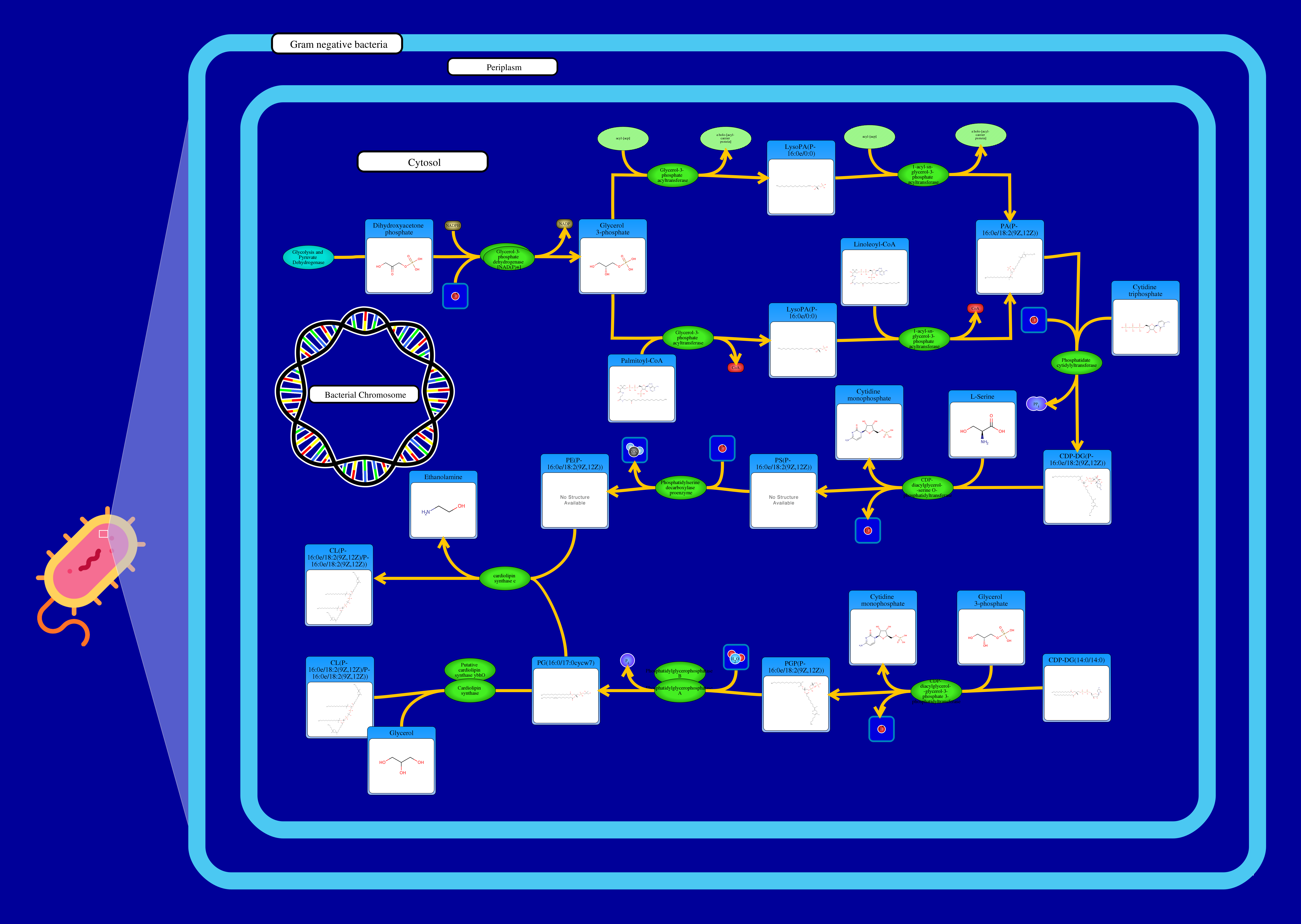 Phospholipids are membrane components in E. coli. The major phospholipids of E. coli are phosphatidylethanolamine, phosphatidylglycerol, and cardiolipin. All phospholipids contain sn-glycerol-3-phosphate esterified with fatty acids at the sn-1 and sn-2 positions. The reaction starts from a glycerone phosphate (dihydroxyacetone phosphate) produced in glycolysis. The glycerone phosphate is transformed into an sn-glycerol 3-phosphate (glycerol 3 phosphate) by NADPH-driven glycerol-3-phosphate dehydrogenase. sn-Glycerol 3-phosphate is transformed to a 1-acyl-sn-glycerol 3-phosphate (lysophosphatidic acid). This can be achieved by an sn-glycerol-3-phosphate acyltransferase that interacts either with a long-chain acyl-CoA or with an acyl-[acp]. The 1-acyl-sn-glycerol 3-phosphate is transformed into a 1,2-diacyl-sn-glycerol 3-phosphate (phosphatidic acid) through a 1-acylglycerol-3-phosphate O-acyltransferase. This compound is then converted into a CPD-diacylglycerol through a CTP phosphatidate cytididyltransferase. CPD-diacylglycerol can be transformed either into an L-1-phosphatidylserine or an L-1-phosphatidylglycerol-phosphate through a phosphatidylserine synthase or a phosphatidylglycerophosphate synthase, respectively. The L-1-phosphatidylserine transforms into L-1-phosphatidylethanolamine through a phosphatidylserine decarboxylase. On the other hand, L-1-phosphatidylglycerol-phosphate gets transformed into an L-1-phosphatidyl-glycerol through a phosphatidylglycerophosphatase. These 2 products combine to produce a cardiolipin and an ethanolamine. The L-1 phosphatidyl-glycerol can also interact with cardiolipin synthase resulting in a glycerol and a cardiolipin.