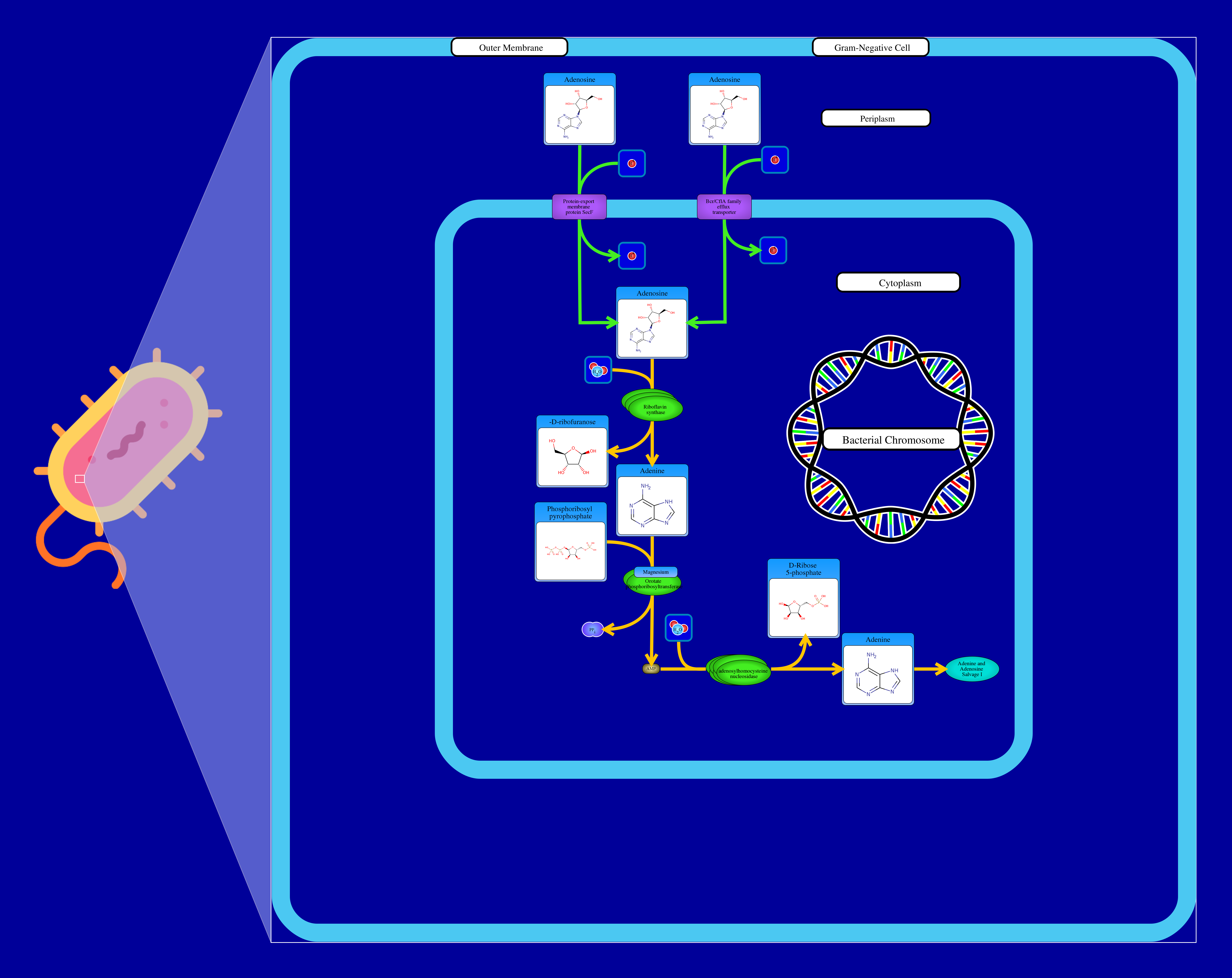 Adenosine is first incorporated into the cytosol through either a nupG or a nupC transporter. Once in the cytosol, adenosine is degraded into adenine by reacting with a water and a adenosine nucleosidase, releasing a D-ribofuranose and a adenine. The adenine then reacts with a PRPP through a adenine phosphoribosyltransferase resulting in the release of a pyrophosphate and an AMP . The AMP in turn reacts with a water molecule through a AMP nucleosidase resulting in the release of a D-ribofuranose 5-phosphate and a adenine.