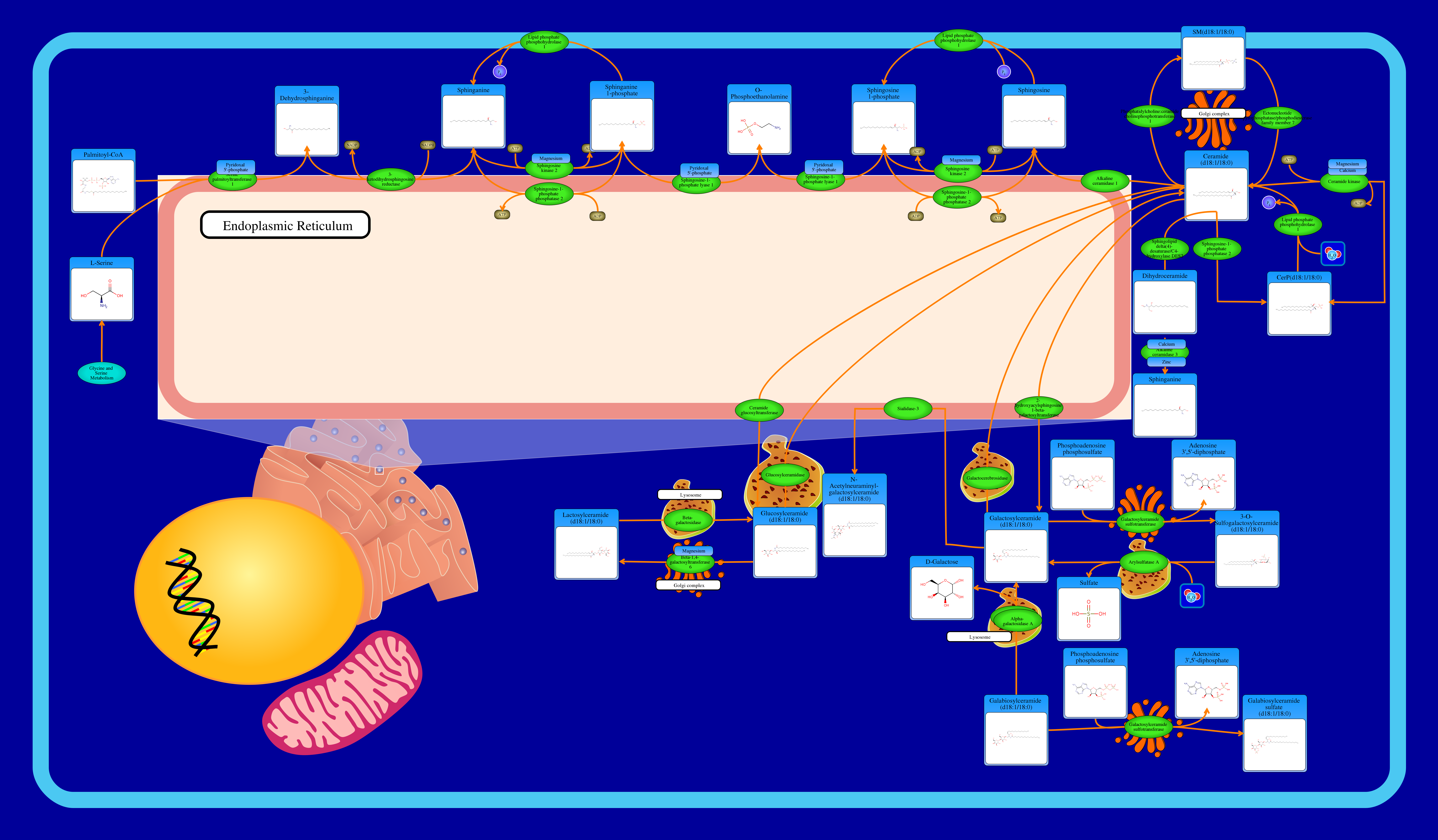 The sphingolipid metabolism pathway depicted here describes the synthesis of sphingolipids which include sphingomyelins, ceramides, phosphoceramides, glucosylceramides, galactosylceramides, sulfagalactosylceramides, lactosylceramides, and various other ceramides. The core of a sphingolipid is the long-chain amino alcohol called sphingosine. Amino acylation, with a long-chain fatty acid, at the 2-carbon position of sphingosine yields a ceramide. Sphingolipids are a component of all membranes but are particularly abundant in the myelin sheath. De novo sphingolipid synthesis begins at the cytoplasmic side of the ER (endoplasmic reticulum) with the formation of 3-keto-dihydrosphingosine (also known as 3-ketosphinganine) by the enzyme known as serine palmitoyltransferase (SPT). The preferred substrates for this reaction are palmitoyl-CoA and serine. Next, 3-keto-dihydrosphingosine is reduced to form dihydrosphingosine (also known as sphinganine) via the enzyme 3-ketodihydrosphingosine reductase (KDHR), which is also known as 3-ketosphinganine reductase. Dihydrosphingosine (sphinganine) is acylated by the action of several dihydroceramide synthases (CerS) to form dihydroceramide. Dihydroceramide is then desaturated in the original palmitic portion of the lipid via dihydroceramide desaturase 1 (DES1) to form ceramide. Following the conversion to ceramide, sphingosine is released via the action of ceramidase. Sphingosine can be re-converted into a ceramide by condensation with an acyl-CoA catalyzed by the various CerS enzymes. Ceramide may be phosphorylated by ceramide kinase to form ceramide-1-phosphate. Alternatively, it may be glycosylated by glucosylceramide synthase (to form a glucosylceramide) or galactosylceramide synthase (to form a galactosylceramide). Additionally, it can be converted to sphingomyelin by the addition of a phosphorylcholine headgroup by sphingomyelin synthase (SMS). Sphingomyelins are the only sphingolipids that are phospholipids. Diacylglycerol is also generated via this process. Alternately, ceramide may be broken down by a ceramidase to form sphingosine. Sphingosine may be phosphorylated to form sphingosine-1-phosphate, which may, in turn, be dephosphorylated to regenerate sphingosine. Sphingolipid catabolism allows the reversion of these metabolites to ceramide. The complex glycosphingolipids are hydrolyzed to glucosylceramide and galactosylceramide. These lipids are then hydrolyzed by beta-glucosidases and beta-galactosidases to regenerate ceramide. Similarly, sphingomyelins may be broken down by sphingomyelinase to create ceramides and phosphocholine. The only route by which sphingolipids are converted into non-sphingolipids is through sphingosine-1-phosphate lyase. This forms ethanolamine phosphate and hexadecenal.