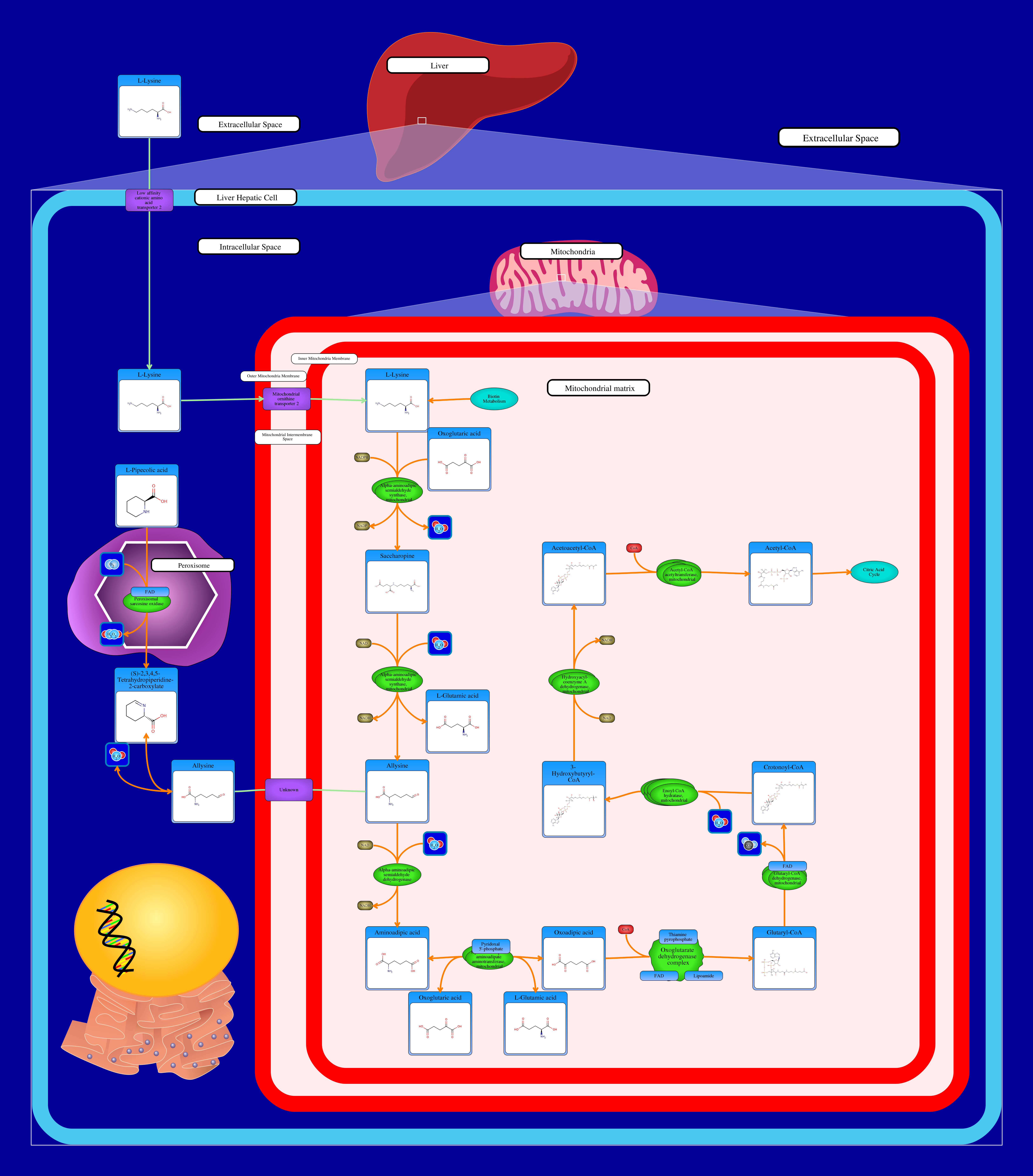 The degradation of L-lysine happens in liver and it is consisted of seven reactions. L-Lysine is imported into liver through low affinity cationic amino acid transporter 2 (cationic amino acid transporter 2/SLC7A2). Afterwards, L-lysine is imported into mitochondria via mitochondrial ornithine transporter 2. L-Lysine can also be obtained from biotin metabolism. L-Lysine and oxoglutaric acid will be combined to form saccharopine by facilitation of mitochondrial alpha-aminoadipic semialdehyde synthase, and then, mitochondrial alpha-aminoadipic semialdehyde synthase will further breaks saccharopine down to allysine and glutamic acid. Allysine will be degraded to form aminoadipic acid through alpha-aminoadipic semialdehyde dehydrogenase. Oxoadipic acid is formed from catalyzation of mitochondrial kynurenine/alpha-aminoadipate aminotransferase on aminoadipic acid. Oxoadipic acid will be further catalyzed to form glutaryl-CoA, and glutaryl-CoA converts to crotonoyl-CoA, and crotonoyl-CoA transformed to 3-hydroxybutyryl-CoA. 3-Hydroxybutyryl-CoA will form Acetyl-CoA as the final product through the intermediate compound: acetoacetyl-CoA. Acetyl-CoA will undergo citric acid cycle metabolism. Carnitine is another key byproduct of lysine metabolism (not shown in this pathway).