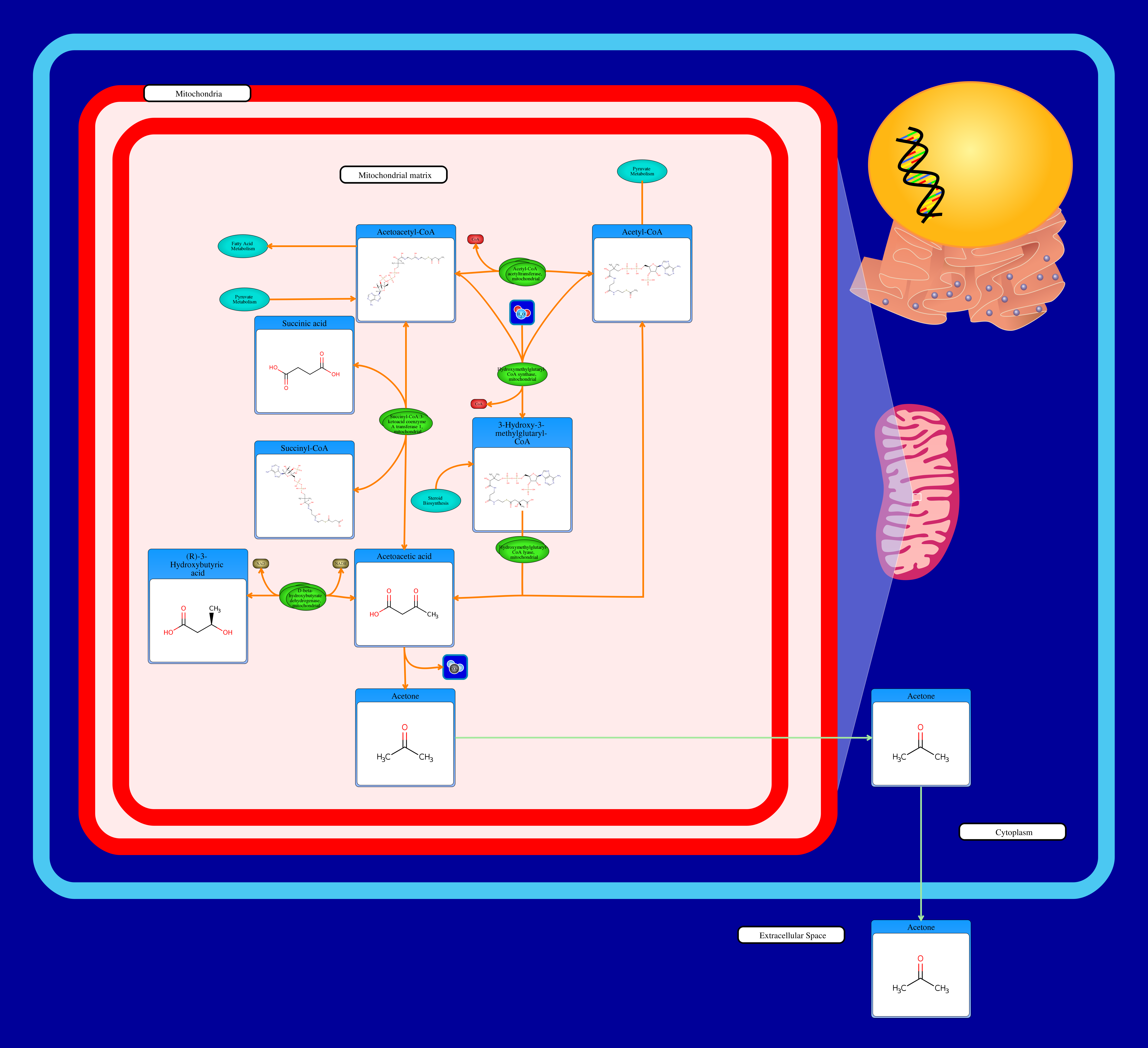 Ketone bodies are consisted of acetone, beta-hydroxybutyrate and acetoacetate. In liver cells' mitochondria, acetyl-CoA can synthesize acetoacetate and beta-hydroxybutyrate; and spontaneous decarboxylation of acetoacetate will form acetone. Metabolism of ketone body (also known as ketogenesis) contains several reactions. Acetoacetic acid (acetoacetate) will be catalyzed to form acetoacetyl-CoA irreversibly by 3-oxoacid CoA-transferase 1 that also coupled with interconversion of succinyl-CoA and succinic acid. Acetoacetic acid can also be catalyzed by mitochondrial D-beta-hydroxybutyrate dehydrogenase to form (R)-3-Hydroxybutyric acid with NADH. Ketogenesis occurs mostly during fasting and starvation. Stored fatty acids will be broken down and mobilized to produce large amount of acetyl-CoA for ketogenesis in liver, which can reduce the demand of glucose for other tissues. Acetone cannot be converted back to acetyl-CoA; therefore, they are either breathed out through the lungs or excreted in urine.